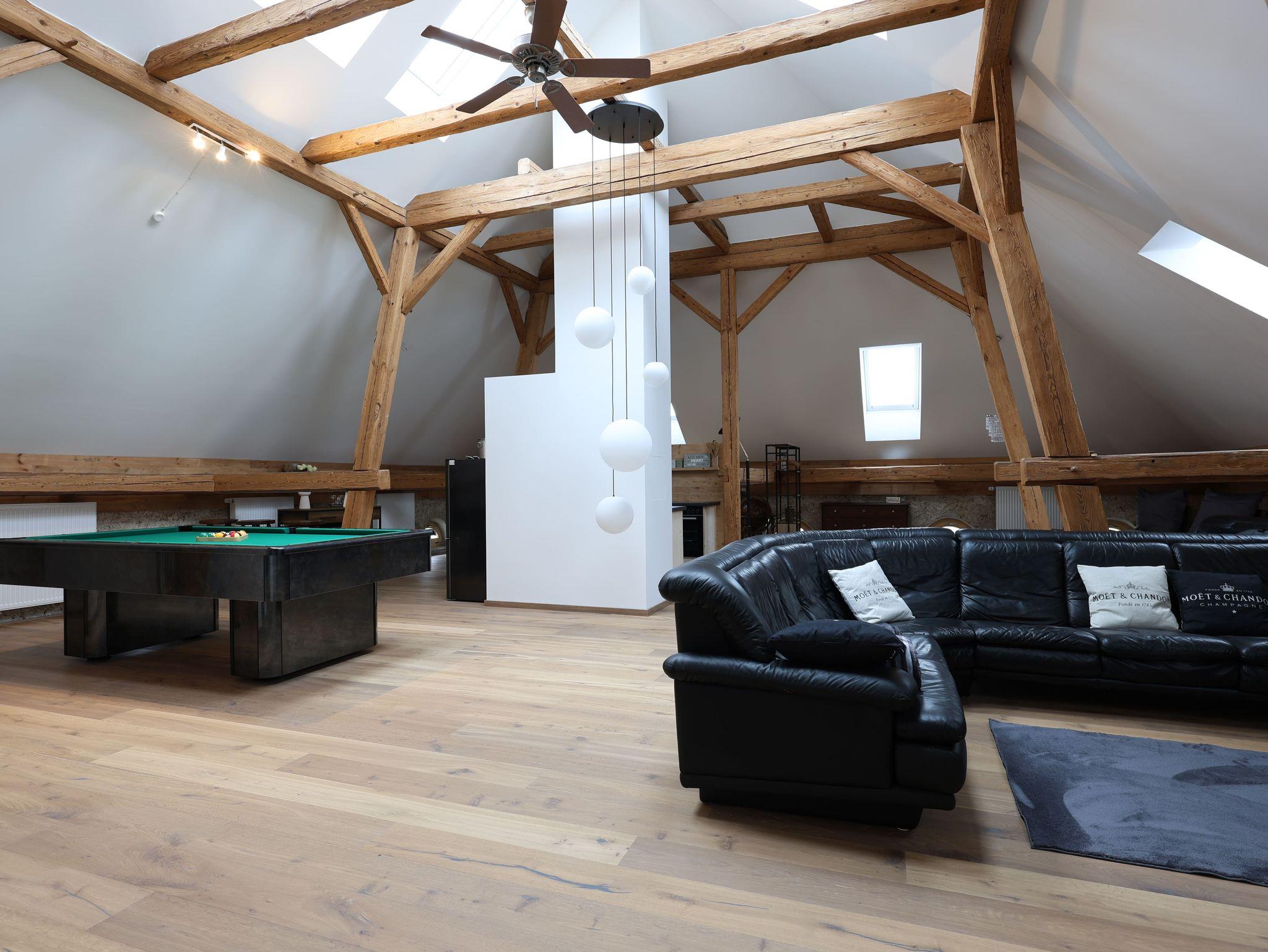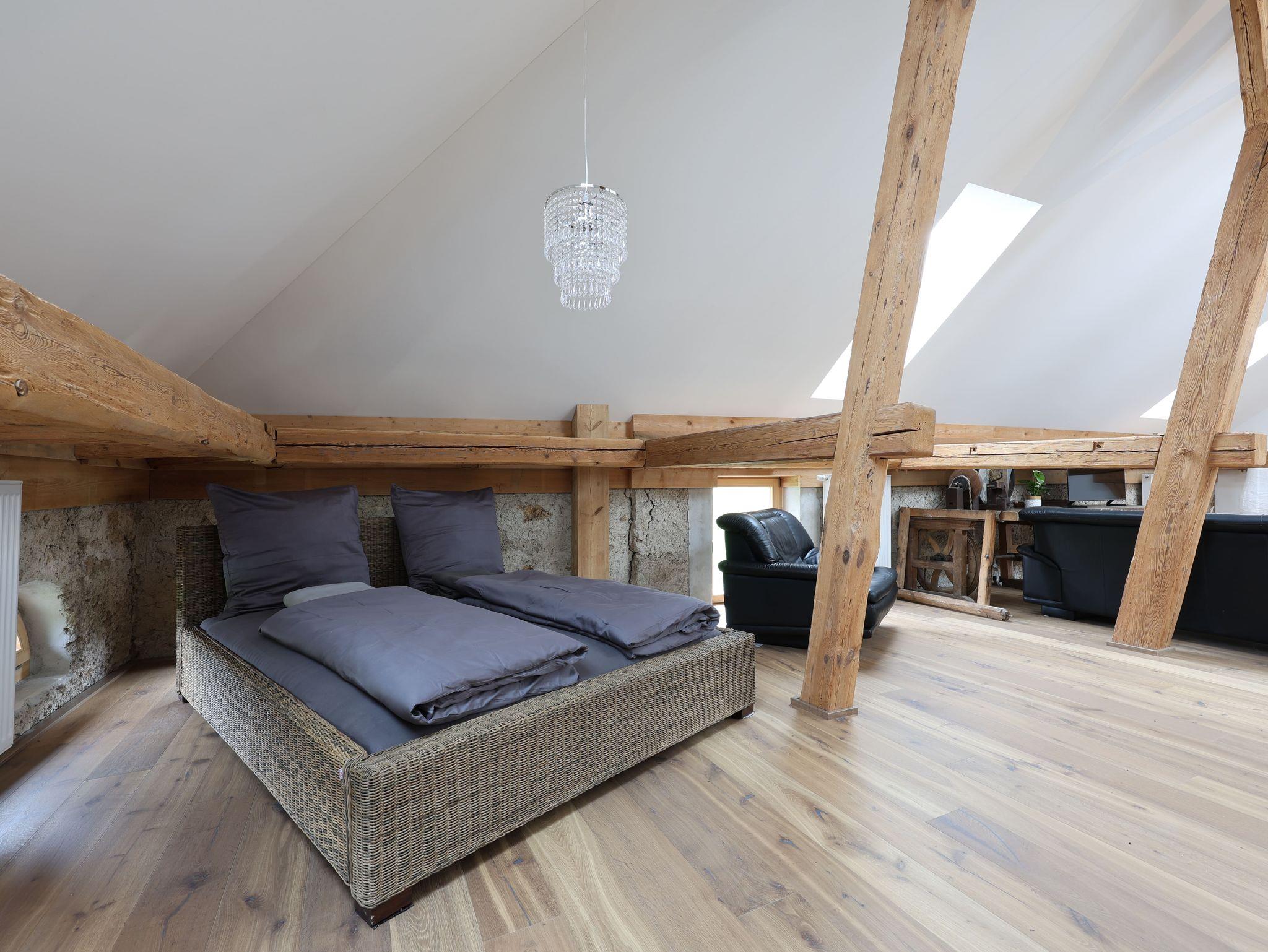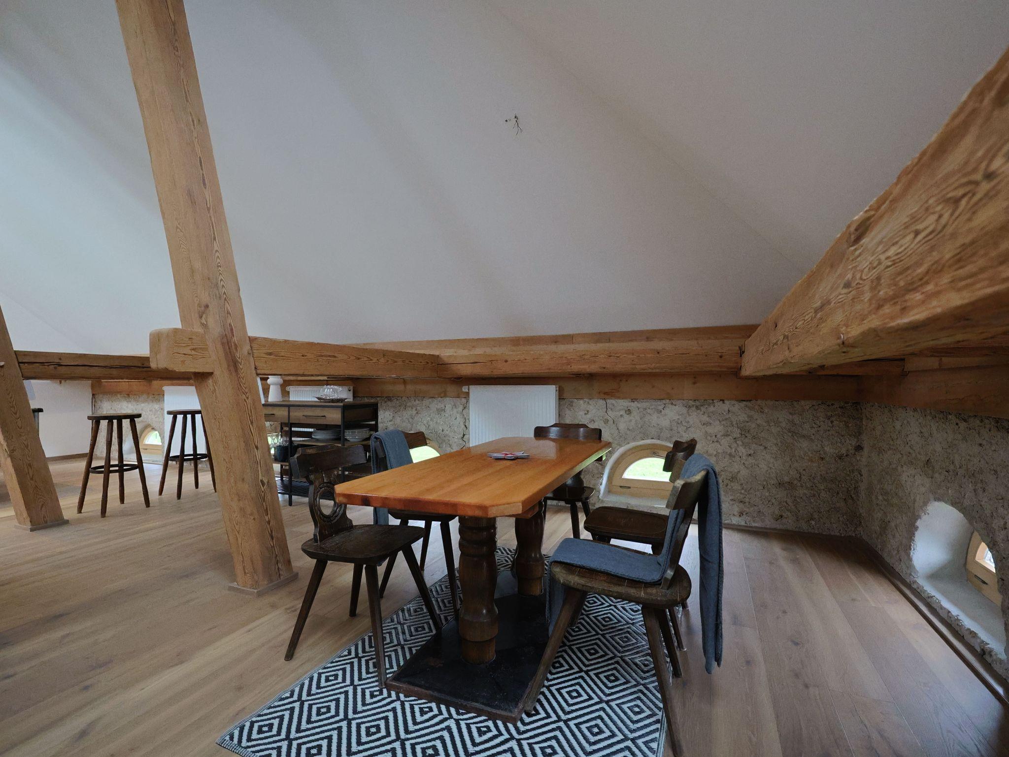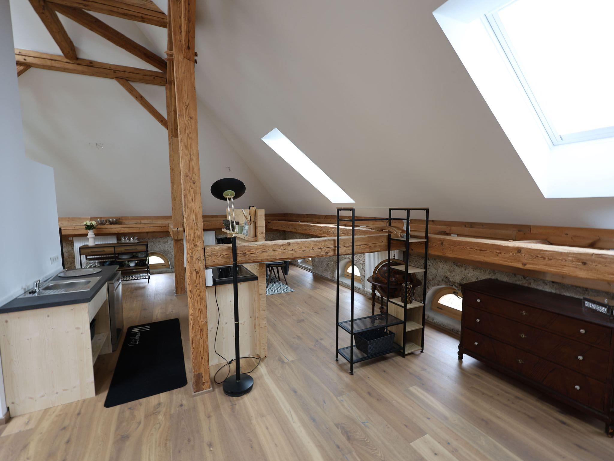Das stilvolle 140 m² große Burg-Loft im DG überzeugt mit einer einzigartigen Atmosphäre, die durch 8m hohe Balkendecken und ein Galeriefenster geprägt ist.
