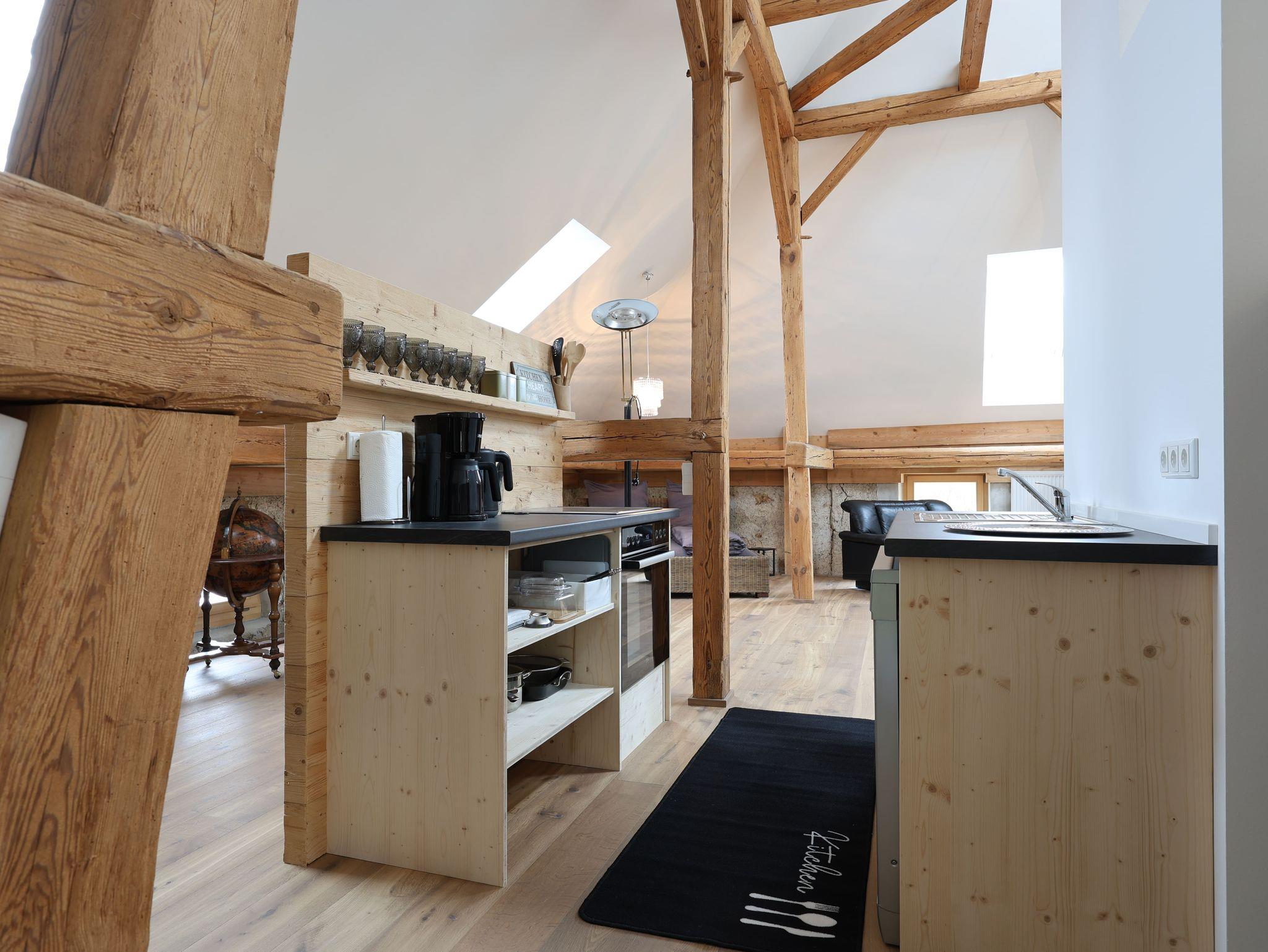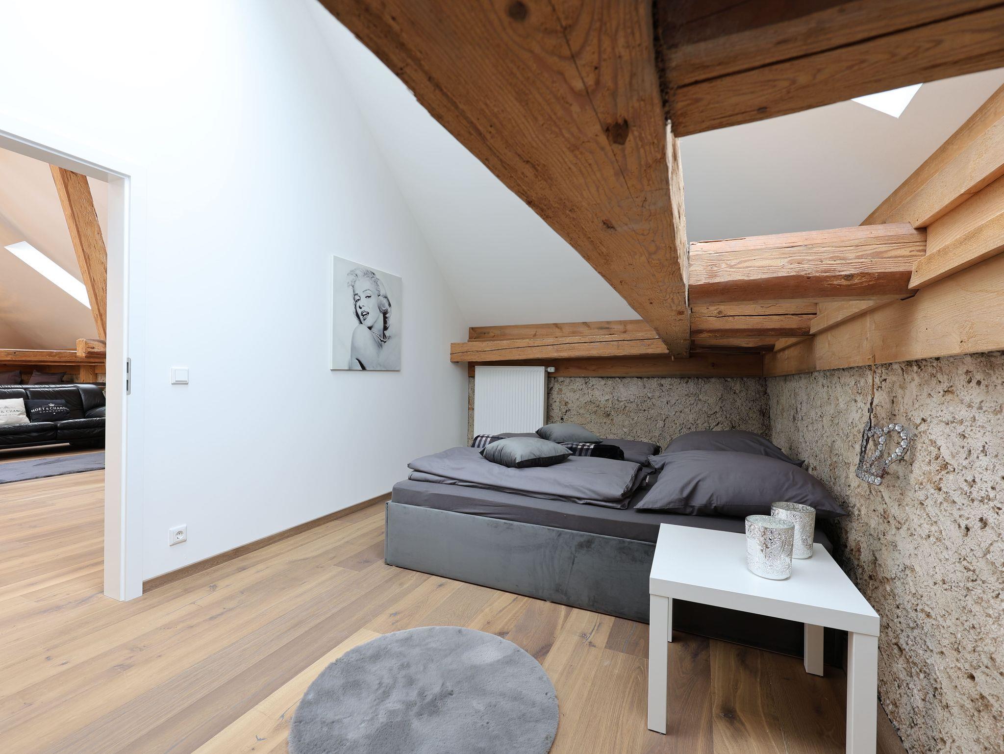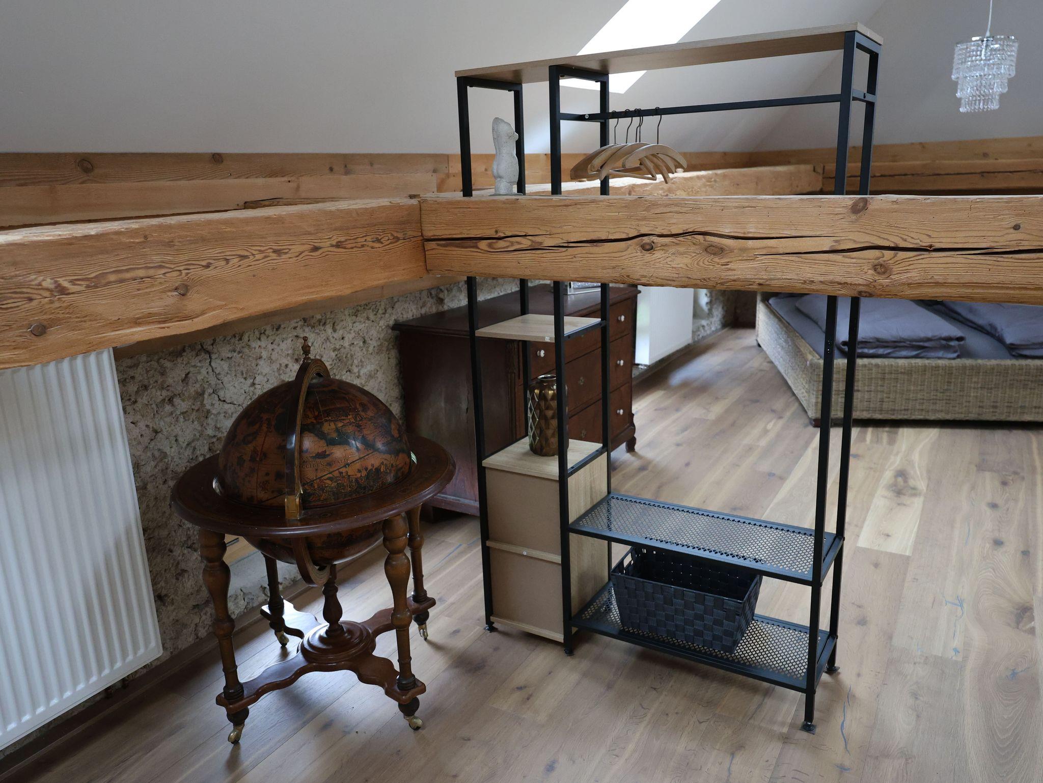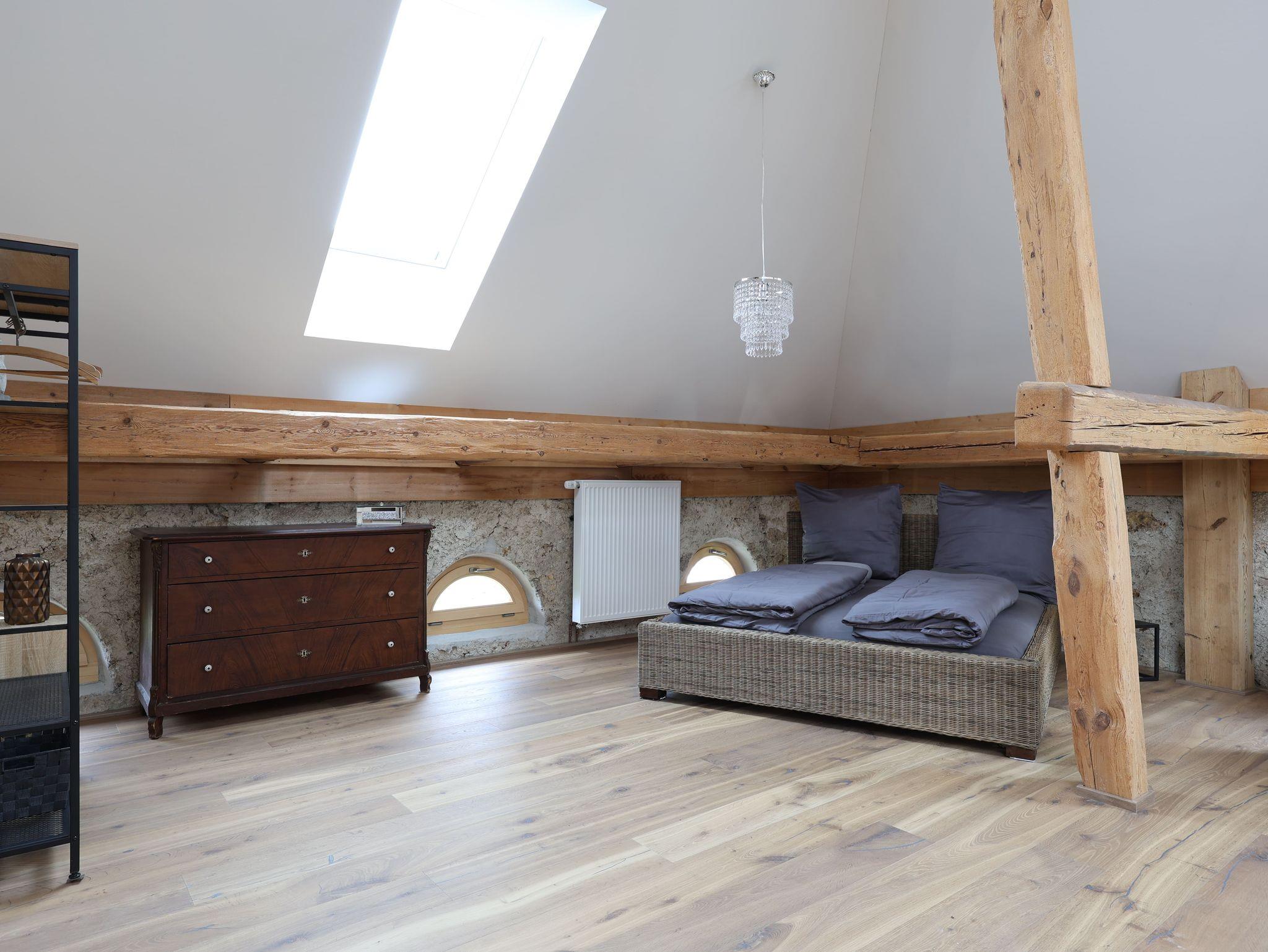 Das stilvolle 140 m² große Burg-Loft im DG überzeugt mit einer einzigartigen Atmosphäre, die durch 8m hohe Balkendecken und ein Galeriefenster geprägt ist.