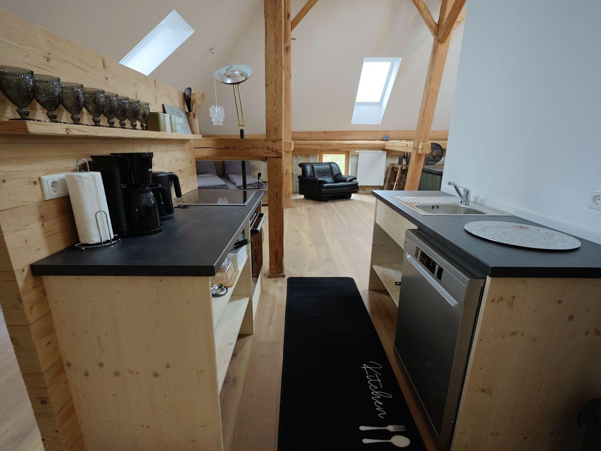 Es verfügt über eine voll ausgestattete Küche, einen gemütlichen Ess- und Wohnbereich, ein Schlafzimmer mit Flachbett und ein exklusives Rattan-Bett. Ein modernes Bad, eine Garderobe und ein Billardtisch runden das Loft ab und sorgen für ein besonderes Urlaubserlebnis.