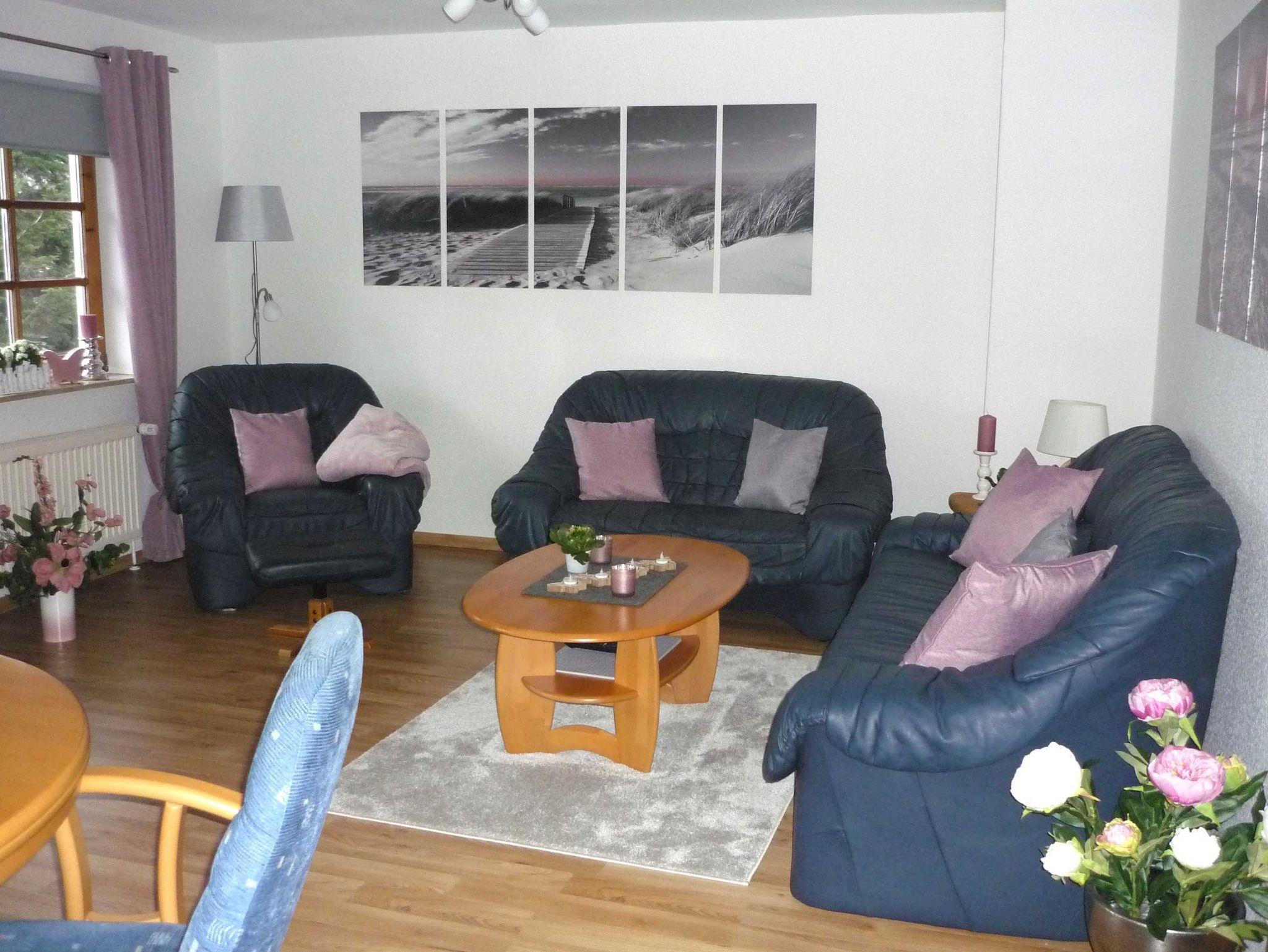Die gemütliche Wohnung im Obergeschoss hat zwei Schlafzimmer: ein Schlafzimmer mit einem großen Doppeltbett und Platz für ein Kinderbett (vorhanden) und ein Schlafzimmer mit einem Einzelbett, TV und Sofa plus Sofatisch. Das Sofa kann als Schlafsofa genutzt werden. Das Wohnzimmer hat eine Sofaecke mit 3-Sitzer, 2-Sitzer und einem Sessel sowie einen Esstisch. Die Küche hat ebenso einen Essbereich uns ist bestens ausgestattet mit Geschirrspüler, Mikrowelle und allem Zubehör für das Zubereiten einer leckeren Urlaubsküche. Das Tageslichtbad hat eine Dusche. Den Gästen steht ein PKW-Stellplatz im Carport und ein Grill im Garten zur Verfügung.