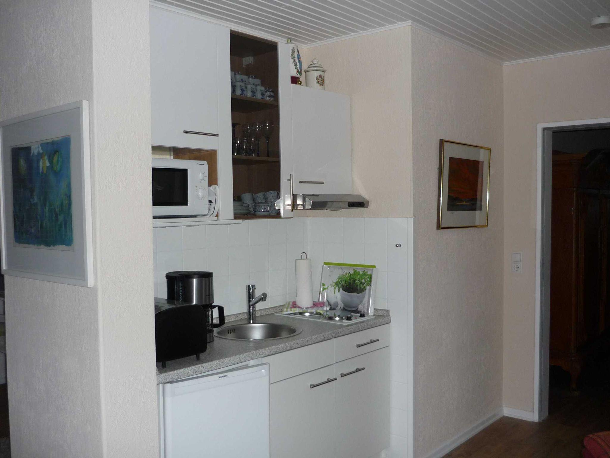 Im Appartment 1 (mit separater Küche) erwartet Sie ein Schlafzimmer mit Doppelbett, TV und Sitzecke. Das Duschbad mit Tageslicht ist direkt vom Schlafzimmer aus begehbar. Die Küche ist bestens ausgestattet mit Wasserkocher, Kaffeemaschine, Kühlschrank, Herd und Backofen sowie einer Mirkowelle und einem Esstisch für zwei Personen.