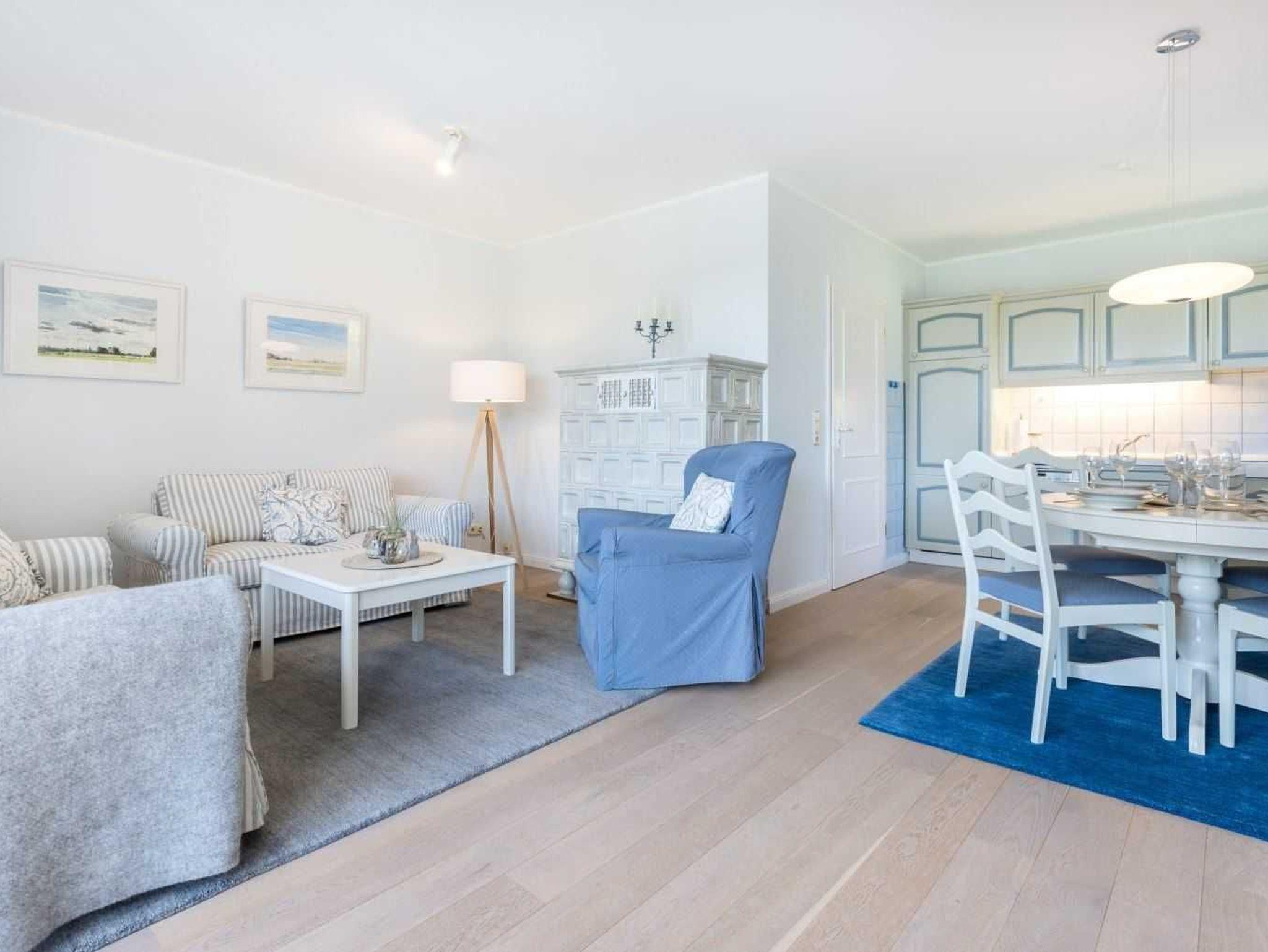 Wohnzimmer mit zwei Sofas, einem Sessel, SMART-TV (SAT), Kachelofen und Esstisch mit vier Stühlen. Offene Küche mit Induktionsherd, Backofen mit integrierter Mikrowelle, Geschirrspüler, Kühlschrank mit Gefrierfach, Internet-Radio, Krups Nespresso Kaffee-Kapselmaschine und einer kleinen Anrichte zum Wohnbereich. Direkter Zugang zur sonnigen Gartenterrasse (halboffener Wintergarten) nach Süden.