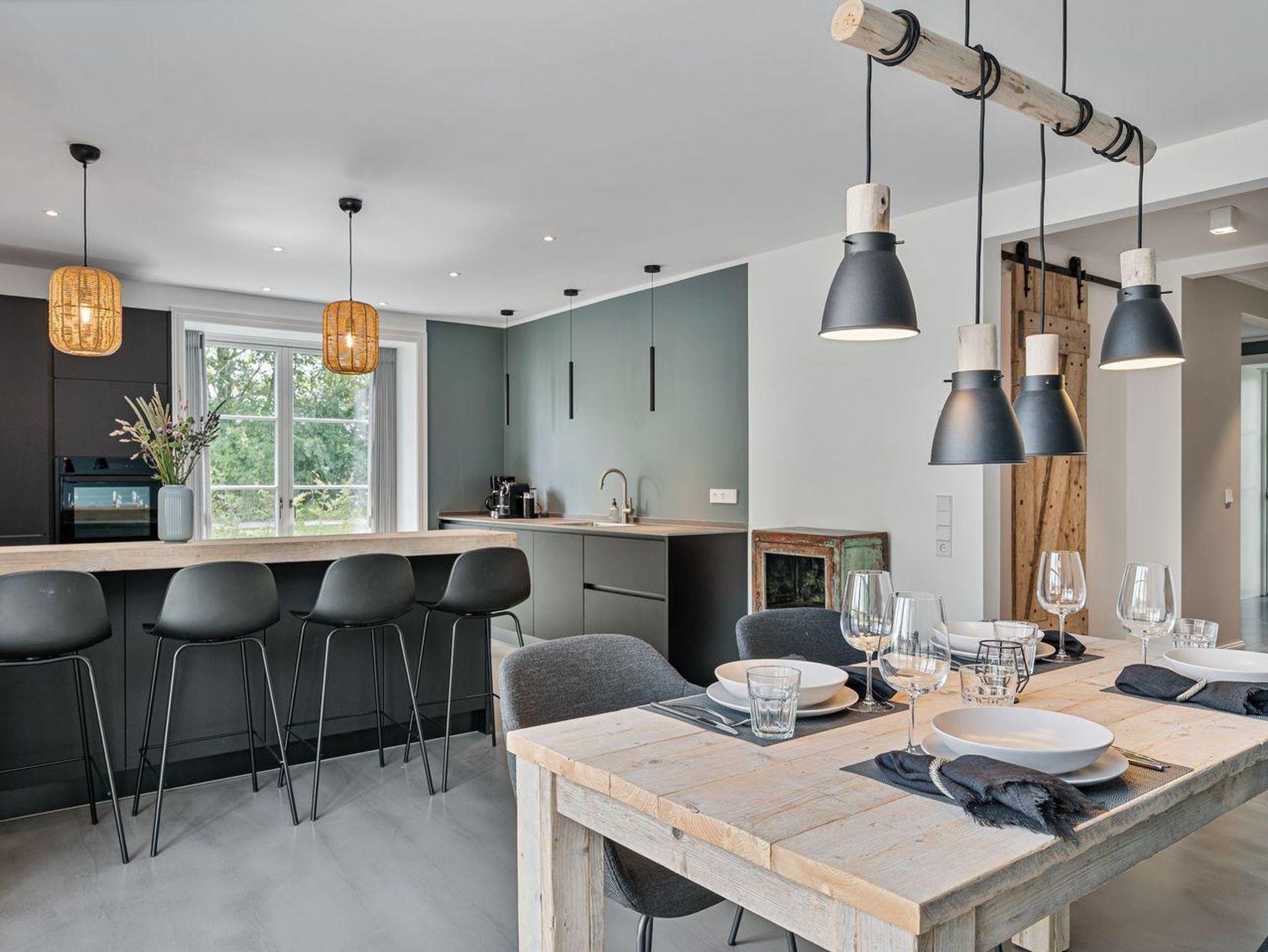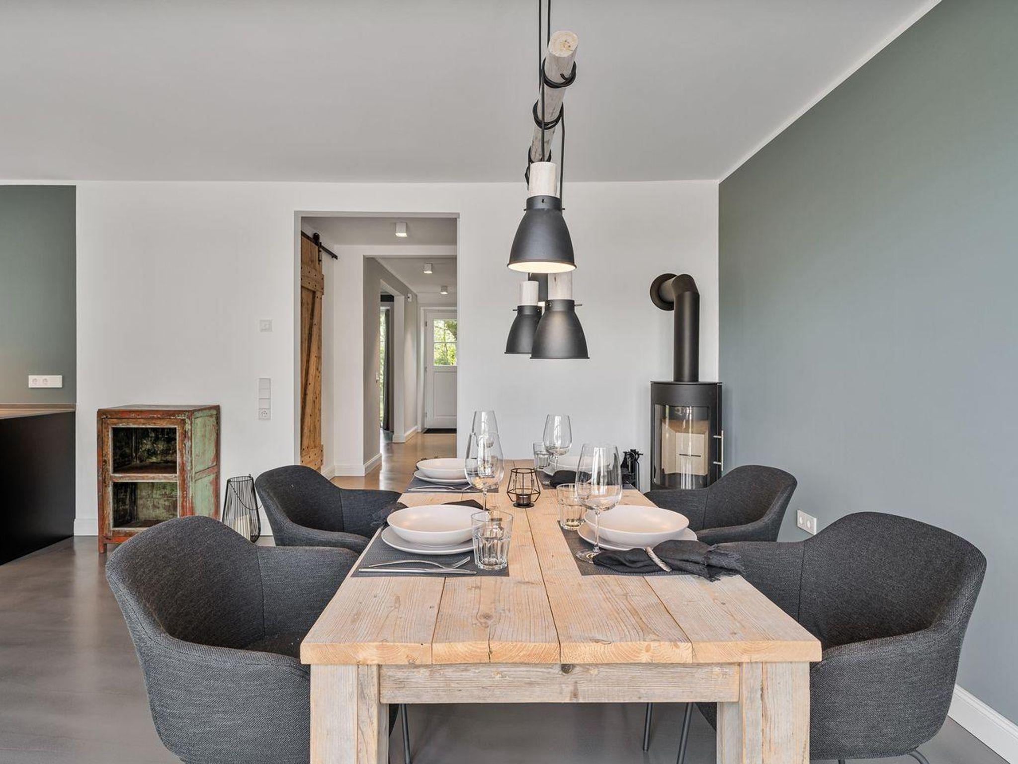 Im Erdgeschoss befindet sich der lichtdurchflutete Wohnraum mit TV, einer großen offenen Küche sowie einem stilvollen Essbereich mit Kamin. Die Wohnräume sind mit exklusiven Möbeln ausgestattet. Die Küche verfügt über hochwertige Elektrogeräte. An den Wohnbereich schließen sich ein Duschbad mit Sauna, ein Hauswirtschaftsraum und ein geräumiger Flur sowie eine Gäste WC an.
