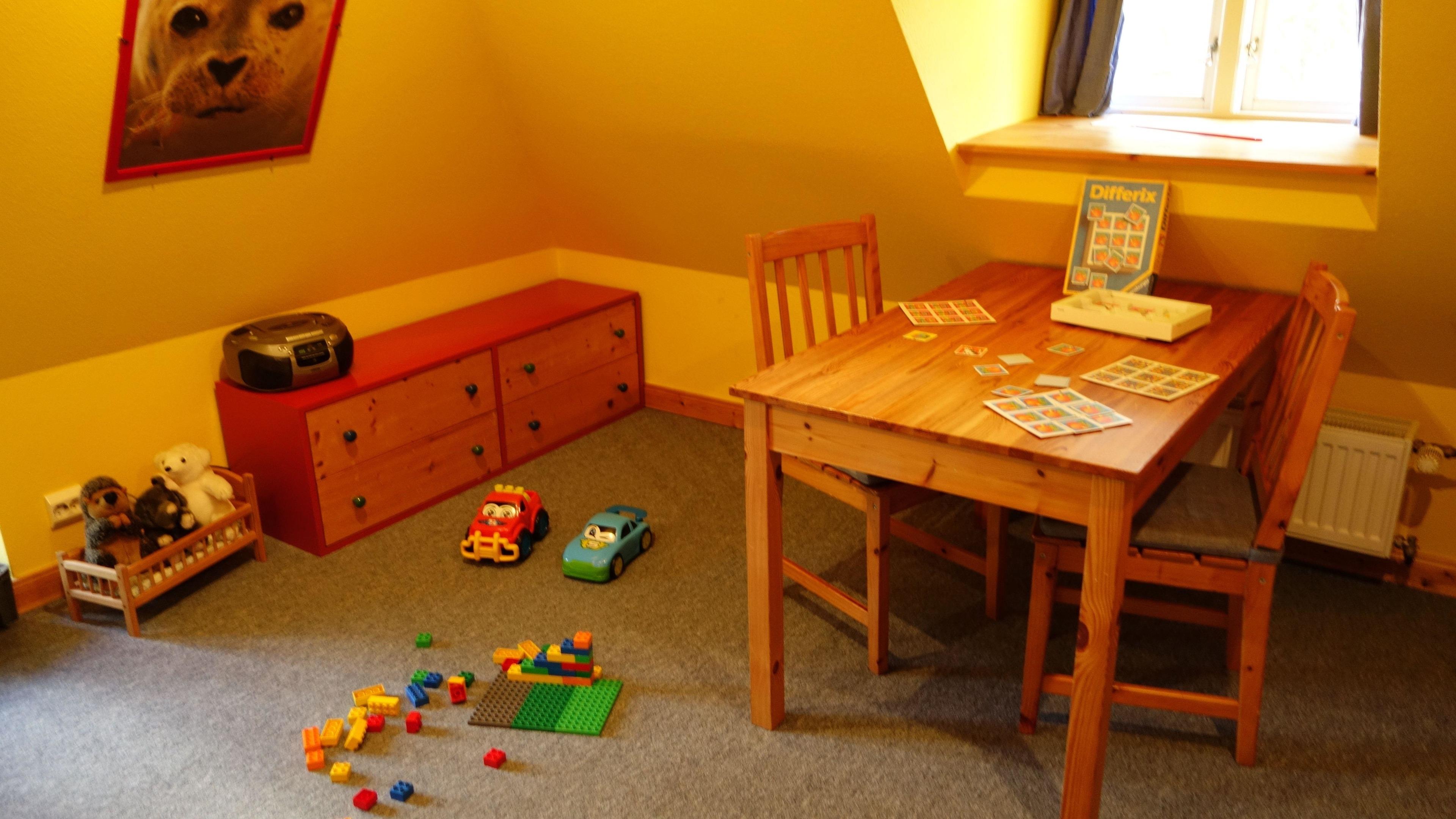 Essplatz. Das Küchenzubehör und Besteck ist für 5 Personen vorhanden. Im Anschluss daran liegt der Wohnbereich mit Sofa, Couchtisch, zwei Rattanstühlen und dem großen Essbereich. Ein besonderes Plus ist der Kaminofen. Sie haben von hier einen direkten Zugang zur möblierten Terrasse (rechte Hälfte - siehe Foto) , sowie dem 1800 qm großen Garten mit Schaukel, Sandkiste und Trampolin. Weiter befindet sich im EG das Elternschlafzimmer mit einem Doppelbett (Platz für ein Kinderreisebett ist vorhanden). Auch das Duschbad befindet sich im Erdgeschoss. Im Dachgeschoss liegt das Kinderzimmer mit einem Etagenbett und einem Einzelbett. Es befindet sich zusätzlich ein Tisch mit Stühlen im Zimmer zum Spielen, Malen u.a..