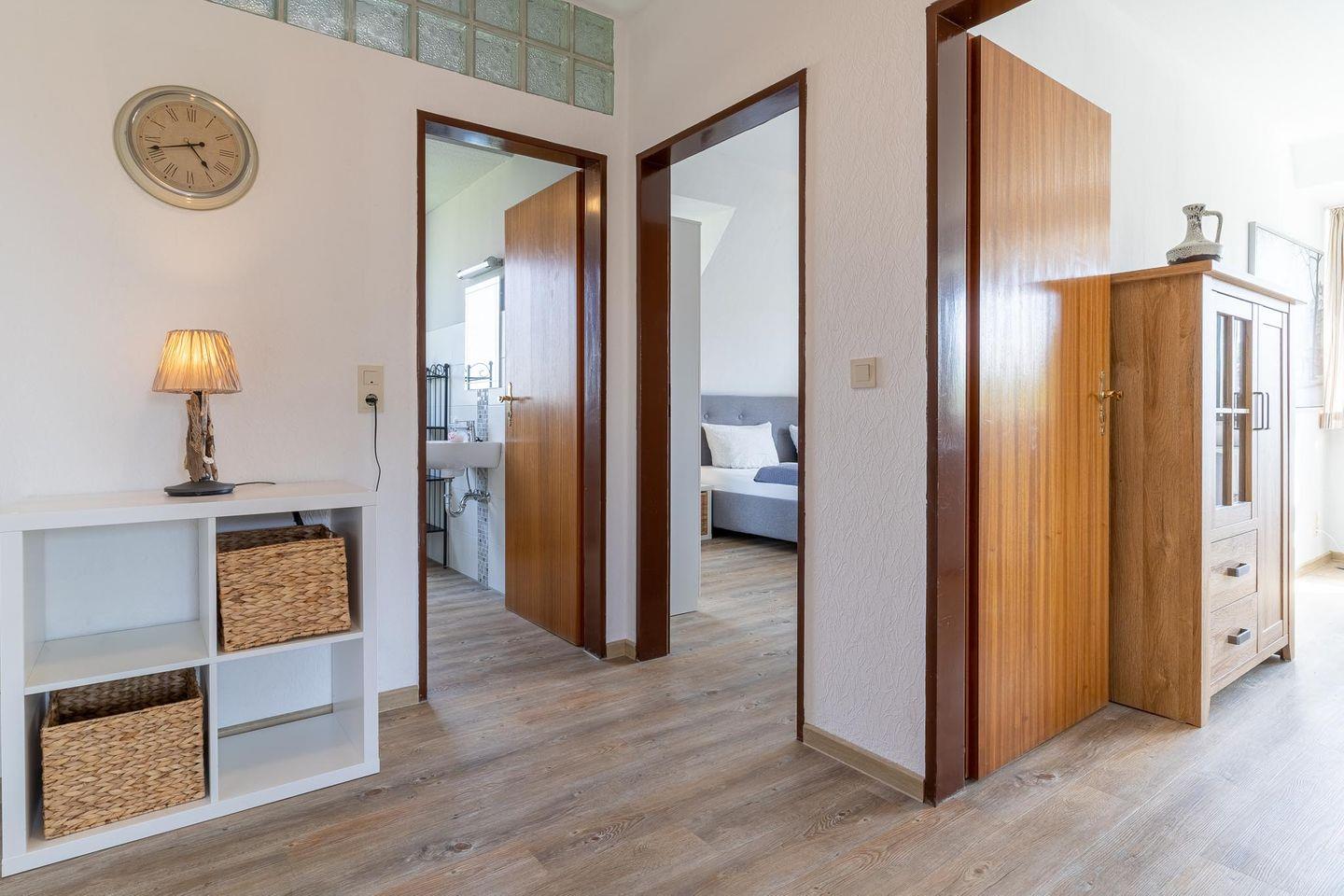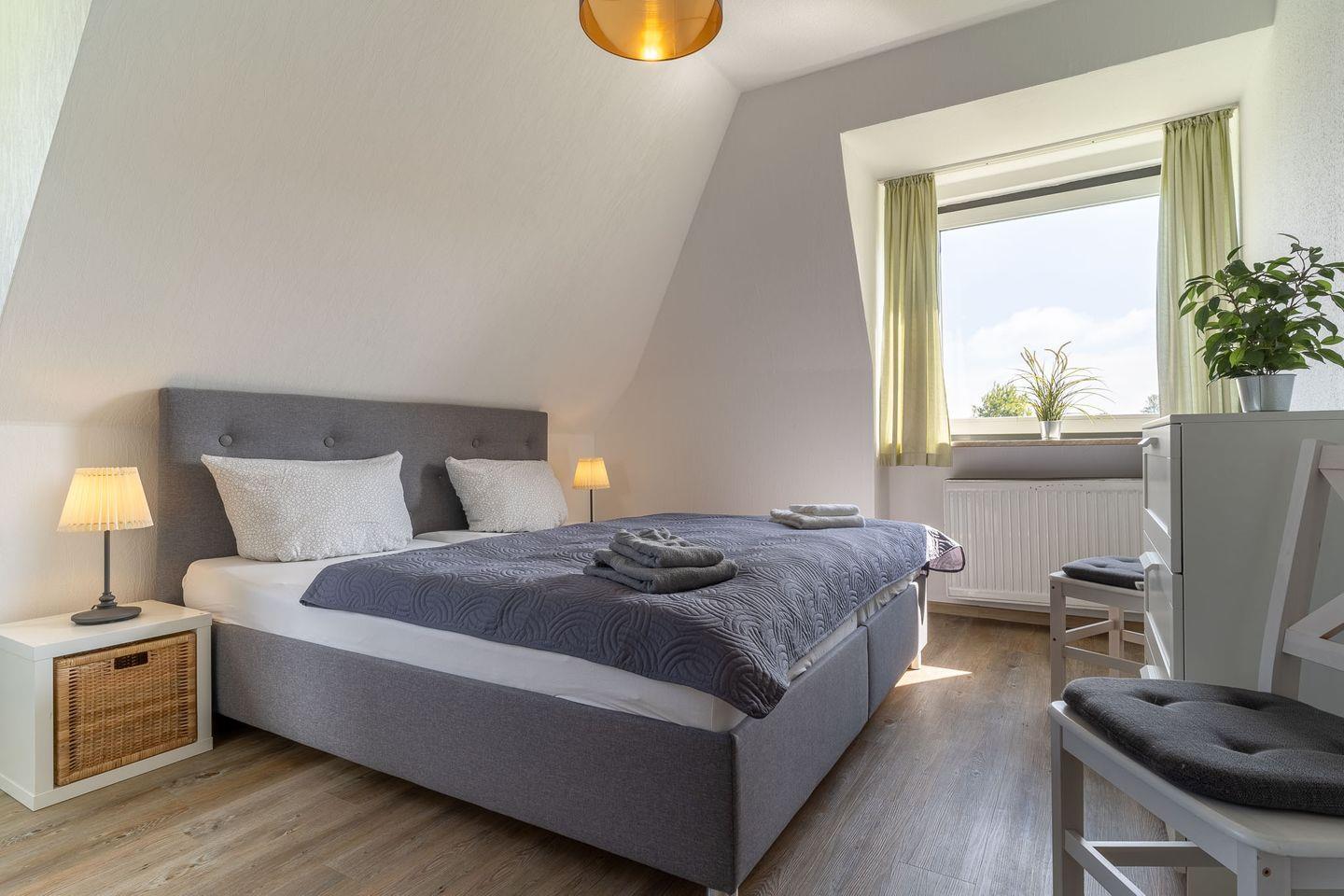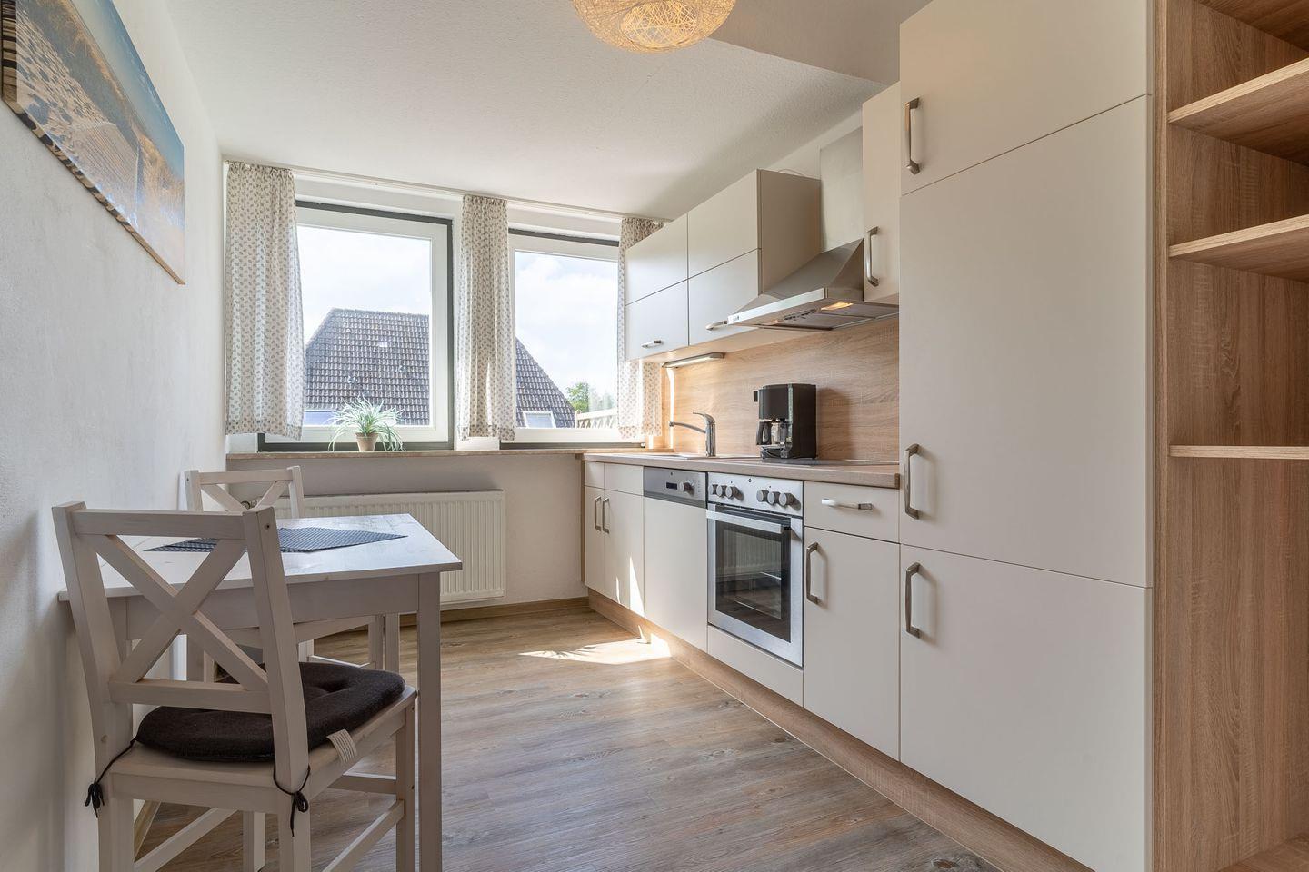 Die 2-Zimmer Wohnung befindet sich im 1. OG eines Einfamilienhauses in einem ruhigen Wohngebiet in Tating. Mit dem Auto erreichen Sie in nur 5 Minuten den Strand von St.Peter-Ording. Vom Flur gelangen Sie in die einzelnen Räume. Die Küche ist komplett ausgestattet mit einem Herd, Backofen, Kühlschrank und allen Utensilien zur Selbstversorgung. Im Wohnraum haben Sie ein Schlafsofa und den Zugang zum Balkon. Das Schlafzimmer hat ein Doppelbett und es gibt ein Duschbad.