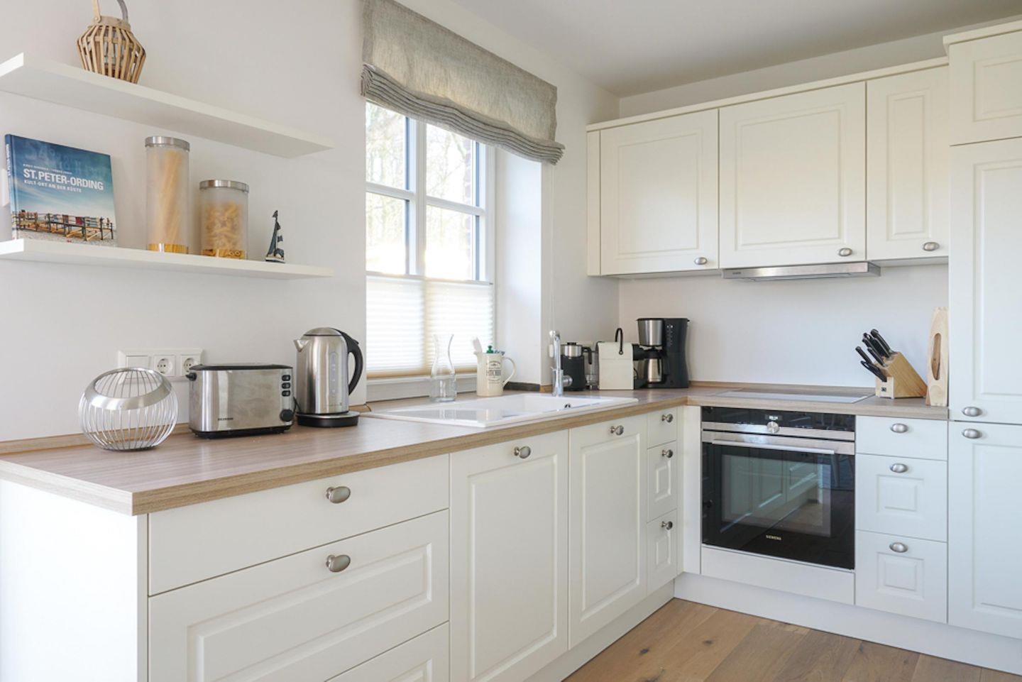 Im Erdgeschoss befindet sich der lichtdurchflutete Wohnraum mit TV, Apple TV, kleine Musikanlage mit Dockingstation für iPhone, Kaminofen, einer offenen Küche sowie einem stilvollen hellen Essbereich mit Blick auf die Düne. Die Wohnräume sind mit exklusiven Möbeln ausgestattet. Die Küche verfügt über hochwertige Elektrogeräte und lässt von der Nespressomaschine über ein Waffeleisen bis zur Salatschleuder keinen Wunsch offen. An den Wohnbereich schließen sich ein Flur mit eingebauter Garderobe, ein Hauswirtschaftsraum mit Waschmaschine und Trockner und ein Duschbad an. Das gesamte Erdgeschoss verfügt über ein hochwertiges weiß gekalktes Eichenparkett, welches über Fußbodenheizung beheizt werden kann.