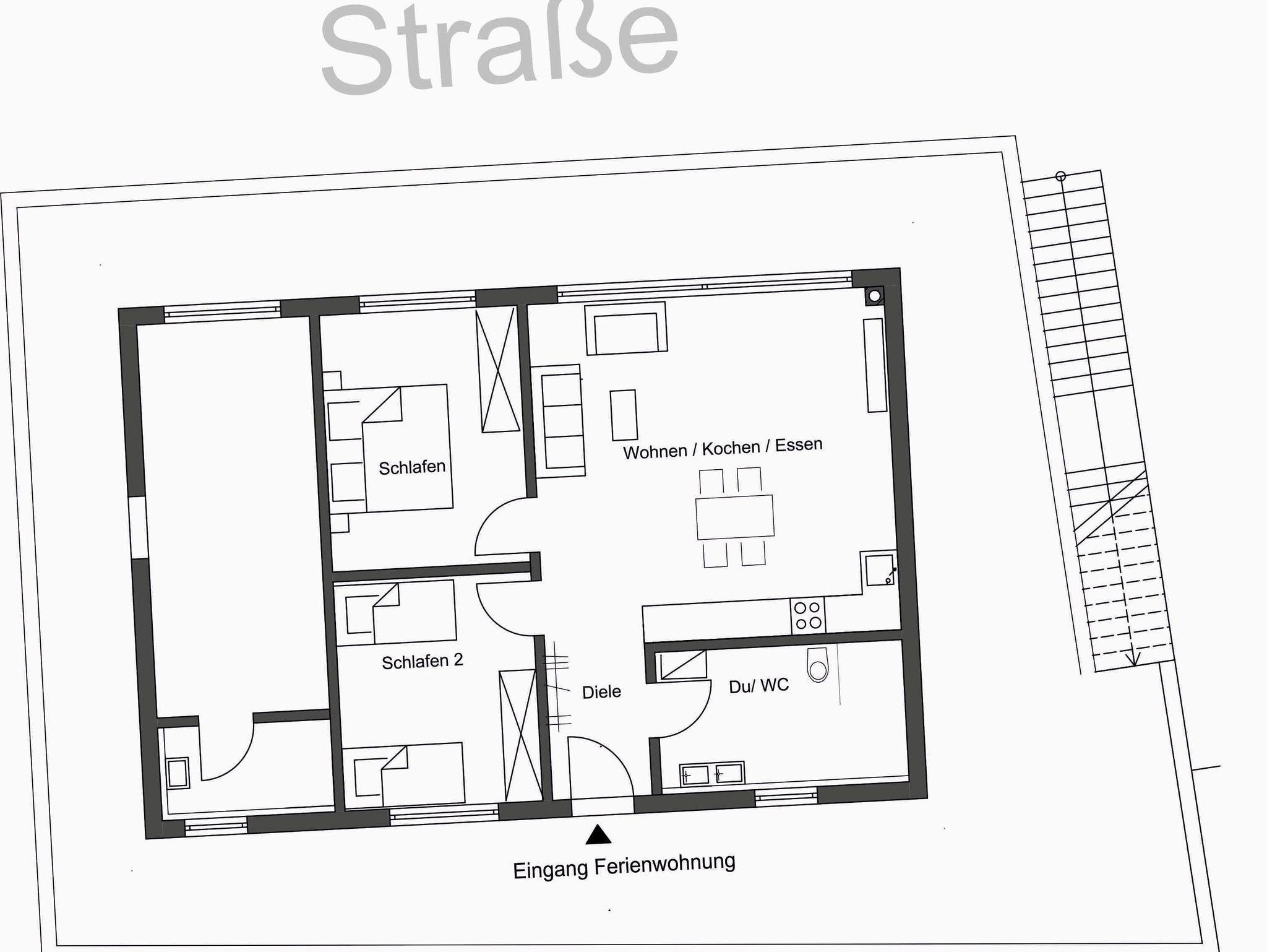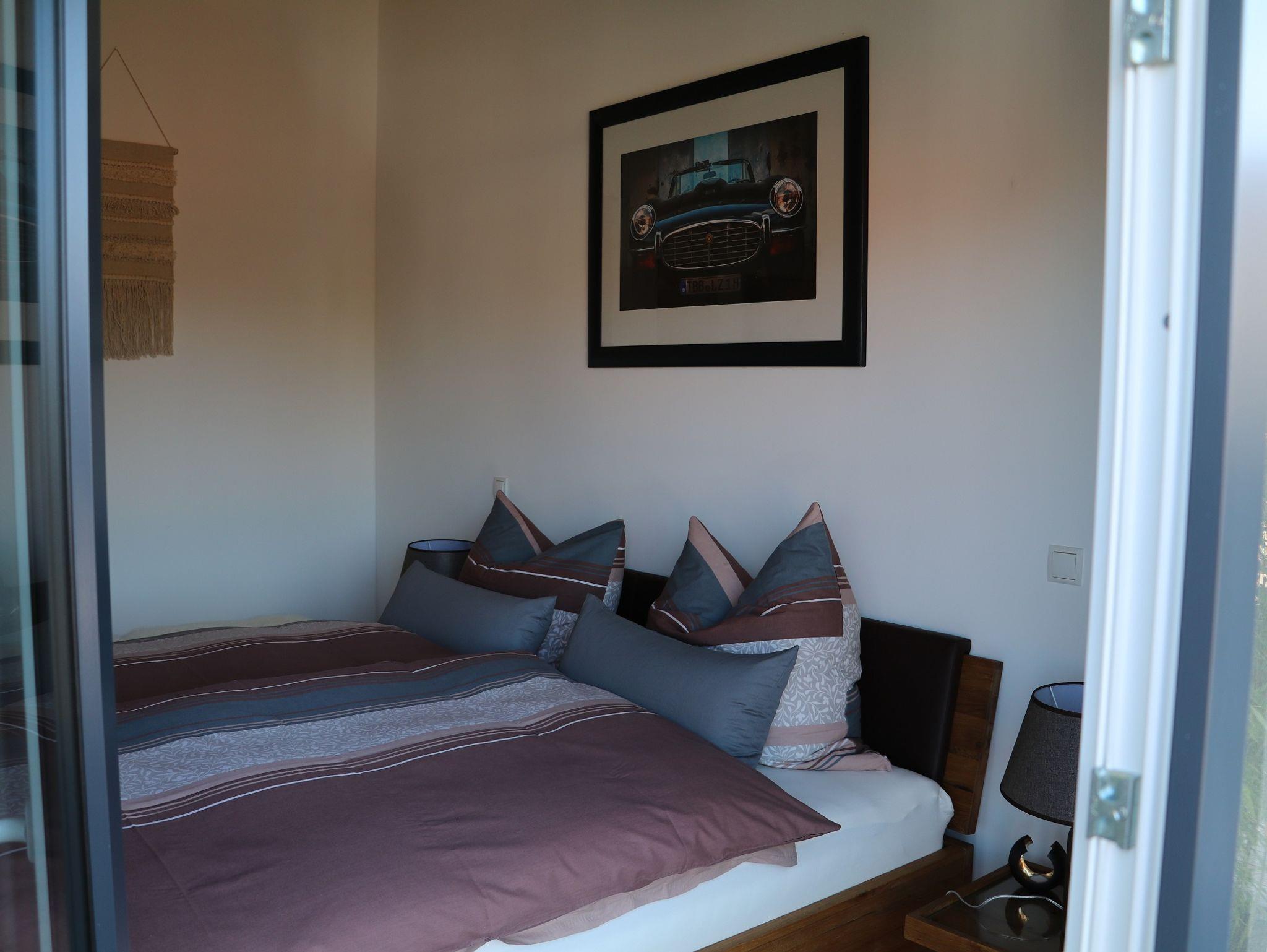 Im Hauptschlafzimmer (Flügeltüren zur Terrasse) finden Sie ein 180x200cm großes Doppelbett und im Nebenschlafzimmer zwei Einzelbetten mit je 90x200cm Liegefläche (auch als Doppelbett nutzbar). Alle Betten sind bezogen und mit zusätzlichen Kissen und extra großen Bettdecken ausgestattet.