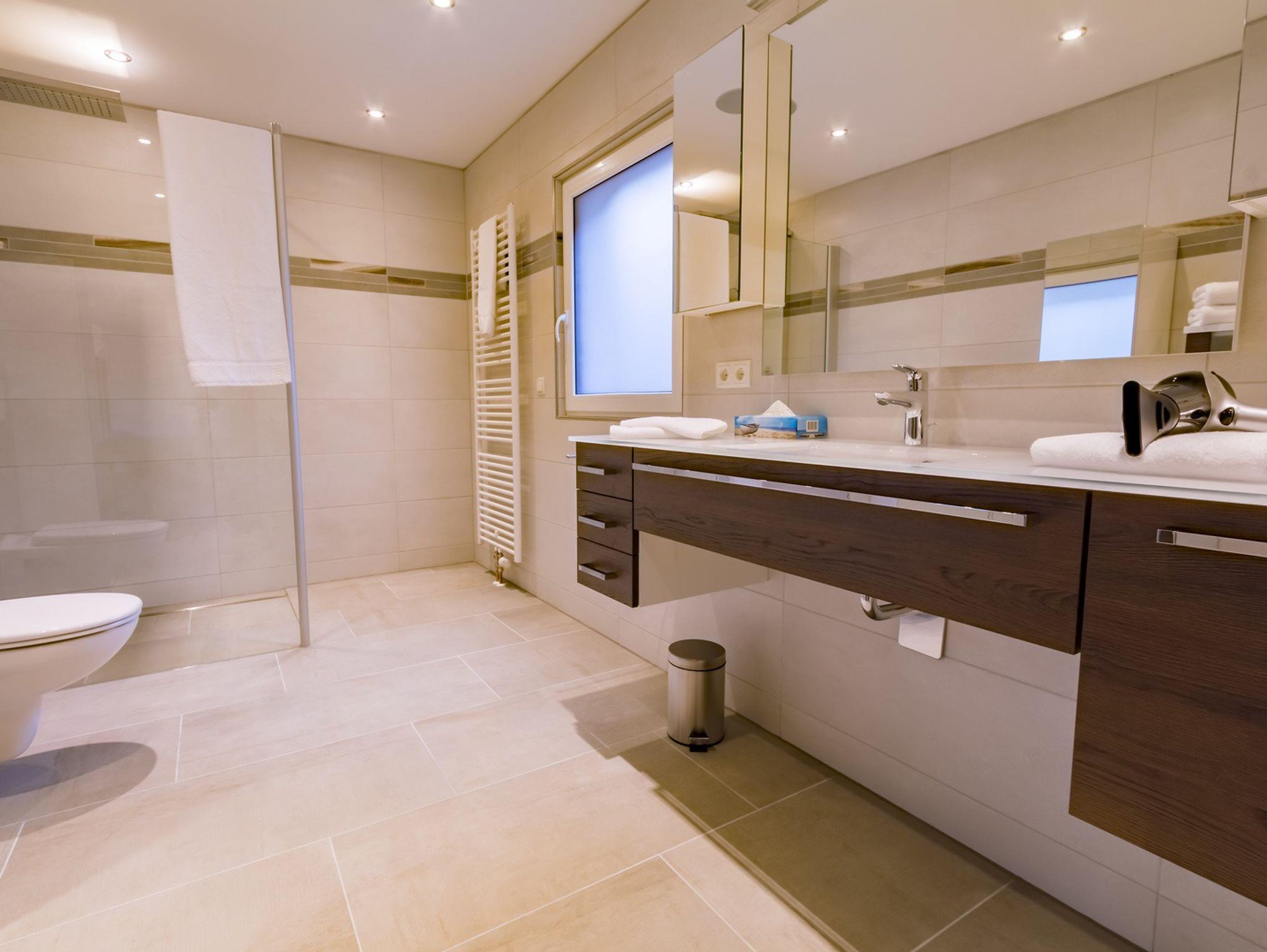 Das geräumige Badezimmer bietet eine Wellness-Dusche mit Duschpaneel und reichlich Handtücher sowie Bademäntel.