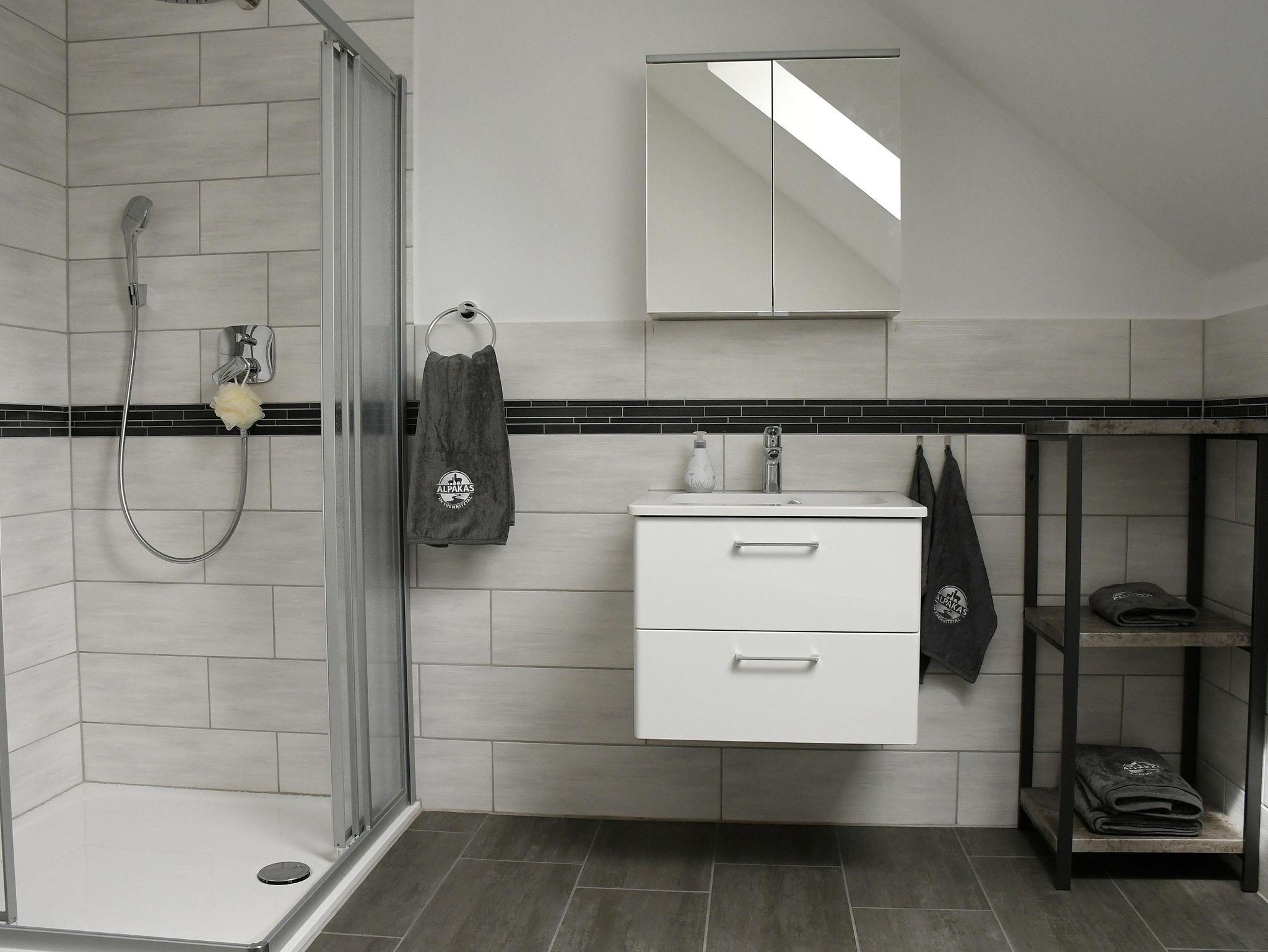 Jedes Schlafzimmer ist jeweils mit einem komfortablen Doppelbett 180x200cm und einem Flachbildfernseher ausgestattet. Es erwarten Sie Alpaka-Steppbetten, die einen erholsamen Schlaf garantieren. In jedem Raum befindet sich eine Fußbodenheizung. Der Wohnraum mit offener Küche bietet aufgrund der großen Fensterflächen einen tollen Ausblick auf die Weide. Die große bequeme Couch ist ausziehbar und somit auch als Schlafcouch nutzbar. Ein großer Flachbildfernseher ( Satelliten-Empfang ) befindet sich ebenfalls im Raum. Die moderne Einbauküche ist voll ausgestattet mit einer Kühl-Gefrierkombination, Induktions-Kochfeld, Backofen, Mikrowelle, Spülmaschine (Siemens), Kaffeemaschine, Toaster und Wasserkocher. Geschirr, Besteck, Töpfe, Pfannen, Gläser etc. sind ausreichend vorhanden. Das Tageslichtbad mit einer Eckbadewanne, Dusche mit großer Regenduschbrause, Waschbecken, WC und einem Spiegelschrank mit Föhn rundet das Gesamtbild ab. Die 50m² große Holzterrasse mit unverbautem Weitblick auf die Alpakas und ins Chemnitztal lädt zum Verweilen ein. Die Terrasse ist für den perfekten Sonnenuntergang südwestlich ausgerichtet. Sie können hier auf den Sonnenliegen und rustikalen Holzsitzmöbeln entspannen. Bitte beachten Sie, dass die Wohnungen für Rollstuhlfahrer nicht geeignet sind (Treppenaufgang). Handtücher, Bettwäsche und Geschirrtücher sind inklusive. Das WLAN sowie der Parkplatz sind kostenfrei.