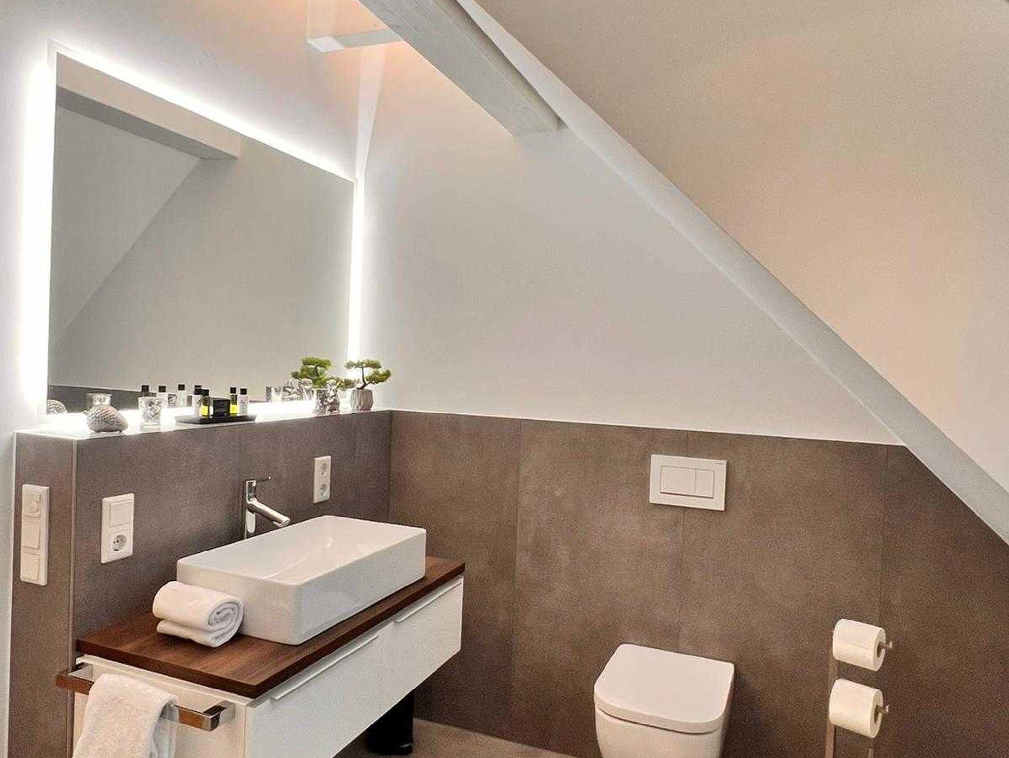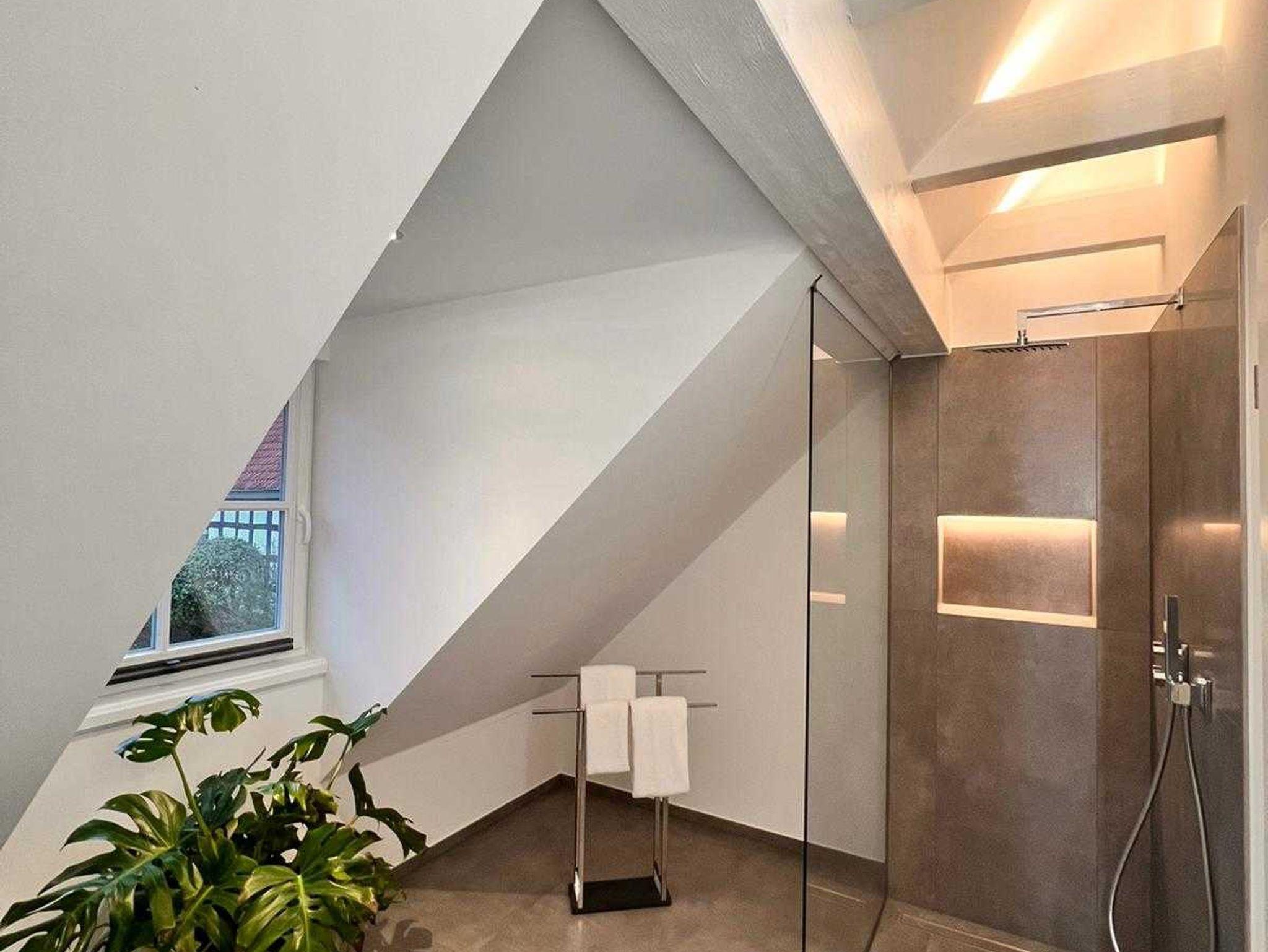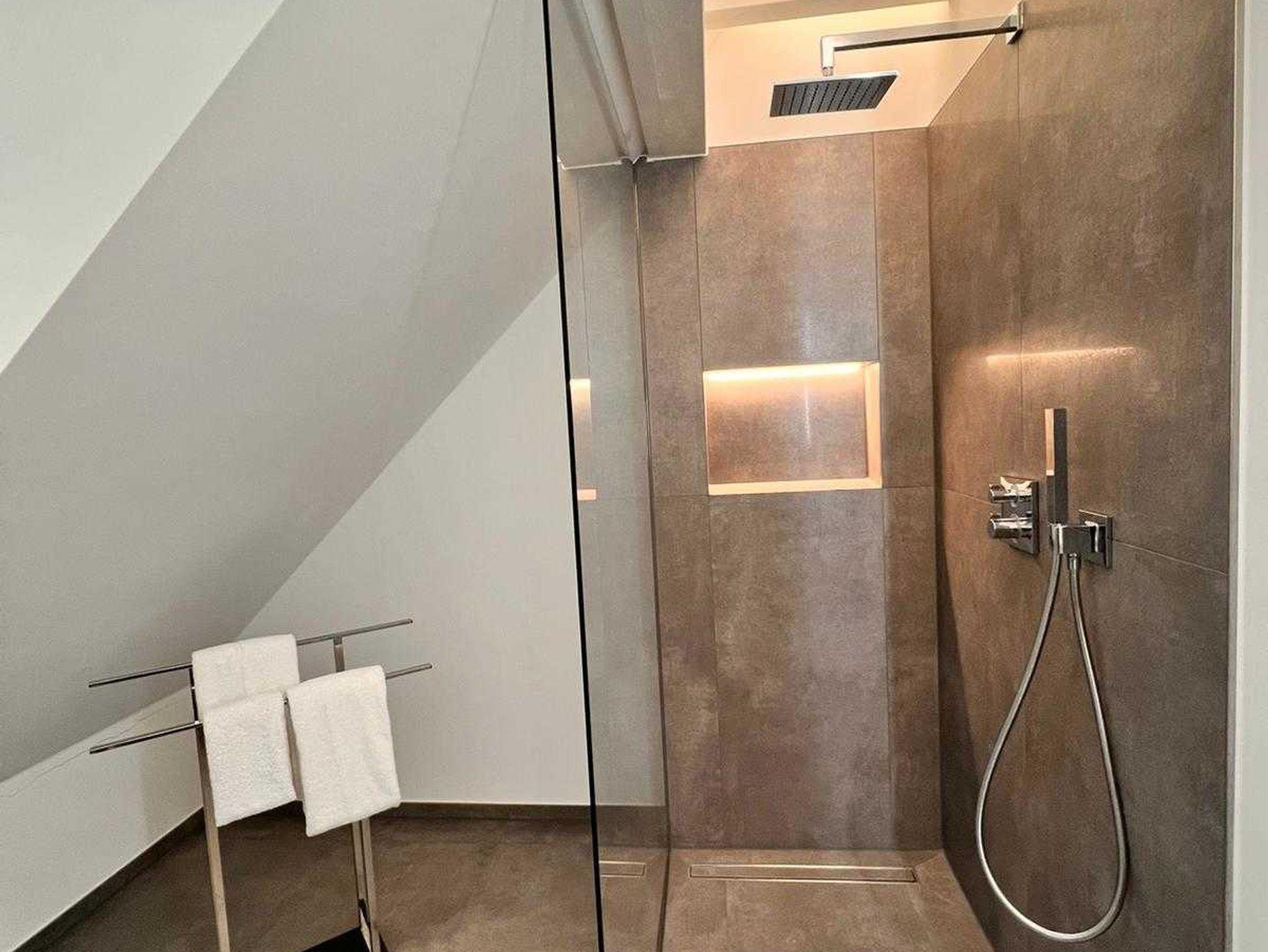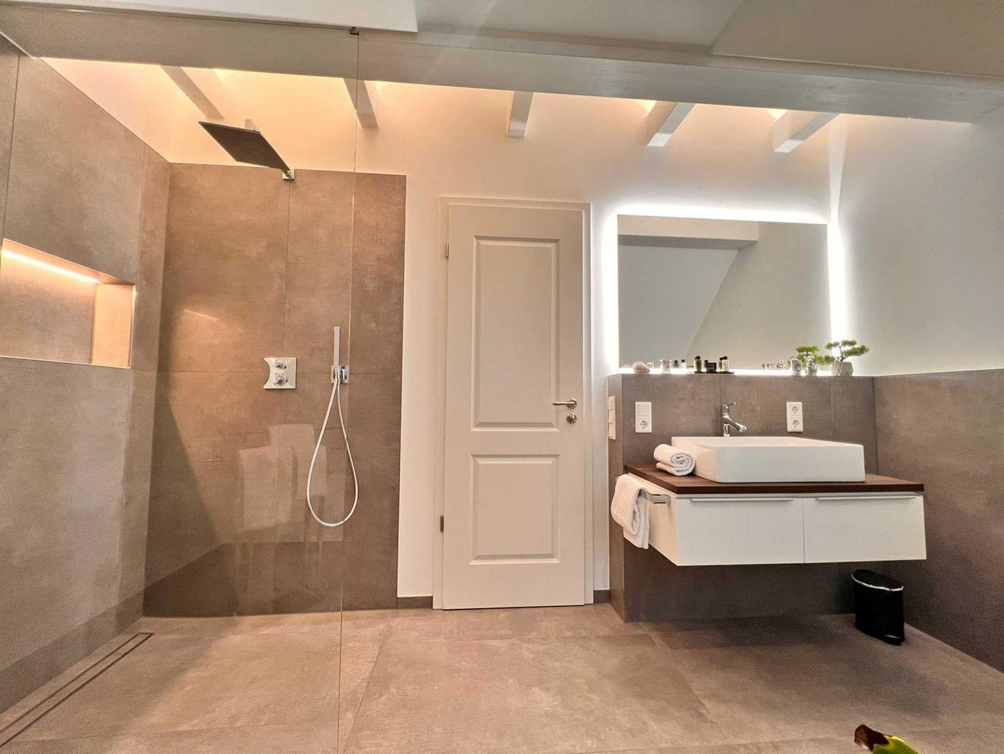Badezimmer mit großer ebenerdiger Dusche.Es verfügt über eine Klimaanlage. In der kalten Jahreszeit sorgt die Fußbodenheizung für ein behagliches Raumklima.