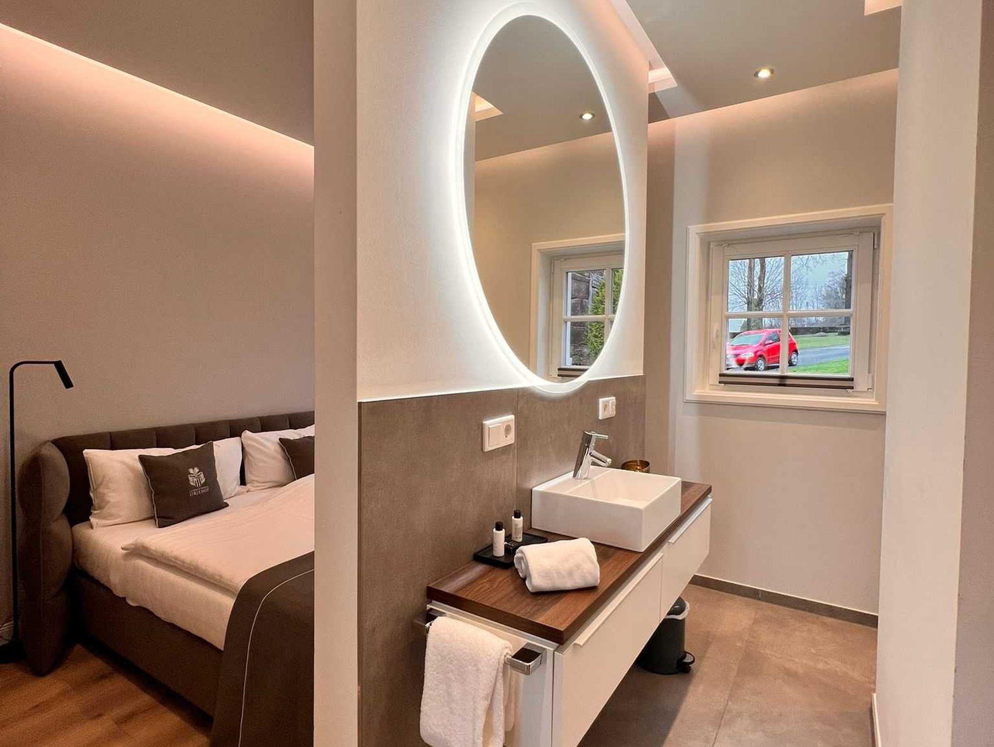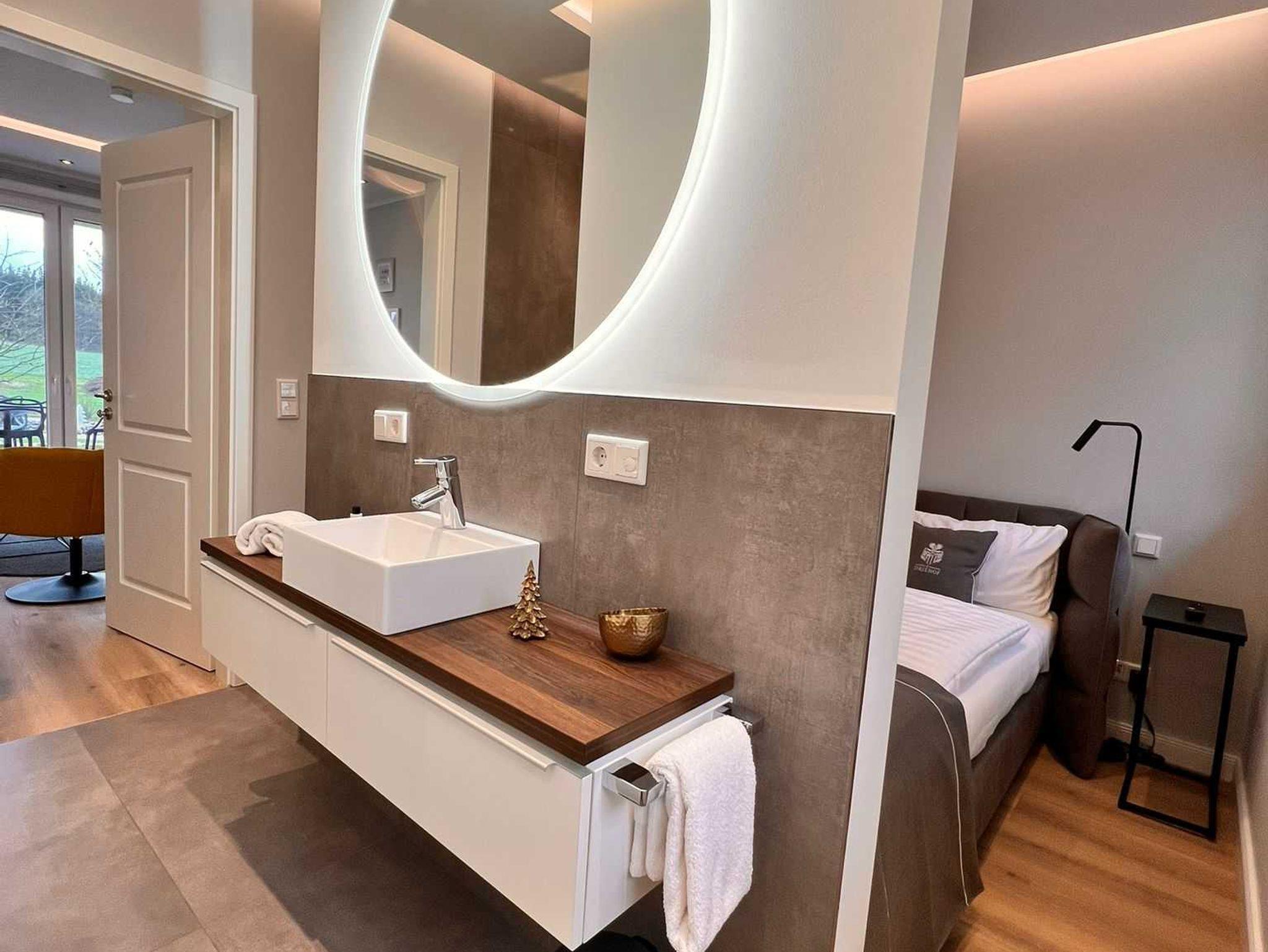 mit abgetrennten, aber offenem Badezimmer konzipiert ist. Das