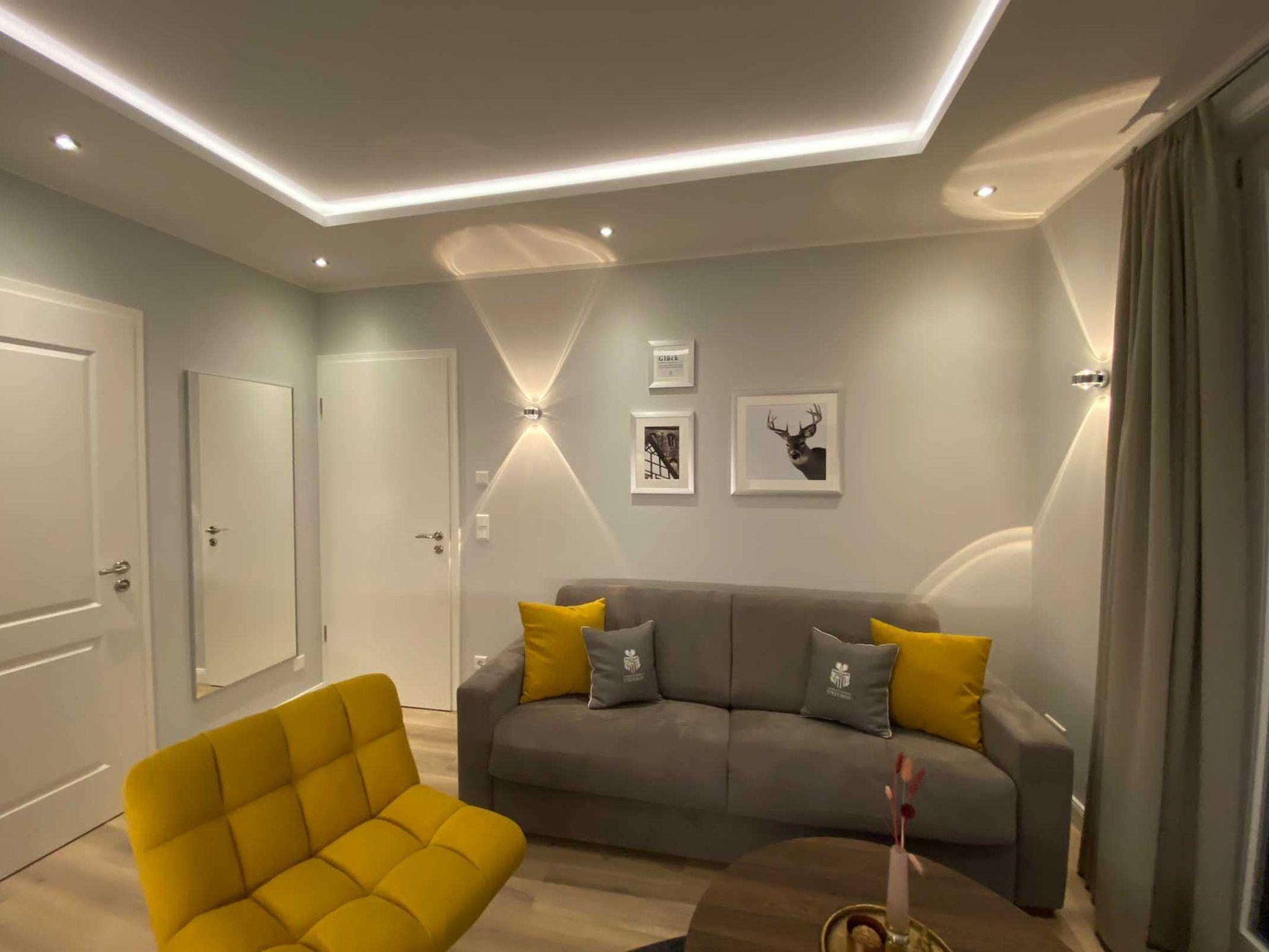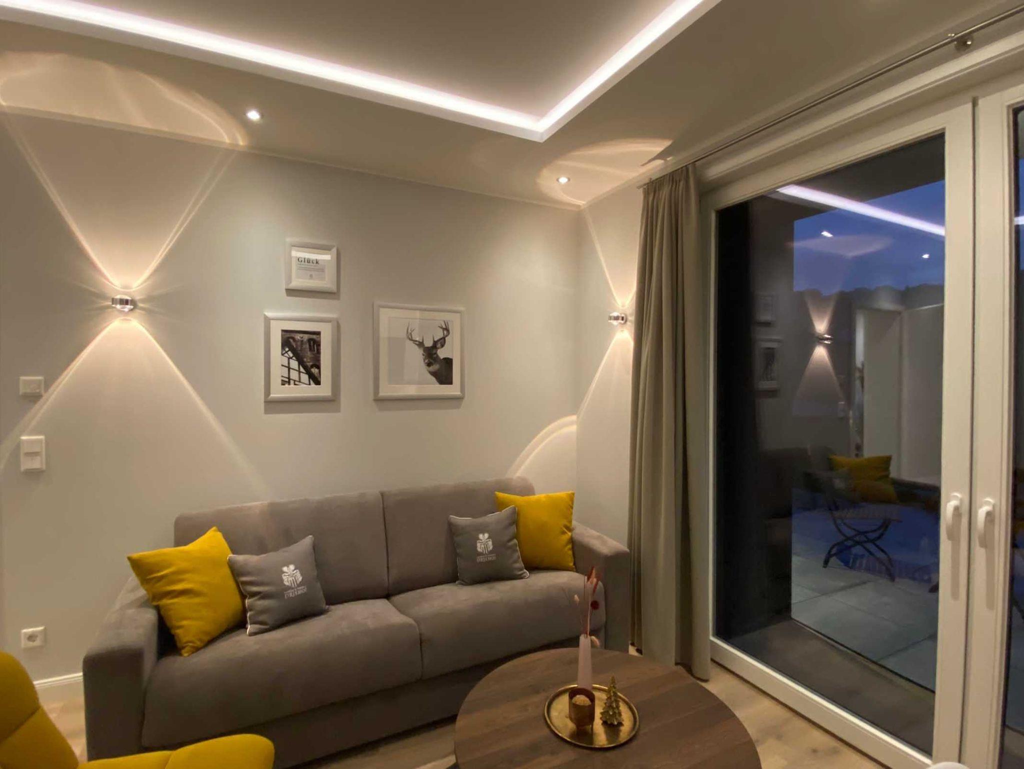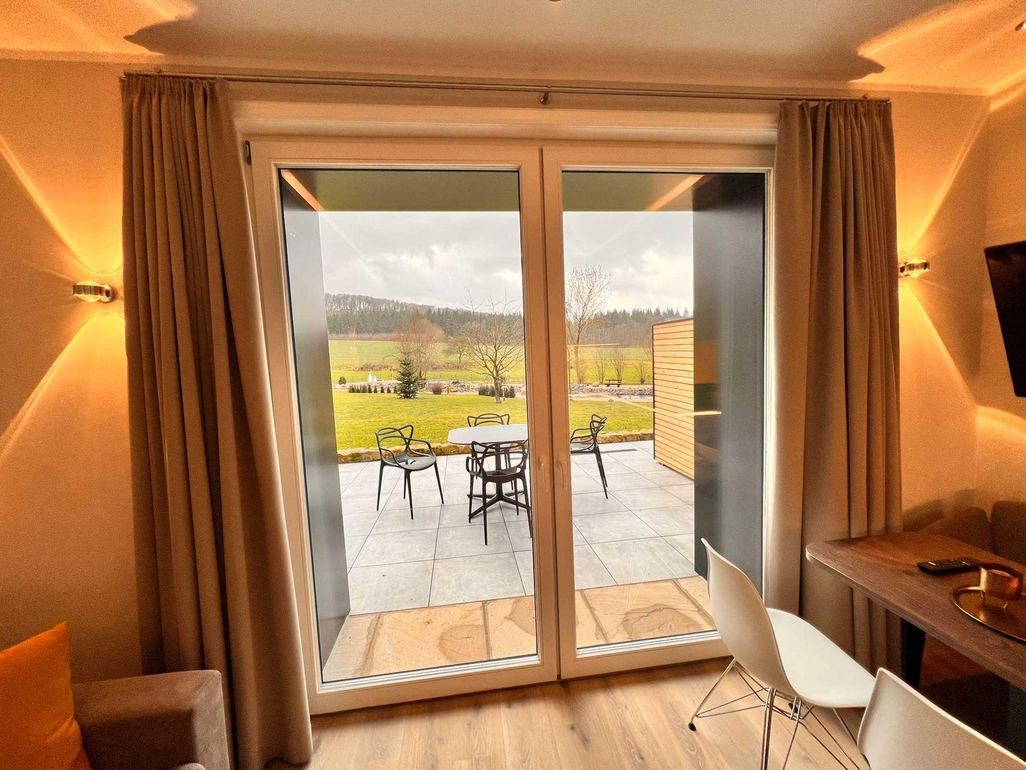 Das LifeStyle-Apartment, mit eigener Sonnenterrasse teilt sich auf in 2 Räume. Mit einem eigenen Zugangscode öffnet man die Tür des Apartments und gelangt in den lichtdurchfluteten Wohn-/Essbereich mit offener Küche und bodentiefen Fenstern. Die Küche ist voll ausgestattet mit Herd, Spülmaschine, Kühlschrank mit 3 Sterne Fach, Mikrowelle, Nespressomaschine, Kaffeemaschine, Geschirr usw. An die Küche grenzt der Tisch mit Sitzbank und 2 weiteren Stühlen an. Weiterhin finden Sie ein gemütliches Sofa mit Tisch und einem Sessel. Das Sofa ist ein Schlafsofa in Bettqualität, denn es verfügt über eine Matratze und ein Lattenrost, so dass man darauf schläft wie in einem Bett. Ein Fernseher ist natürlich auch vorhanden. Er ist ins WLAN eingebunden, so dass man mit den entsprechenden Anbietern auch streamen kann. Der Wohnbereich kann abends durch blickdichte und lichundurchlässige Gardinen verdunkelt werden. Vom Wohnbereich gelangen Sie durch eine Tür in den 2. Raum, der als Schlafzimmer
