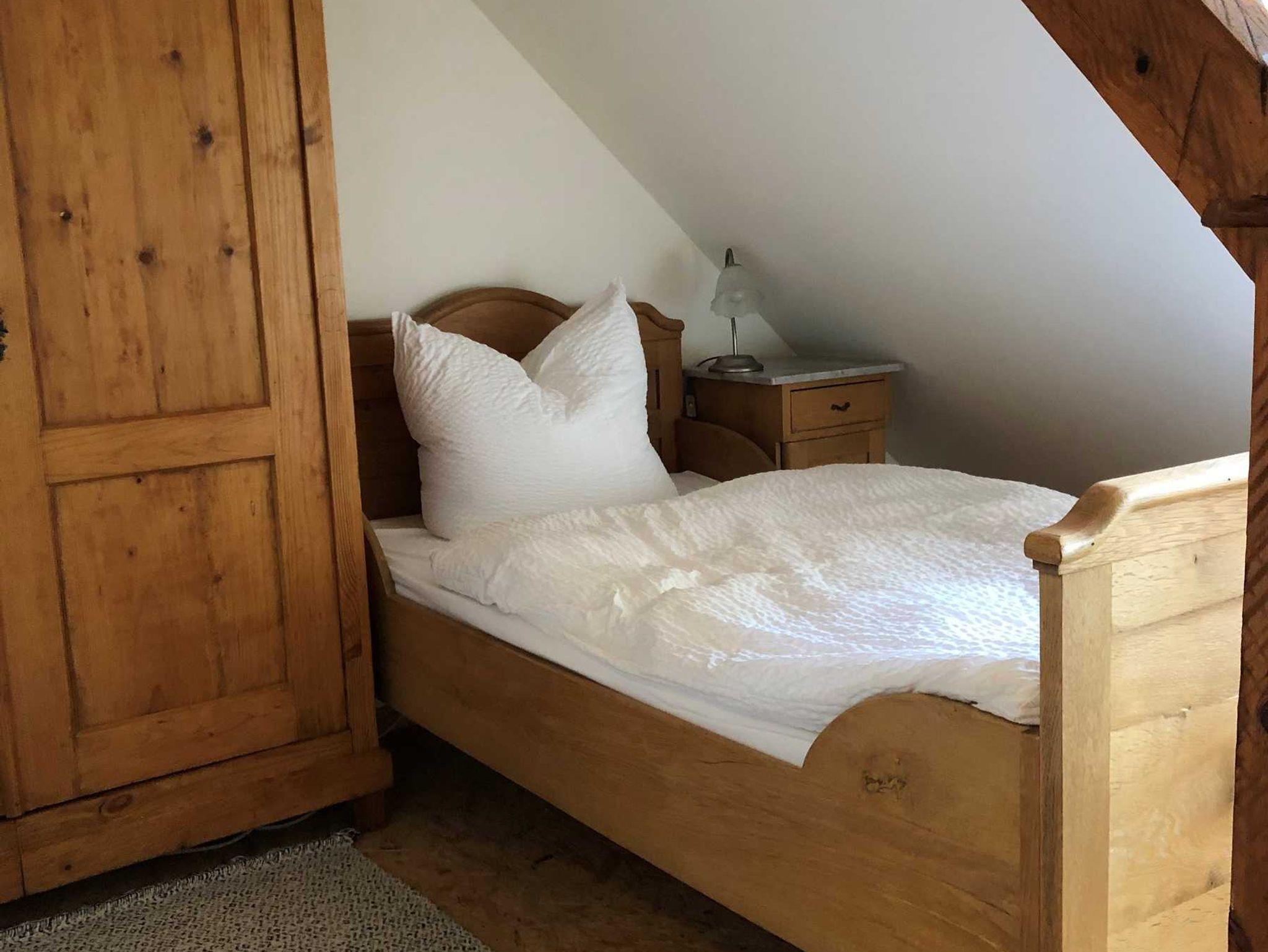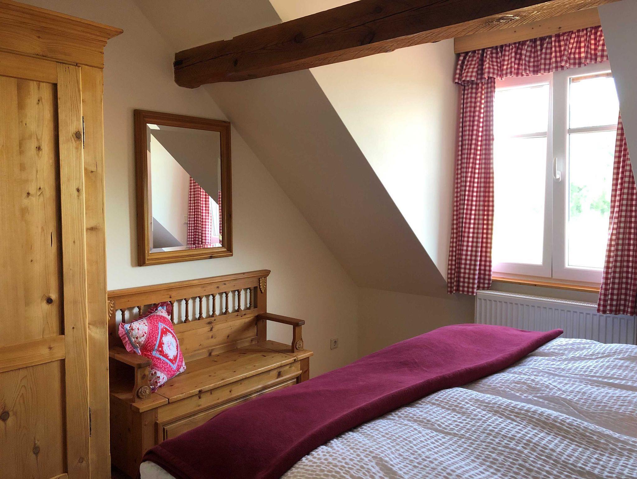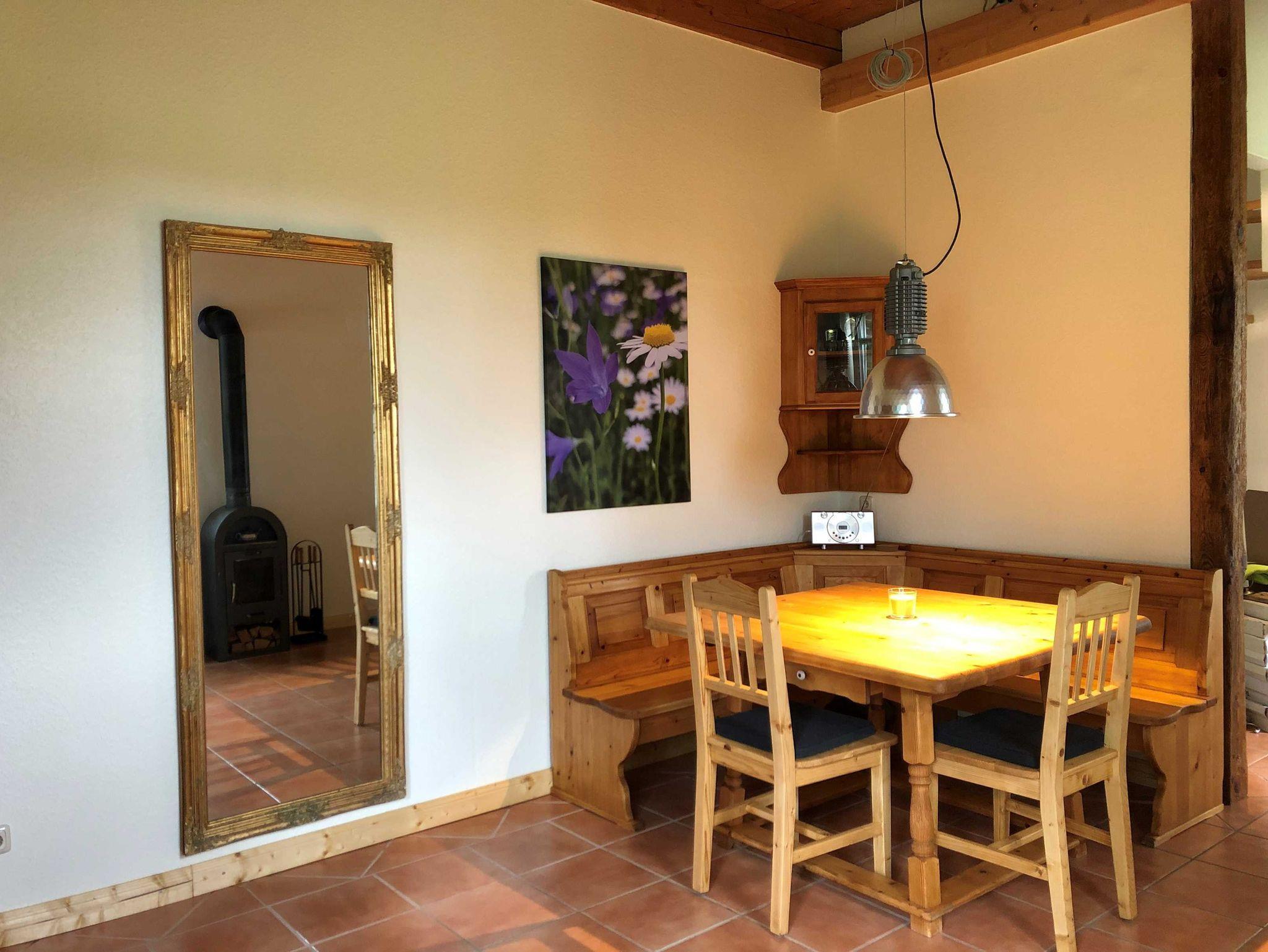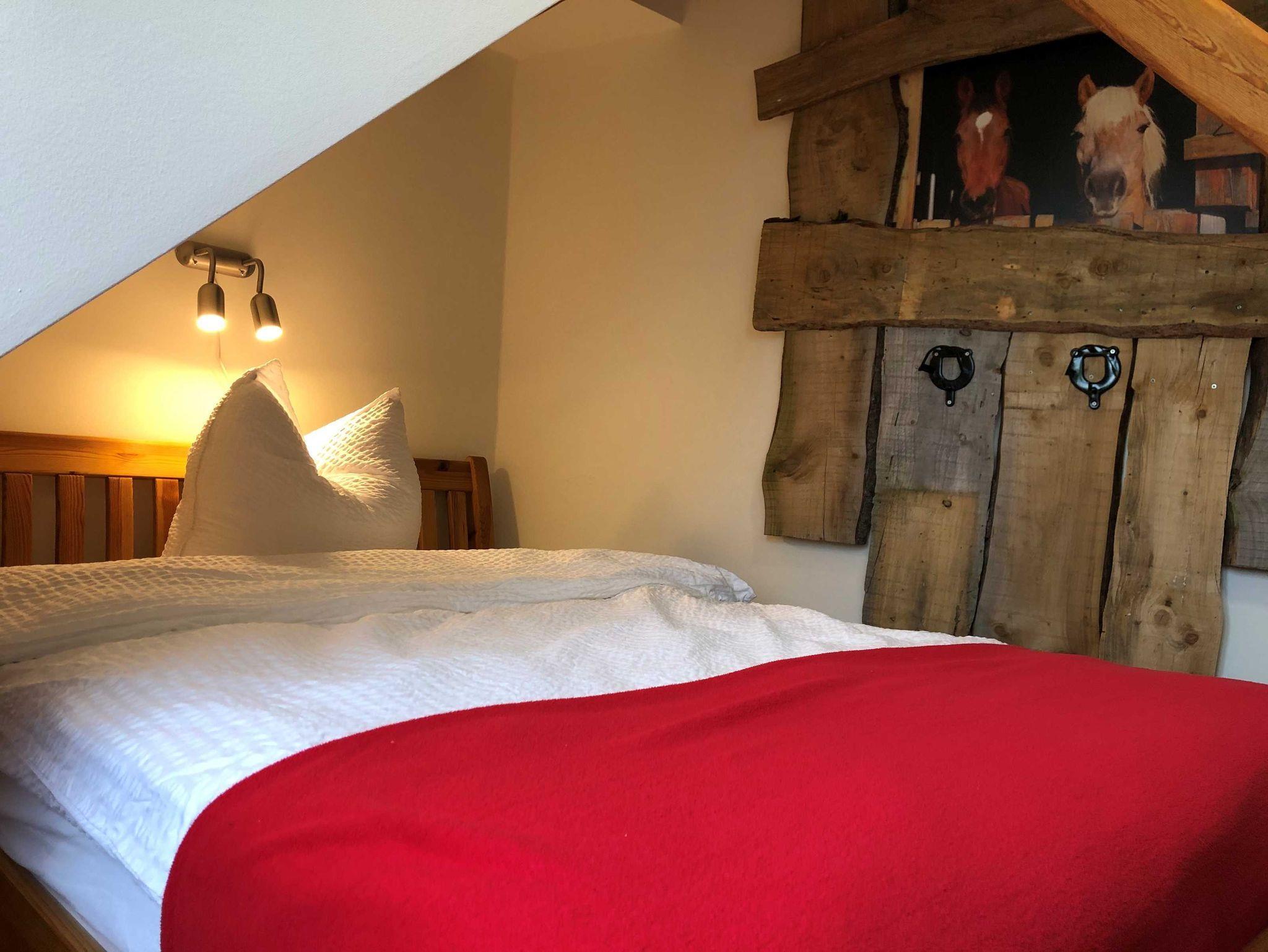 Herzlich Willkommen im Urlaub - die Ferienwohnung Anton Schmitz haben wir nach dem Begründer dieser Hofstelle benannt. Um das Jahr 1895 herum wurde von ihm das Haupthaus, welches von uns als Wohnhaus genutzt wird, errichtet. Im später erbauten Nebengebäude befand sich Platz für den Dreschkasten, später für den Traktor. Im Jahr 2001 wurde das Gebäude komplett renoviert. Eine kleine Wohnung wurde eingerichtet, etwas später zogen die Pferde unter das Schleppdach dieses Gebäudes ein. Heute wird die Scheune von uns als Lagerrraum für unsere Ernte und als Parkplatz für landwirtschaftliche Geräte genutzt. Die Ferienwohnung erstreckt sich über 109 Quadratmeter des Gebäudes. Die Schlafräume und der große Wohnraum im Dachgeschoss wurden 2021 komplett renoviert und im gemütlichen Landhausstil eingerichtet. Eine Wendeltreppe (keine Raumspartreppe) verbindet das Wohnzimmer mit dem Erdgeschoss; hier finden Sie das - ebenfalls in 2021 komplett renovierte - Badezimmer mit Dusche und kleinem Fenster mit Blick direkt in den Stall. Ebenso befindet sich im Erdgeschoss ein großzügiger Wohn-Essbereich mit Einbauküche (Geschirrspüler, E-Herd mit Backofen und Kühlschrank). Neben der schönen Massivholz-Eckbank mit Kieferntisch befindet sich ein kleiner Kaminofen der eine gemütliche Atmosphäre bei den gemeinsamen Abenden herbeizaubert. Abgerundet wird der Eingangsbereich durch einen geräumigen alten Dielenschrank. Sie haben selbstverständlich einen eigenen Eingang direkt zur gepflasterten Hoffläche. Neben unserem Gemüsegarten ist eine ca 200 m2 große Rasenfläche mit Sitzmöglichkeiten für Sie allein reserviert. Sie können hier gern in aller Ruhe Essen, Trinken und entspannen. Sie sollten auf jeden Fall ihre Fahrräder mitbringen und die Umgebung erkunden - Ihre Räder können Sie gern geschützt bei uns abstellen. Insgesamt umfasst unsere Hofstelle knapp 20.000 m2. Der überwiegende Teil wird von unseren Pferden beweidet. Einen Teil der Wiese haben wir mit alten Obstsorten bepflanzt. Außerdem teilen sich mit uns unsere Hühner und Katzen das Grundstück - diese können sich bei uns frei bewegen. Aus diesem Grund können wir leider keine Haustiere in unserer Ferienwohnung beherbergen.