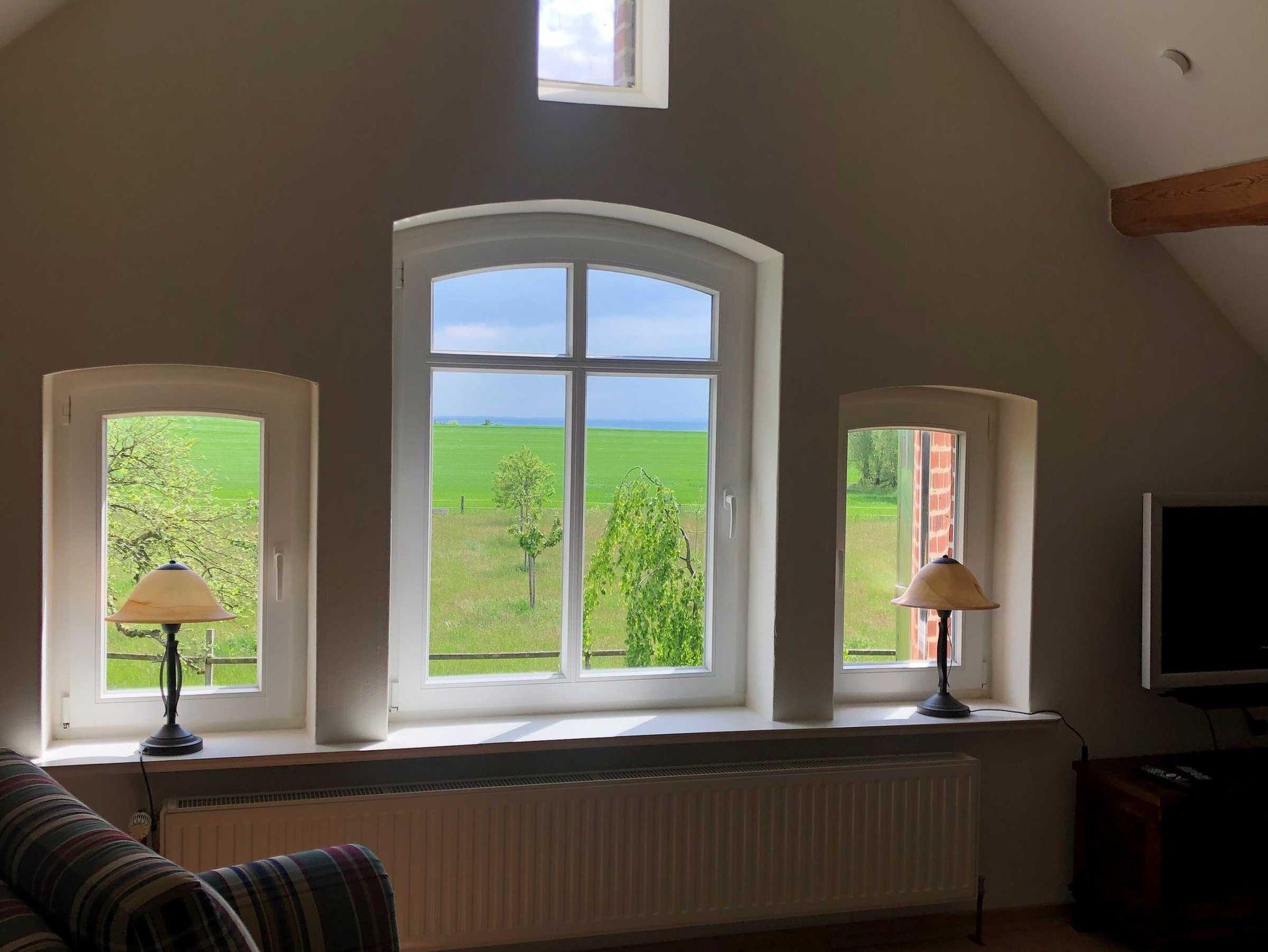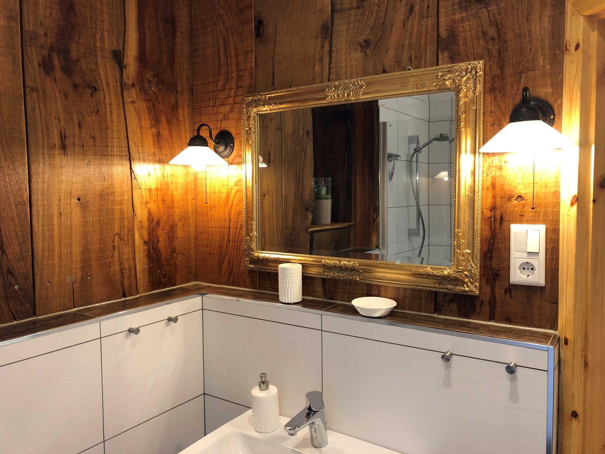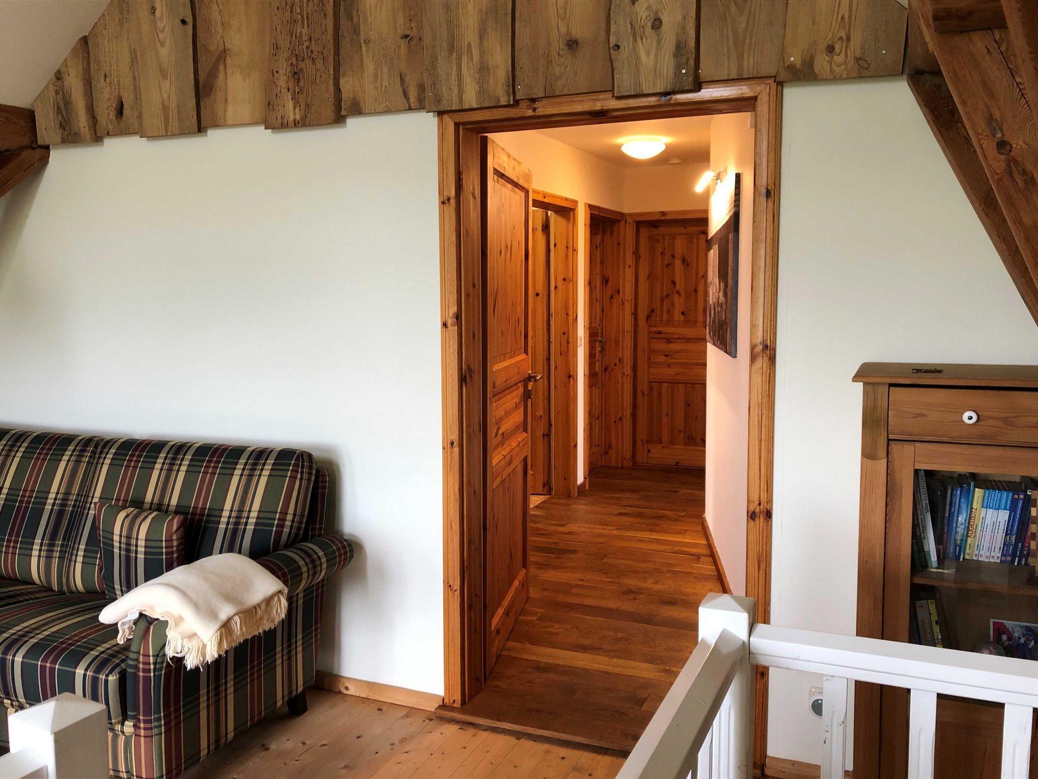 Die Ferienwohnung befindet sich im Nebengebäude und wurde 2021 vollständig und liebevoll renoviert. Bei der Innengestaltung wurde viel mit (Alt-) Holz gearbeitet. Die Ferienwohnung bietet auf 105 Quadratmetern: Im Erdgeschoss eine offene Wohn-Küche mit gemütlicher Eckbank, Ofen und das Badezimmer. Die Küche ist selbstverständlich komplett ausgestattet. Im Obergeschoss befindet sich ein fast 20 Quadratmeter großes Wohnzimmer mit herrlichem Blick über unsere Obstwiese und viele Kilometer darüber hinaus- bei guter Sicht können Sie am Horizont die Türme der Stadt Münster sehen. In diesem Raum befindet sich ein SatTV, sie können hier also herrlich tollen Urlaubstag angenehm ausklingen lassen. 3 Schlafräume liegen an einem kleinen Flur der vom Wohraum abgeht: Hier befindet sich zunächst ein Raum mit einem Bett von 0,90 m Breite, im nächsten Raum ein Bett mit 1,40 m Breite. Im dritten Raum befindet sich eine Schlafgelegenheit für 2 Personen - hier ist die Schlafgelegenheit 1,80 (getrennte Matratzen) breit. Alle Schlafräume verfügen über elektrische Jalousien und lassen sich bei Bedarf komplett verdunkeln. Gegen Fliegen sind alle Schlafräume, das Bad und das Wohnzimmer mit Fliegengittern ausgestattet. Alle Räume im Obergeschoss haben einen Holzfussboden. Bitte beachten Sie, das die Wohnung in unmittelbarer Nähe zu Tieren ist - außerdem beachten Sie bitte auch, dass zum Obergeschoss eine Wendeltreppe führt.