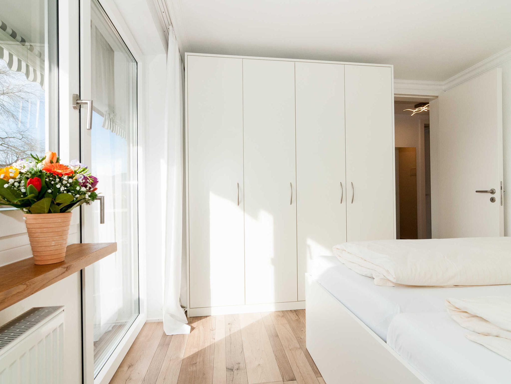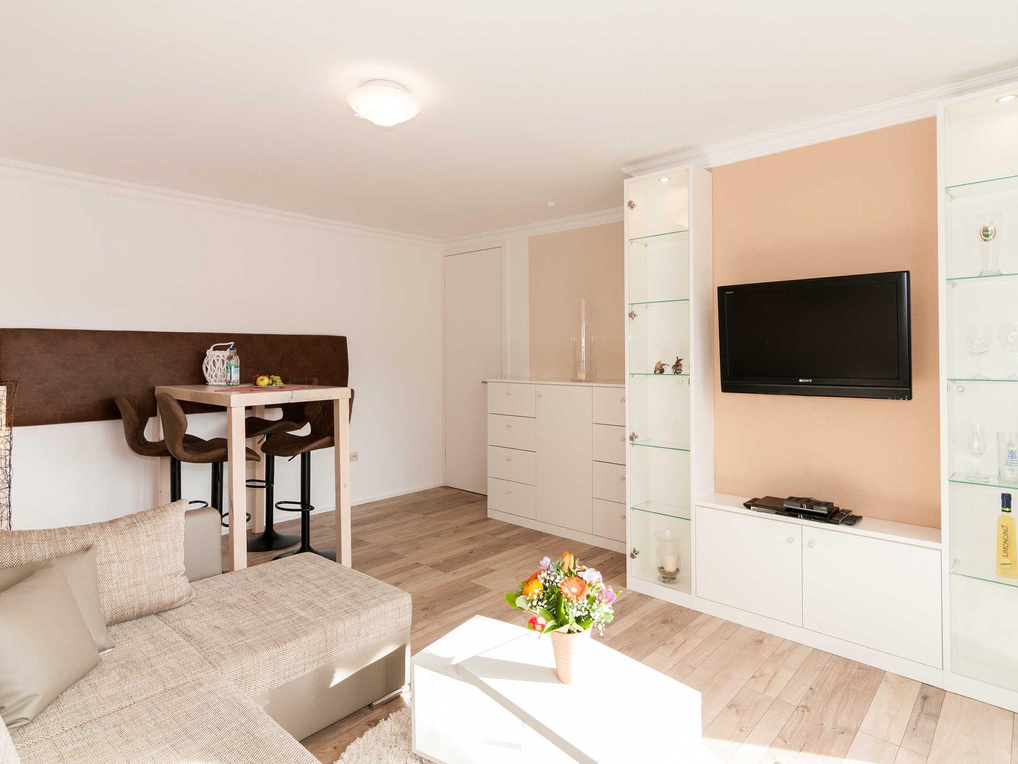 Die Wohnung verfügt über ein Wohnzimmer mit Schlafcouch, Flachbild-TV mit Satellitenanschluß und Internetzugang über W-Lan. Der Essbereich im Bistrostil mit Hochtisch und 4 verstellbaren Hochstühlen bietet Ihnen auch während des Frühstücks einen wunderbaren Ausblick. Das Schlafzimmer ist mit einem hochwertigen Vollholzbett mit USB-Ladevorrichtung und indirekter Beleuchtung ausgestattet. Der geräumige Kleiderschrank verfügt über einen Ganzkörperspiegel. Die kleine separate Küche ist neu, ein wahres Raumwunder und komplett ausgestattet. Das Badezimmer ist mit einer Wannendusche, Glastrennwand, WC und Waschgelegenheit ausgestattet. Der große Spiegelschrank bietet Ihnen ausreichend Platz für Ihre Utensilien.