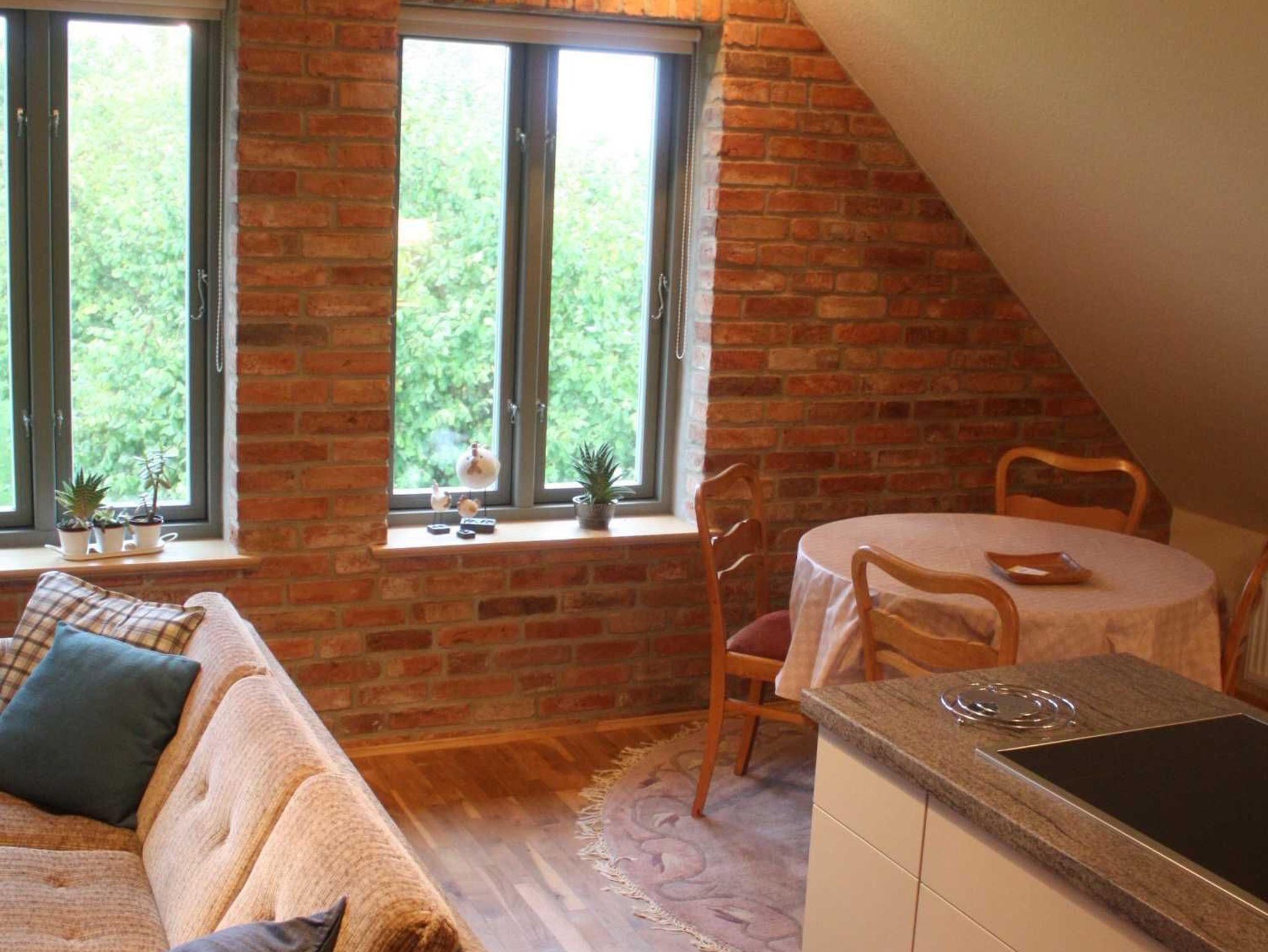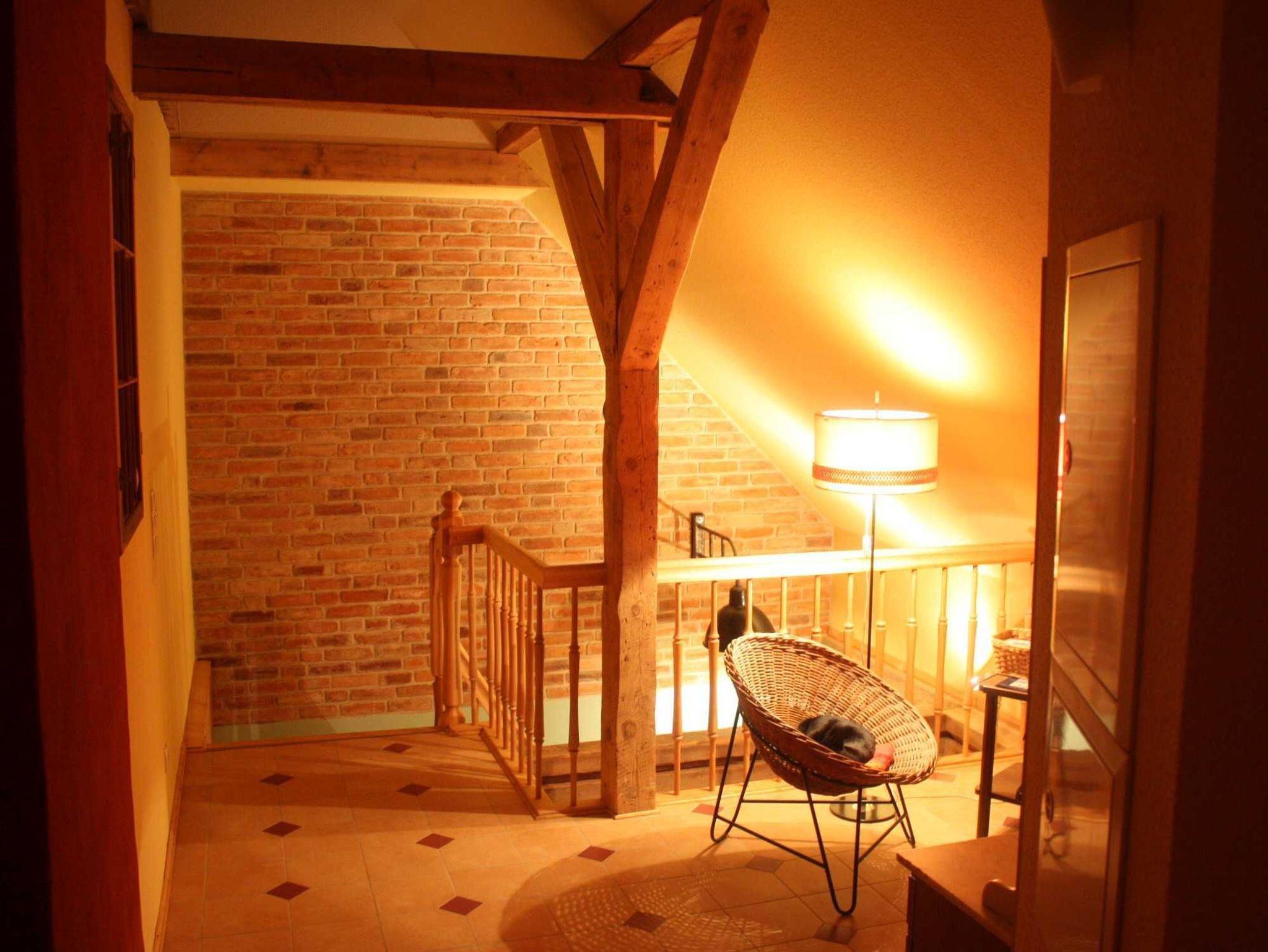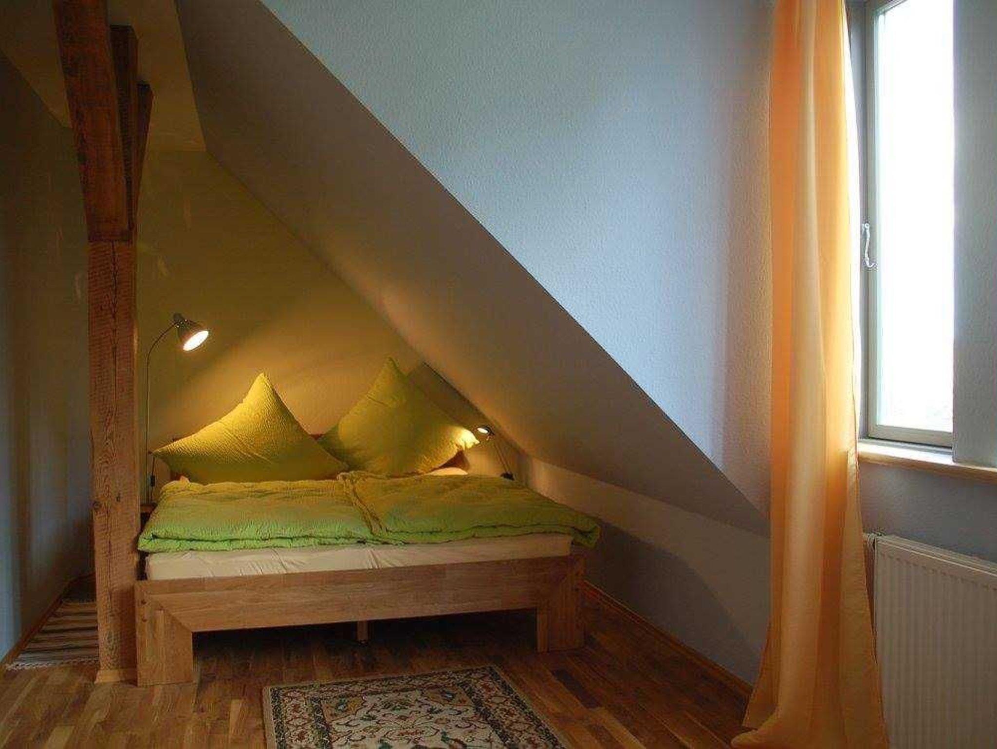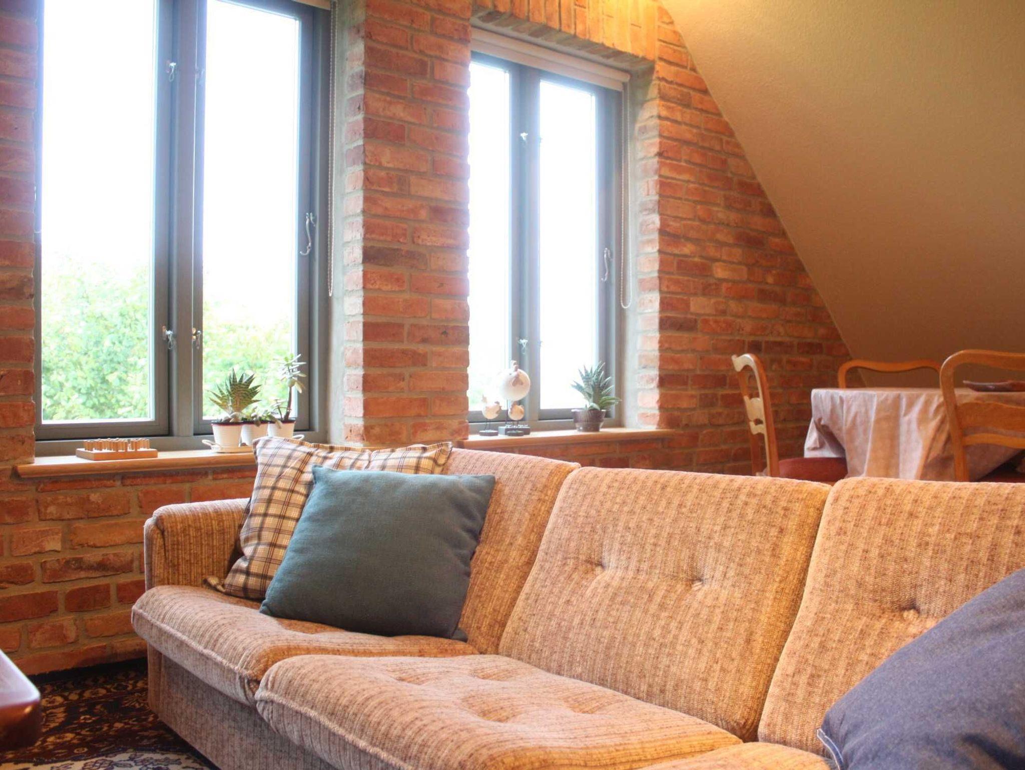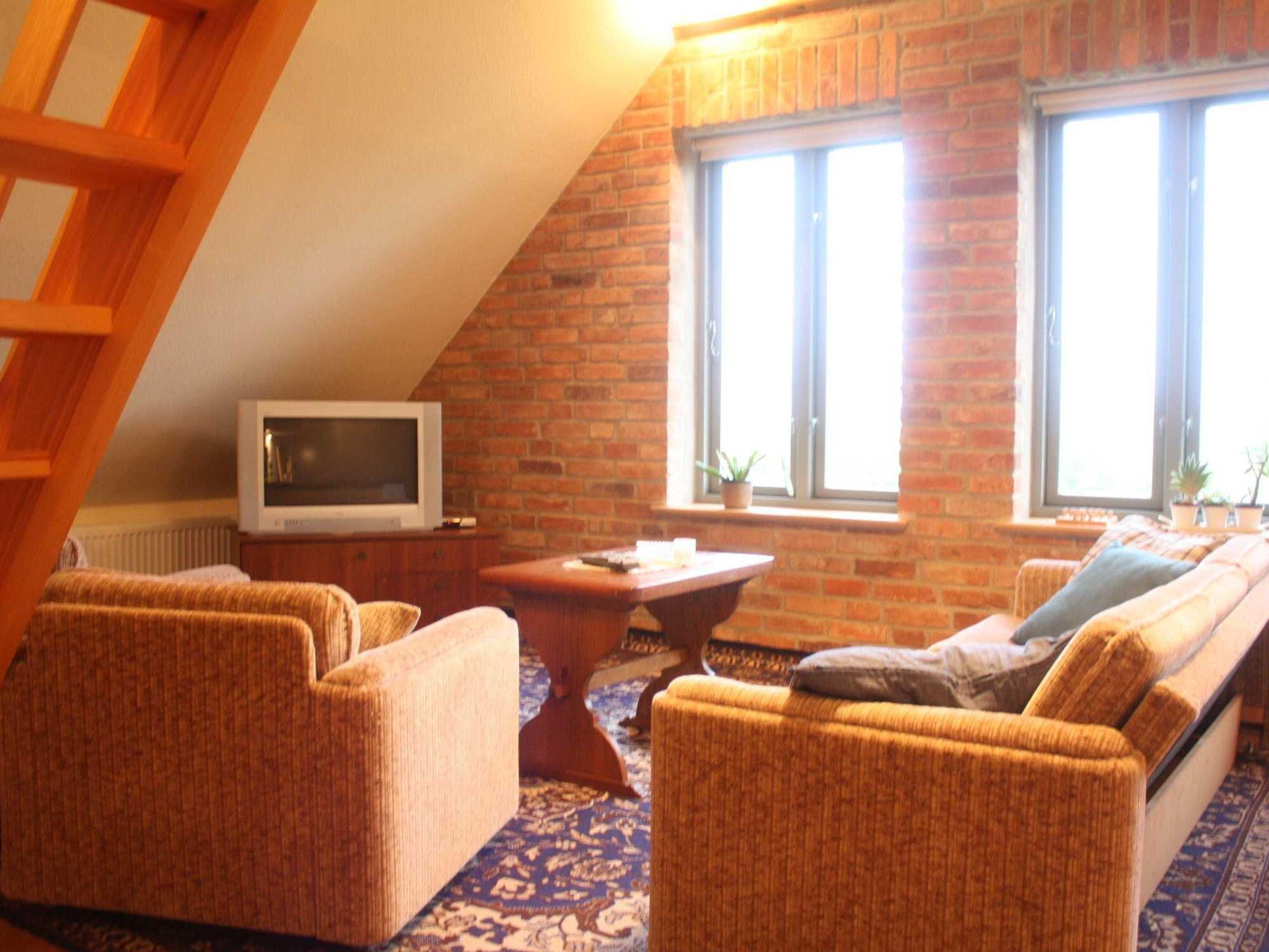 Die große Wohnung für bis zu 5 Personen befindet sich im oberen Geschoss und bietet schöne Ausblicke auf die Landschaft. Mit Balken und Schrägen gemütlich eingerichtet, verfügt sie über: