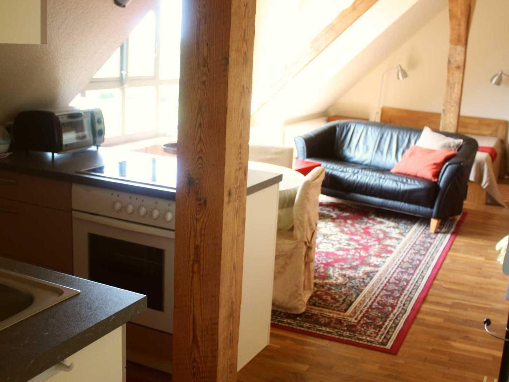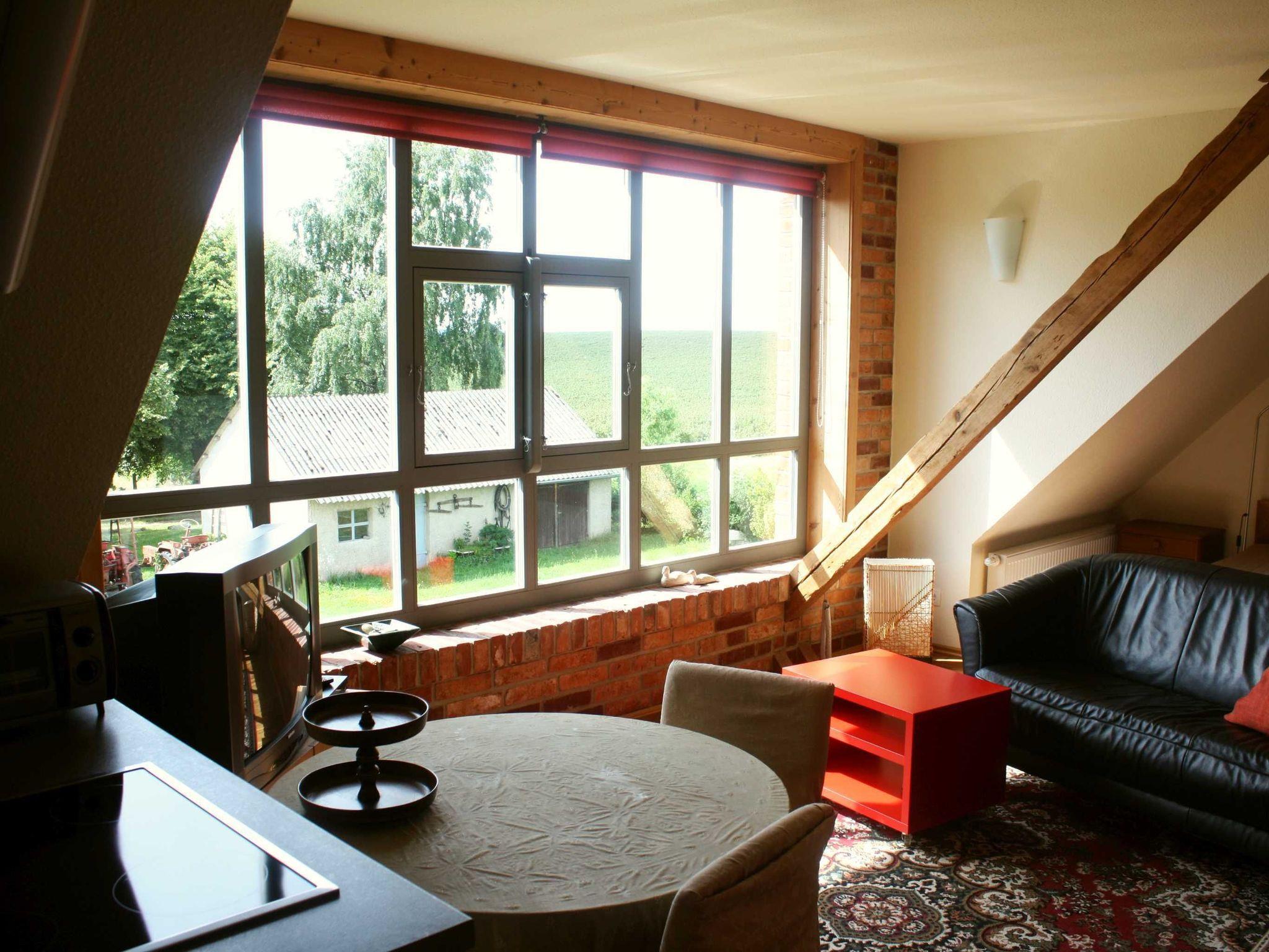 Diese Wohnung für 2 Personen liegt im oberen Geschoss und bietet durch das große Panoramafenster den schönsten Ausblick über die weiten Felder und Wälder. So wohnen Sie: