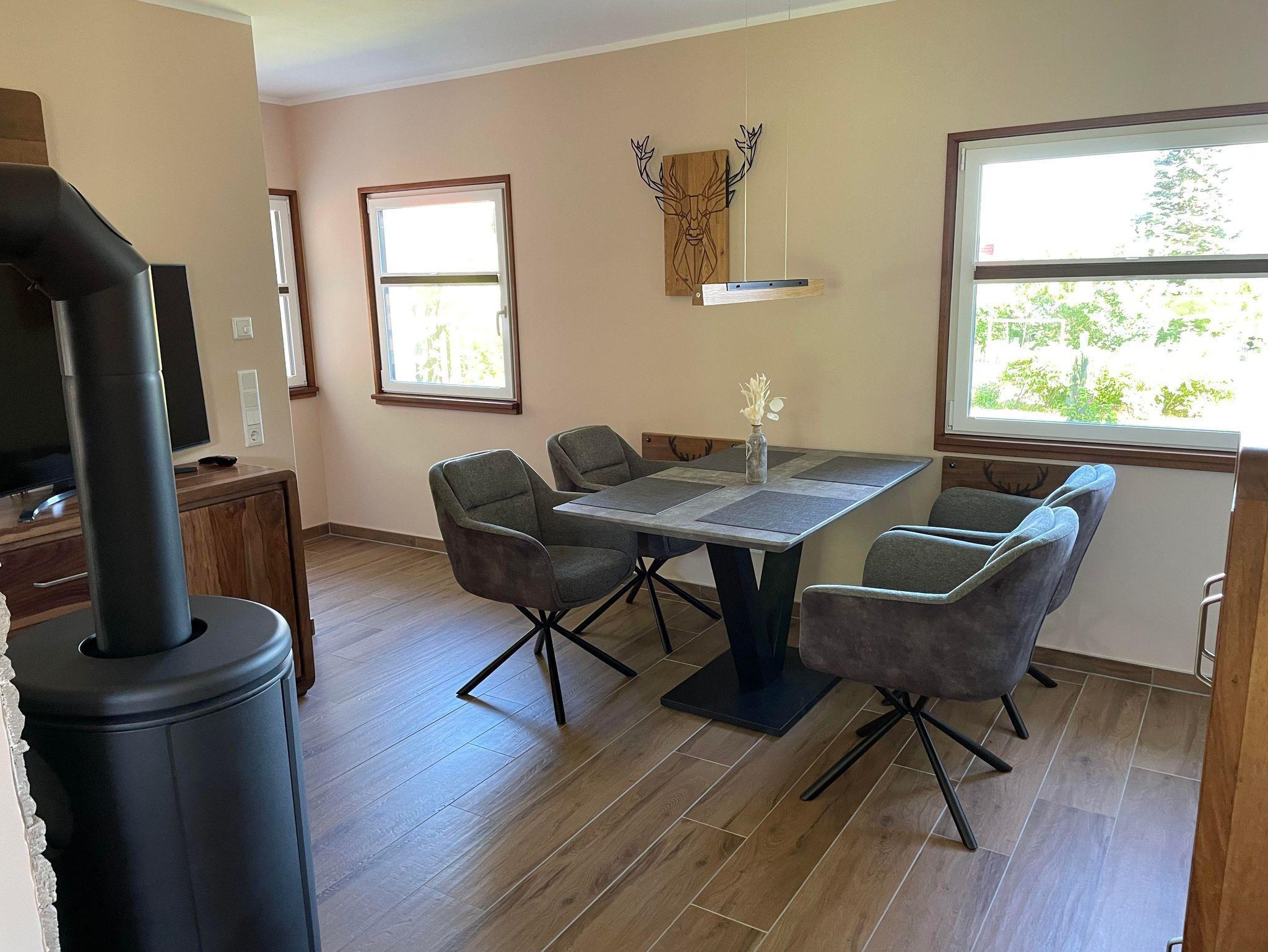 Unser lichtdurchflutetes Wohnzimmer ist mit einem Flachbild-TV und DAB-Radio ausgestattet. Auch ohne Sofa können es sich 4 Personen in den gemütlichen Drehsesseln am Kamin gemütlich machen.