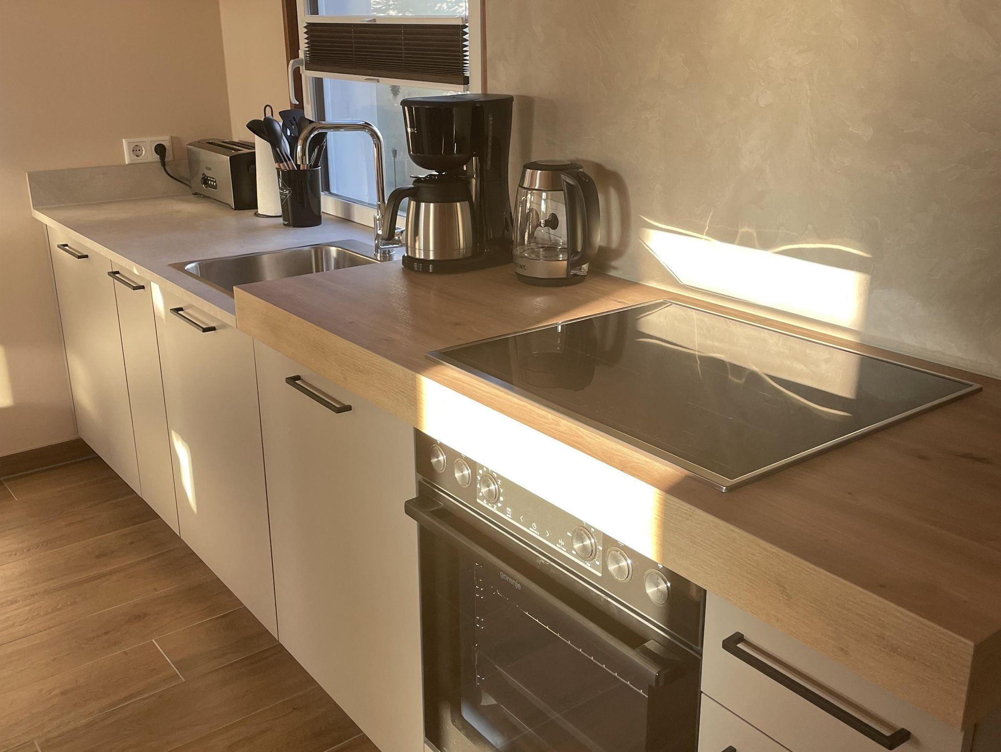 Induktionskochfeld, Backofen, Geschirrspüler, Kühlschrank, Gefrierfach, 2 Pfannen, 5 Töpfe, Besteck, Küchenutensilien, Kaffeemaschine, Toaster, Wasserkocher, 3 Schneidebretter (unter dem Backofen), Frühstücksbrettchen uvm.