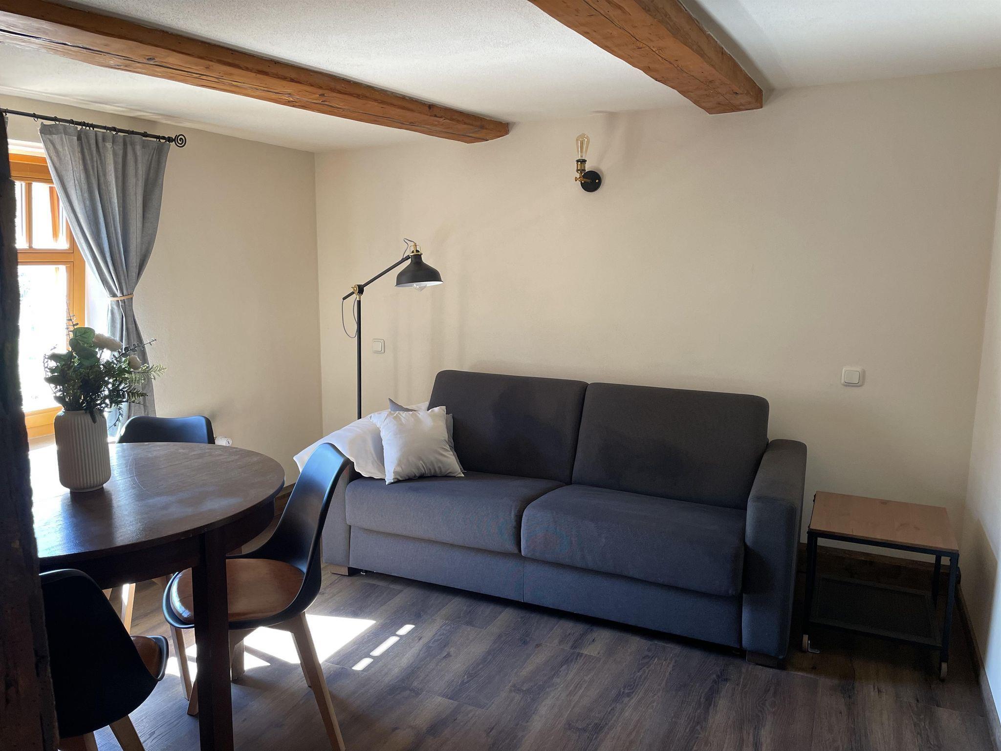 Wohnzimmer mit Esstisch + 4 Stühlen / Couch
