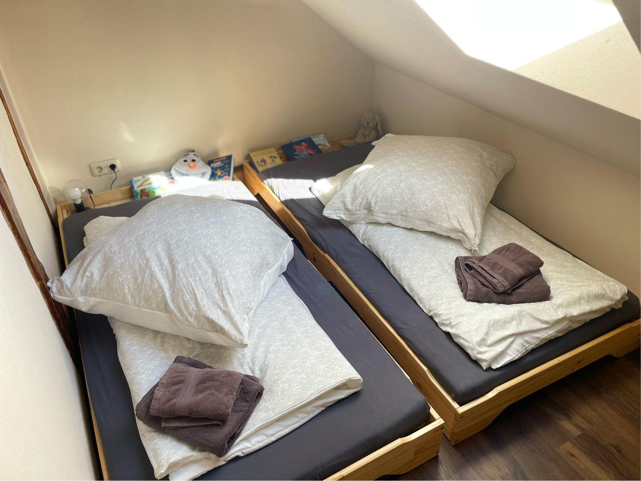 Schlafraum: Doppelbett + Schlafbereich für Kinder mit 2 Betten (Bettgröße 90x200 cm)