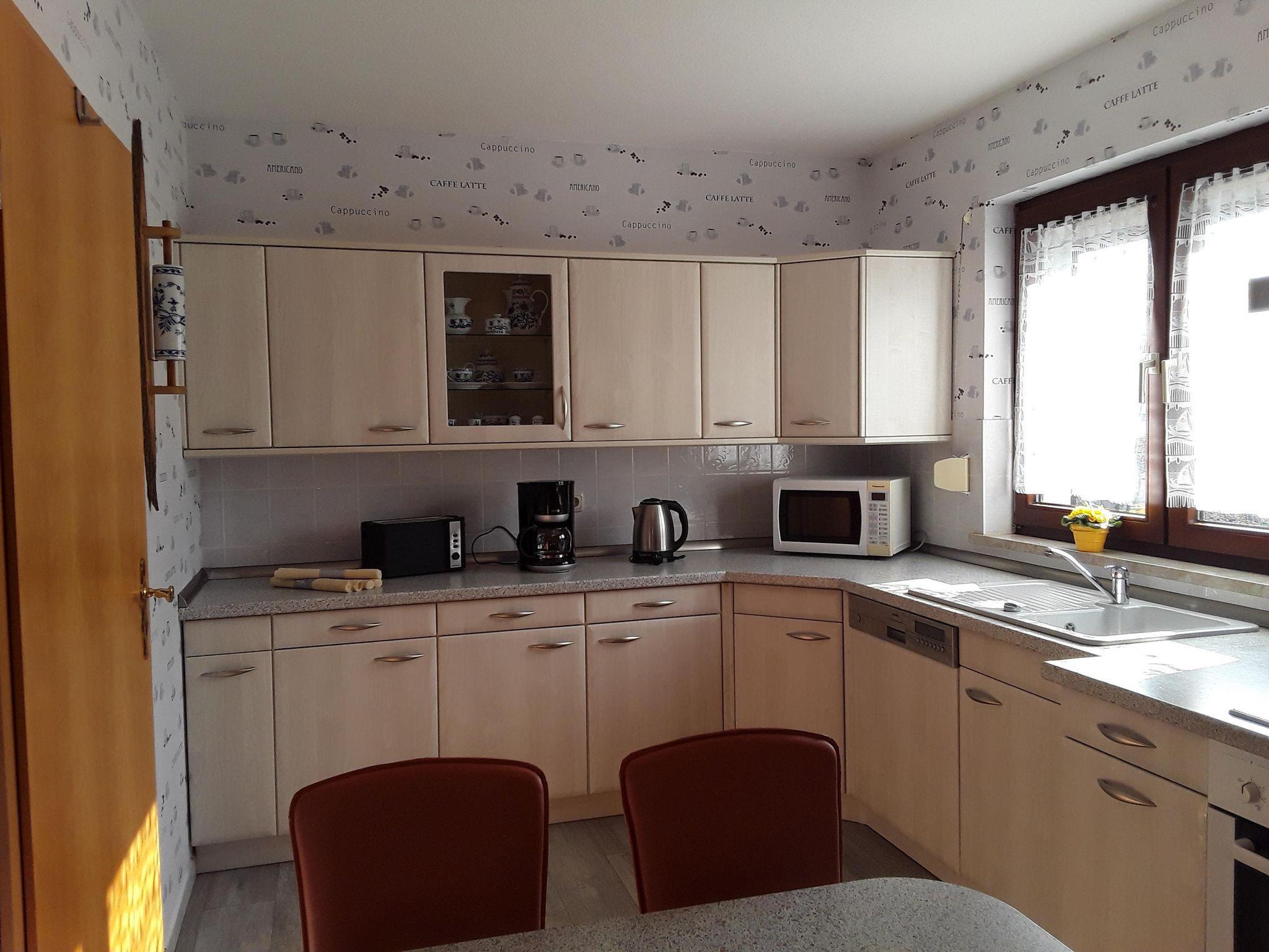 Küche: Herd, Spülmaschine, Microwelle, Wasserkocher, Kaffeemaschine, Kühlschrank mit Gefrierschrank