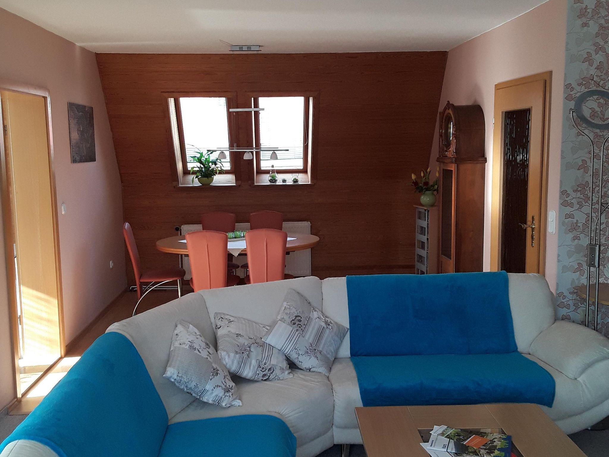 In der oberen Etage laden ein geräumiges Wohnzimmer mit angrenzendem Wintergarten und Dachterrasse zum Erholen ein. Die komplett ausgestattete Wohnküche befindet sich ebenfalls in der 1. Etage. Waschmaschine sowie Babyreisebett vorhanden.
