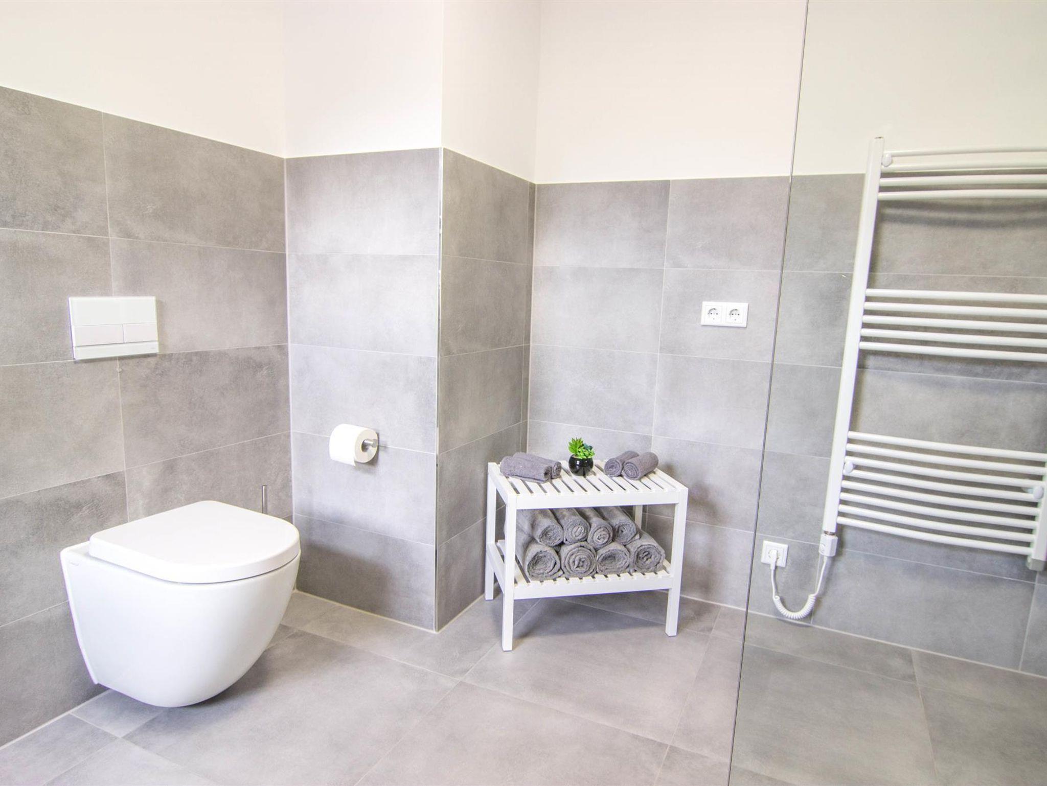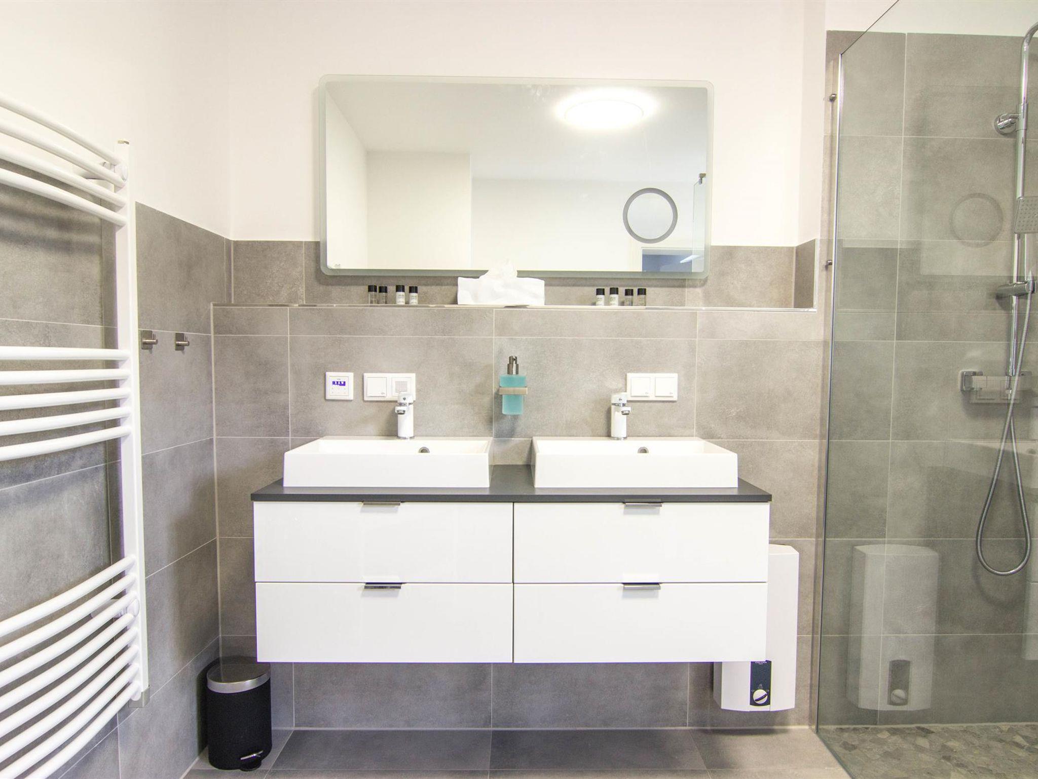 • Badezimmer mit ebenerdiger Dusche, Doppelwaschbecken, Fön, Handtuchheizung und erste Pflegeprodukte