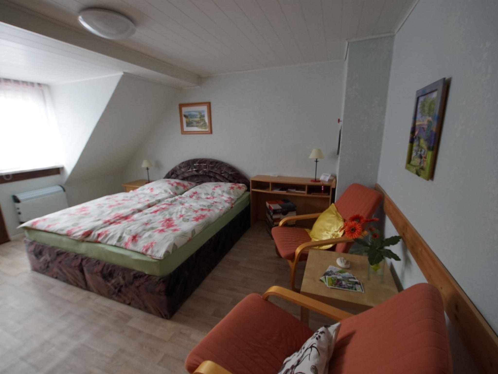 Mansardenwohnung im Haus der Vermieter mit 2 sep. Wohnchlafzimmer, TV, Bad mit DU/WC, gut ausgestatte sep. Küche mit Kaffeemaschine, Toaster, Wasserkocher, Mikrowelle. Blick auf Hexentanzplatz und Roßtrappe.i