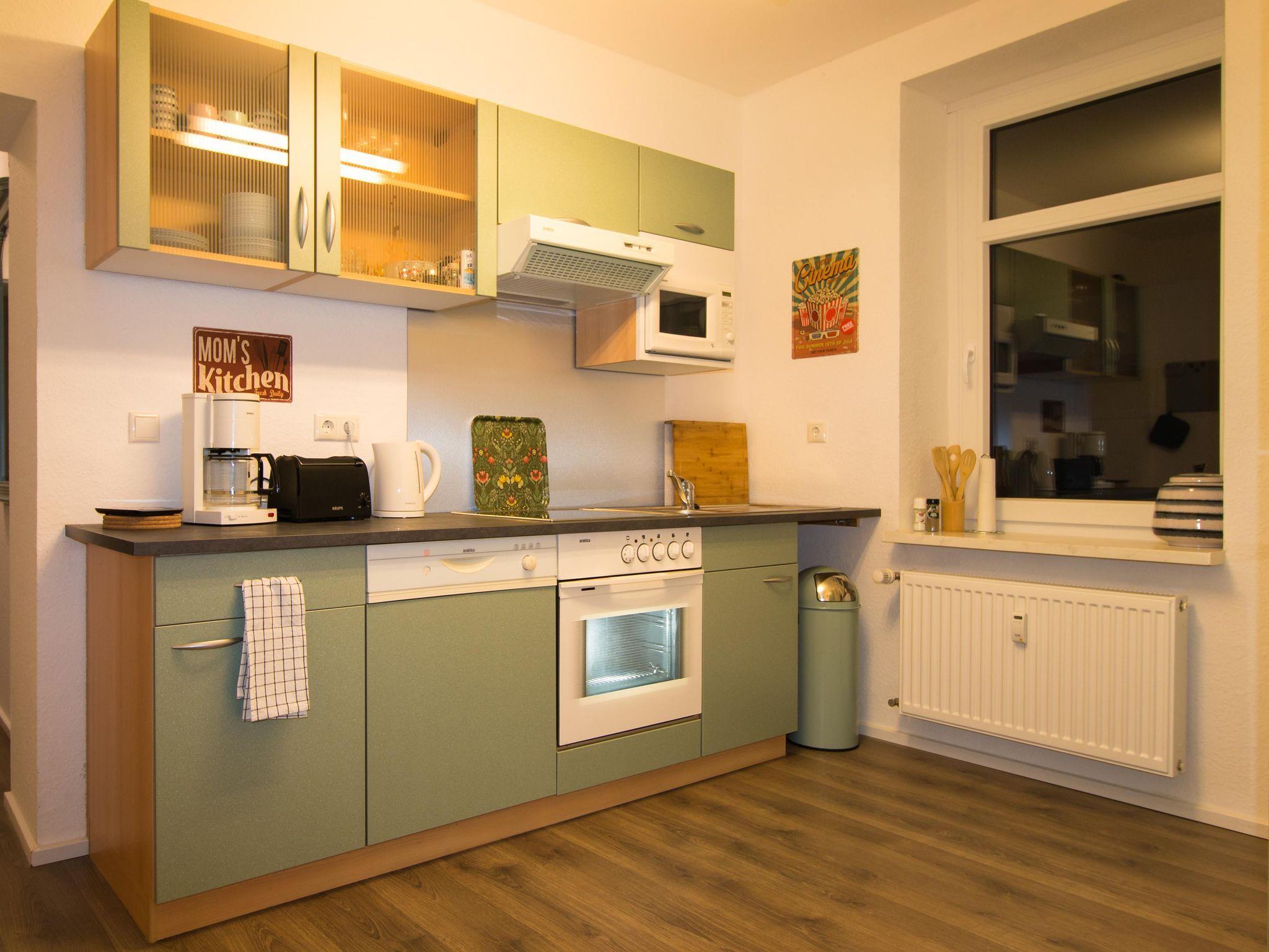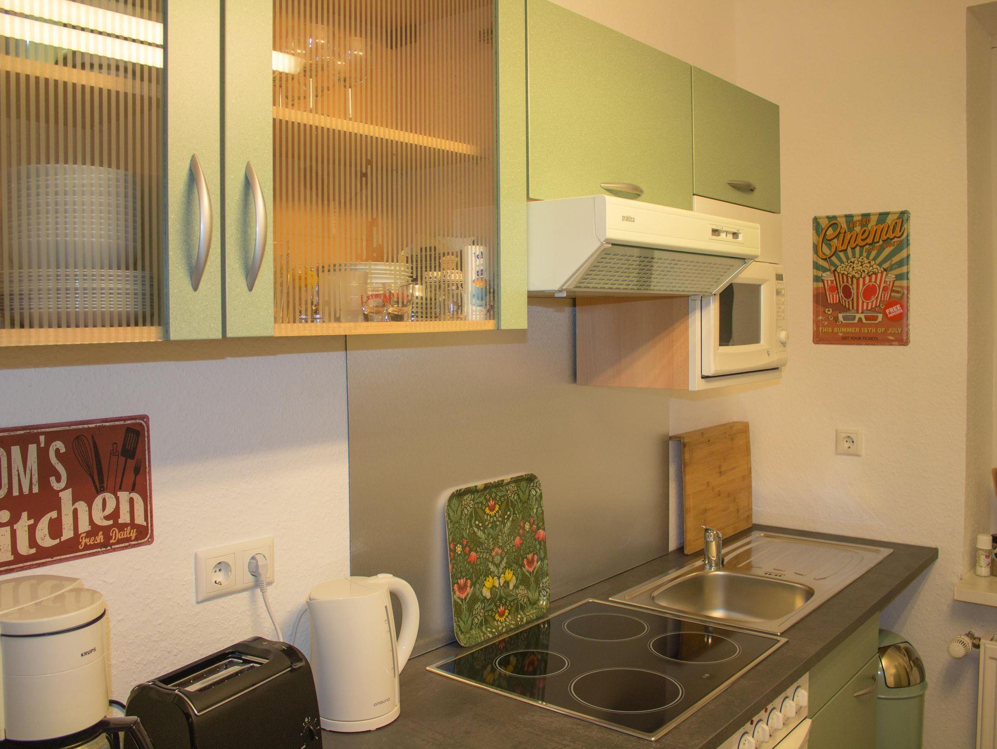 Die Wohnung bietet Ihnen eine komplett ausgestattete Küche mit Kaffeemaschine Wasserkocher, Toaster, Mikrowelle, E-Herd mit Ceranfeld, Backofen, Kühlschrank mit Gefrierfach und einer Geschirrspülmaschine.