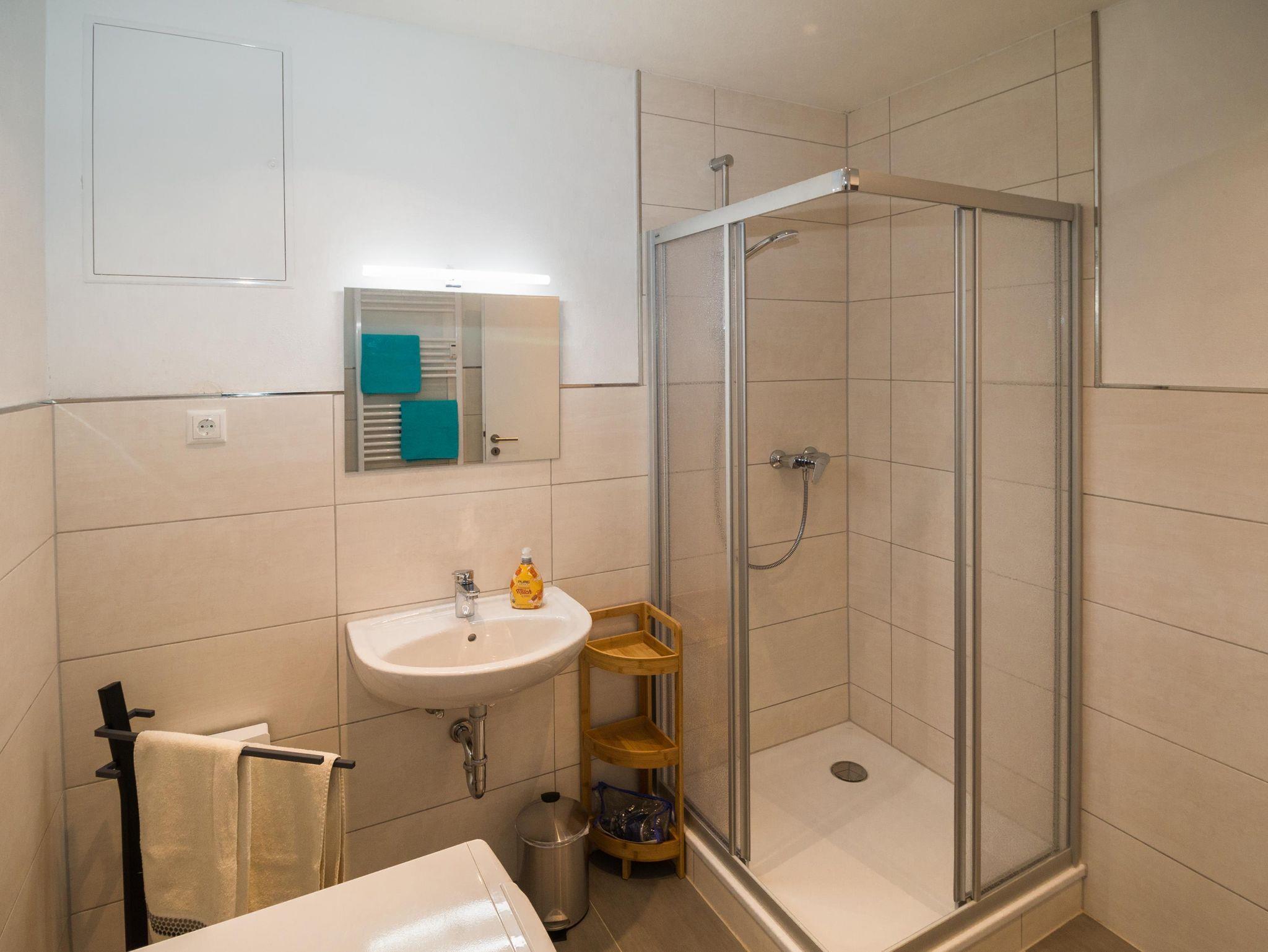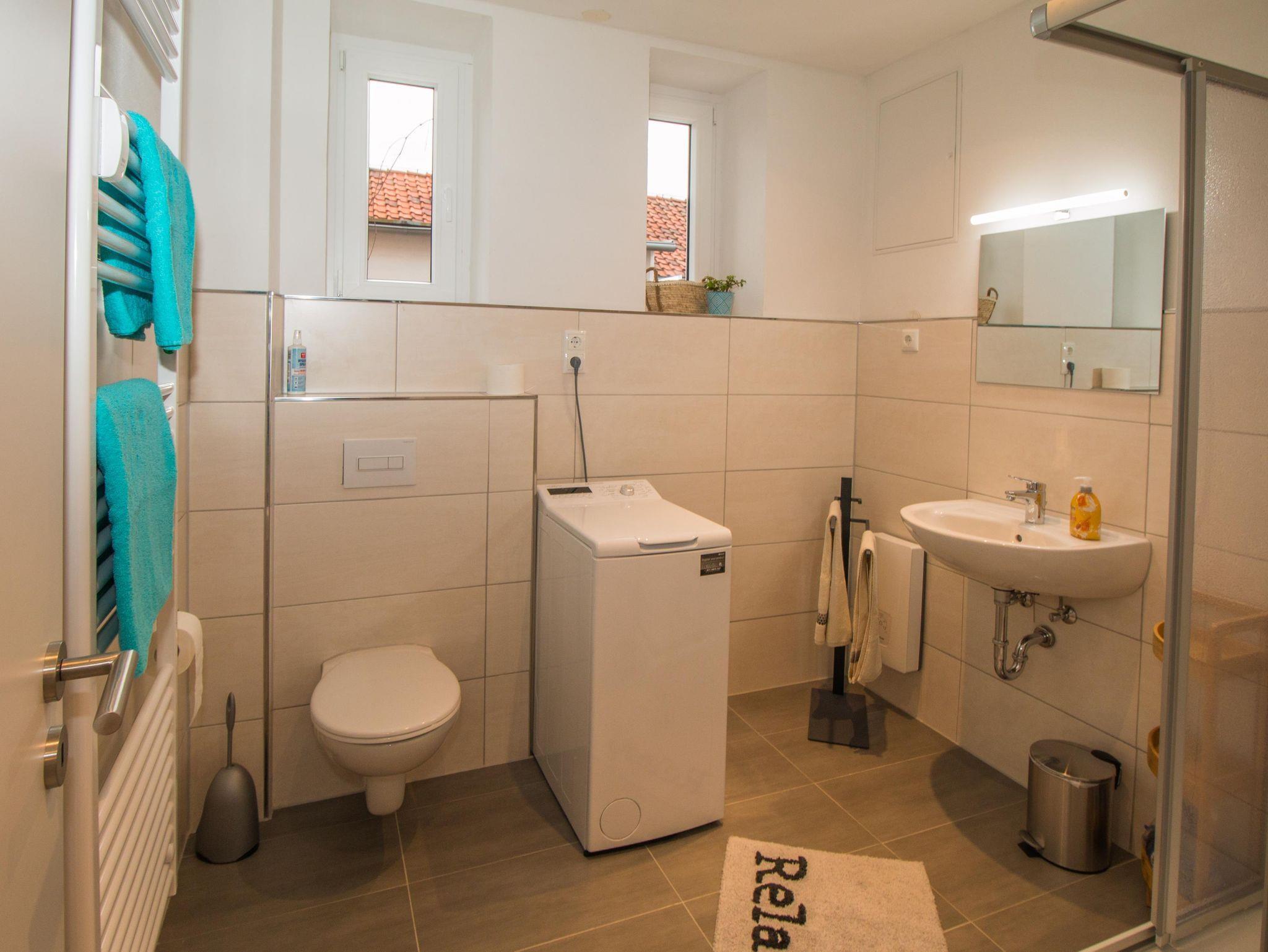 Das Badezimmer ist modern und großzügig eingerichtet und verfügt über eine Dusche, ein WC sowie einen Föhn und einer Waschmaschine.