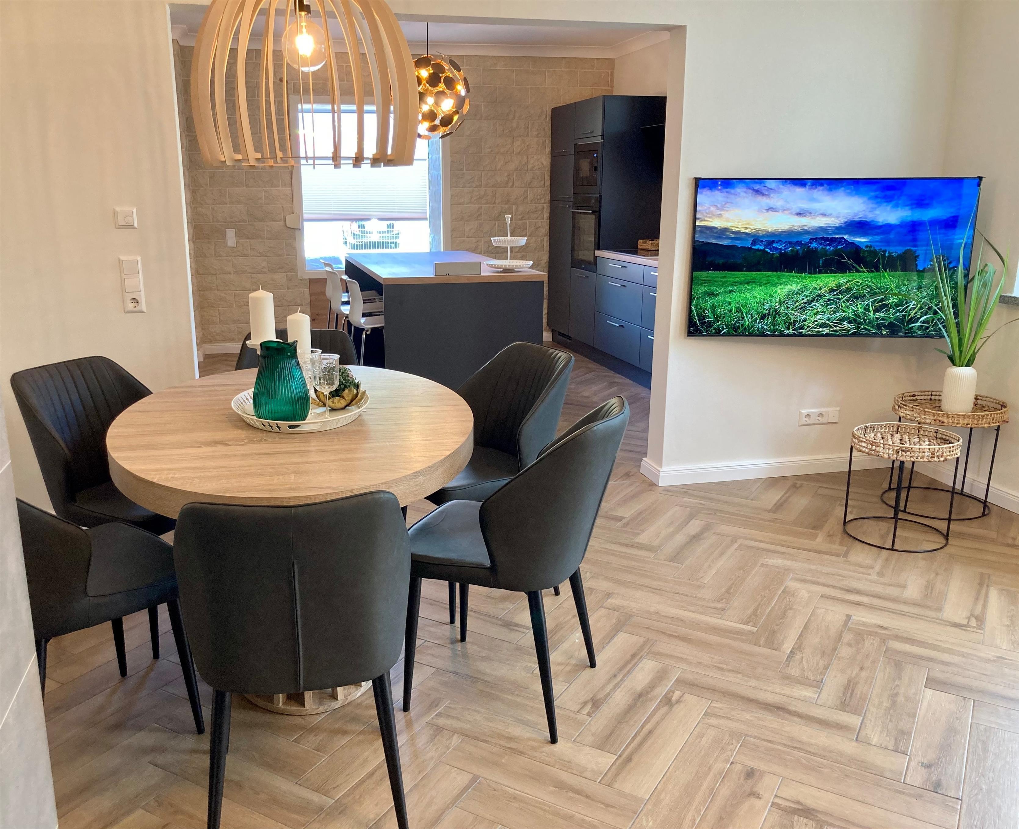 Bereits beim Betreten spüren Sie die besondere Atmosphäre des Hauses: warme Holztöne, ausgewählte Materialien und eine geschmackvolle Einrichtung schaffen ein elegantes, zugleich gemütliches Zuhause auf Zeit. Im großzügigen Wohnbereich lädt ein Kamin zu behaglichen Abenden ein – perfekt nach einer Wanderung durchs Bodetal oder einem Winterspaziergang.