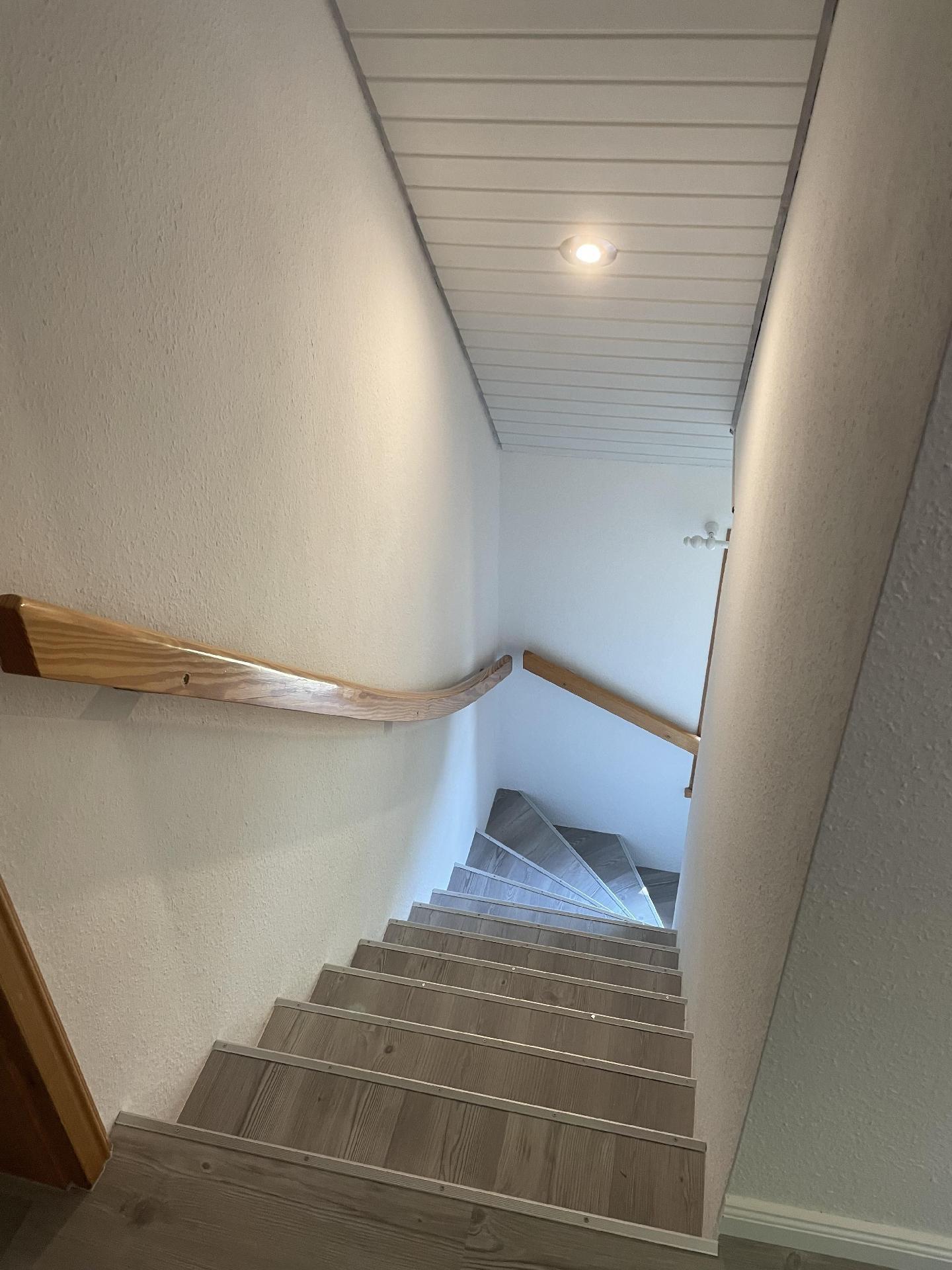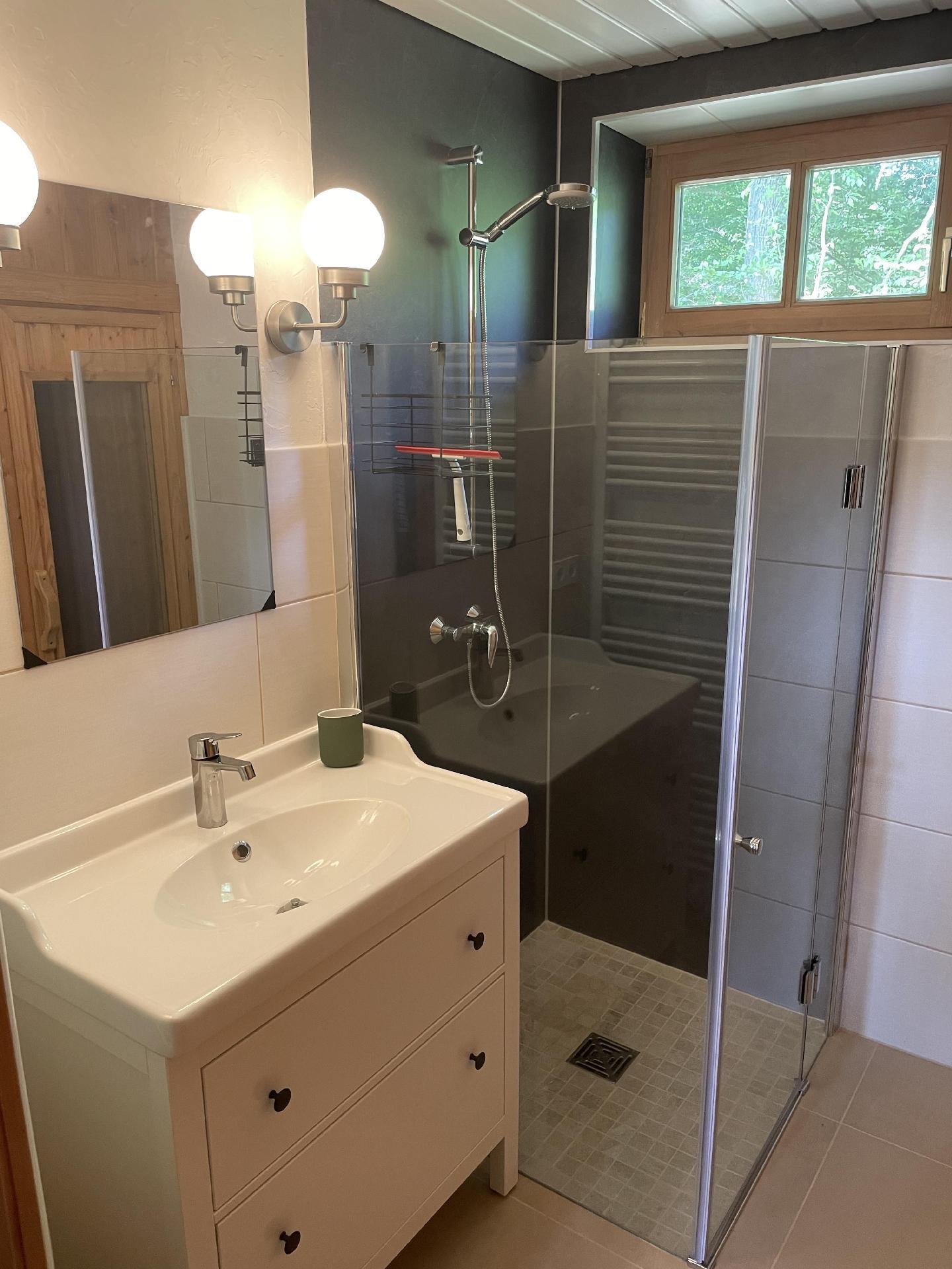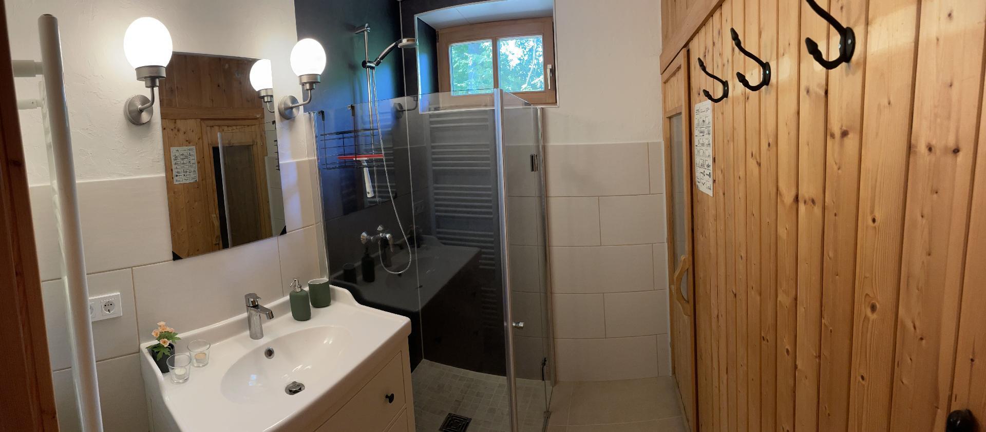 The ground floor has a very cosy and spacious living room with a fireplace stove, a rustic kitchen and dining corner, satellite TV, wireless Internet access and a stereo system. There is a very well-equipped kitchen with a dishwasher, fridge with freezer compartment, stove with oven, toaster, coffee machine and an electric mixer. The separate bedroom is furnished with a double bed (180 x 200cm) and there is also a little storage room. A child’s bed is available on request. The shower room with a private sauna with seating for four people provides a feeling of well-being. There is also a separate WC with a washbasin. The attic has a rustic living and sleeping room with cosy sloped ceilings paneled with wood, a sleeping corner with a double bed (180 x 200cm), a lounge corner with comfortable seating and another separate bedroom with two single beds (90 x 200cm), as well as a shower room with a WC. There is a shelf with interesting literature and board games. All the rooms have gas central heating and the living room, hallway, shower room an WC on the ground floor are fitted with under-floor heating.
