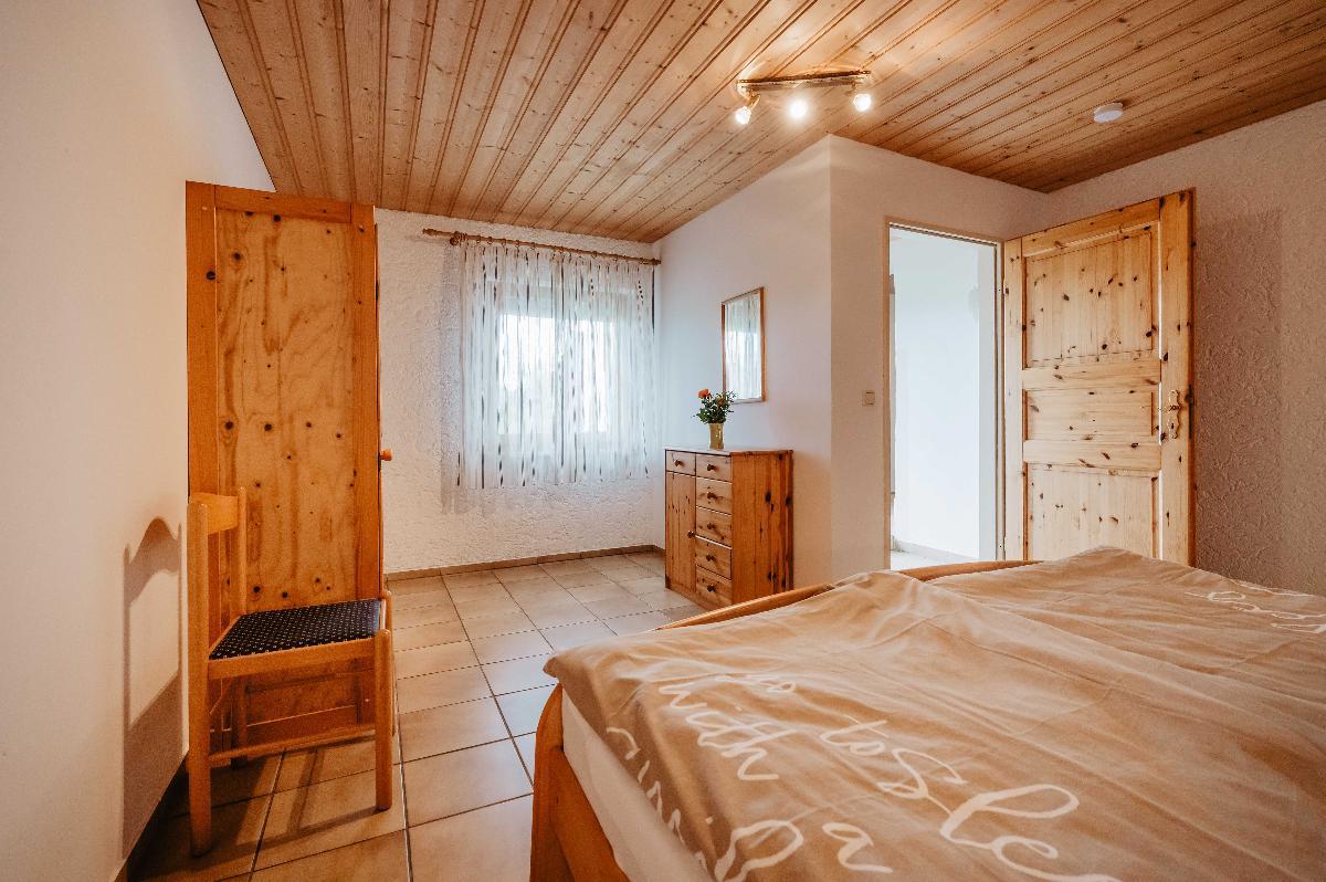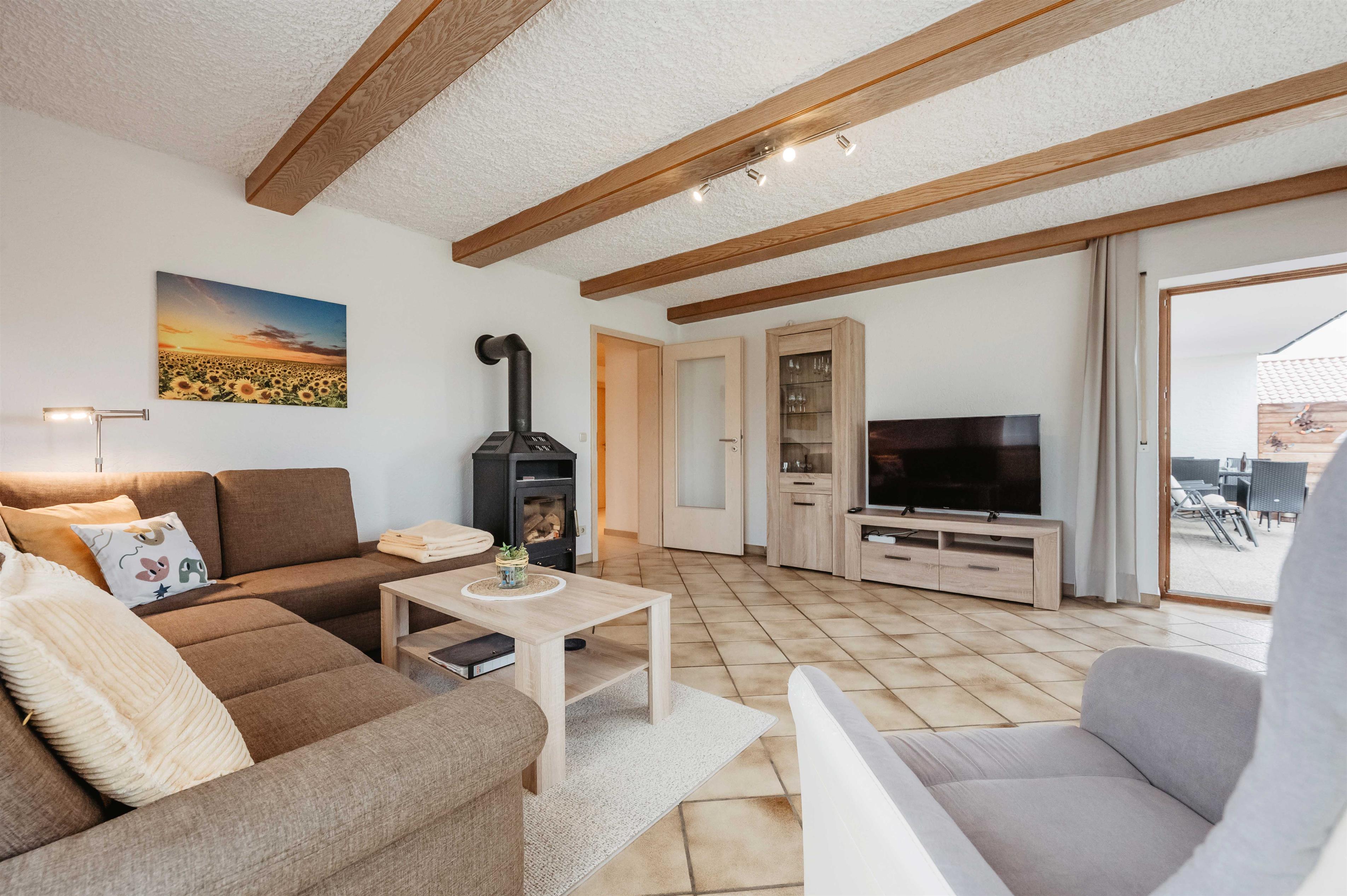 Familienfreundliche Ferienwohnung in ruhiger Lage am Ortsrand! Die geräumige Wohnung befindet sich im Erdgeschoss und verfügt über einen separaten Eingang. Das einladende Wohnzimmer ist ausgestattet mit einem wärmenden Kamin, einer bequemen Sitzgarnitur, Smart-TV und bietet Zugang zur möblierten Terrasse in Ost- und Südausrichtung. Zwei Schlafzimmer mit Doppelbetten sind vorhanden, und es gibt in jedem Raum Platz für ein zusätzliches Bett oder Kinderbett. Die Küche ist komplett eingerichtet mit einer Sitzgruppe, Geschirr, Wasserkocher, Kaffeevollautomat, Spülmaschine und einem Herd mit Backofen für gesellige Kochabende. Das Badezimmer ist mit einer Dusche/WC, Handtüchern und einem Hocker ausgestattet und bietet ausreichend Ablagefläche. Ein Trockenraum steht ebenfalls zur Verfügung. Besonders geschätzt wird der direkte Zugang zur großen Wiese und dem Spielplatz dazu gemütliche Sitzmöglichkeiten. Die Spielscheune mit Bibliothek, Tischtennis, Dart, Kicker Kasten sind bei bei jedem Wetter gefragt. Es gibt viel in der näheren und weiteren Umgebung zu entdecken.