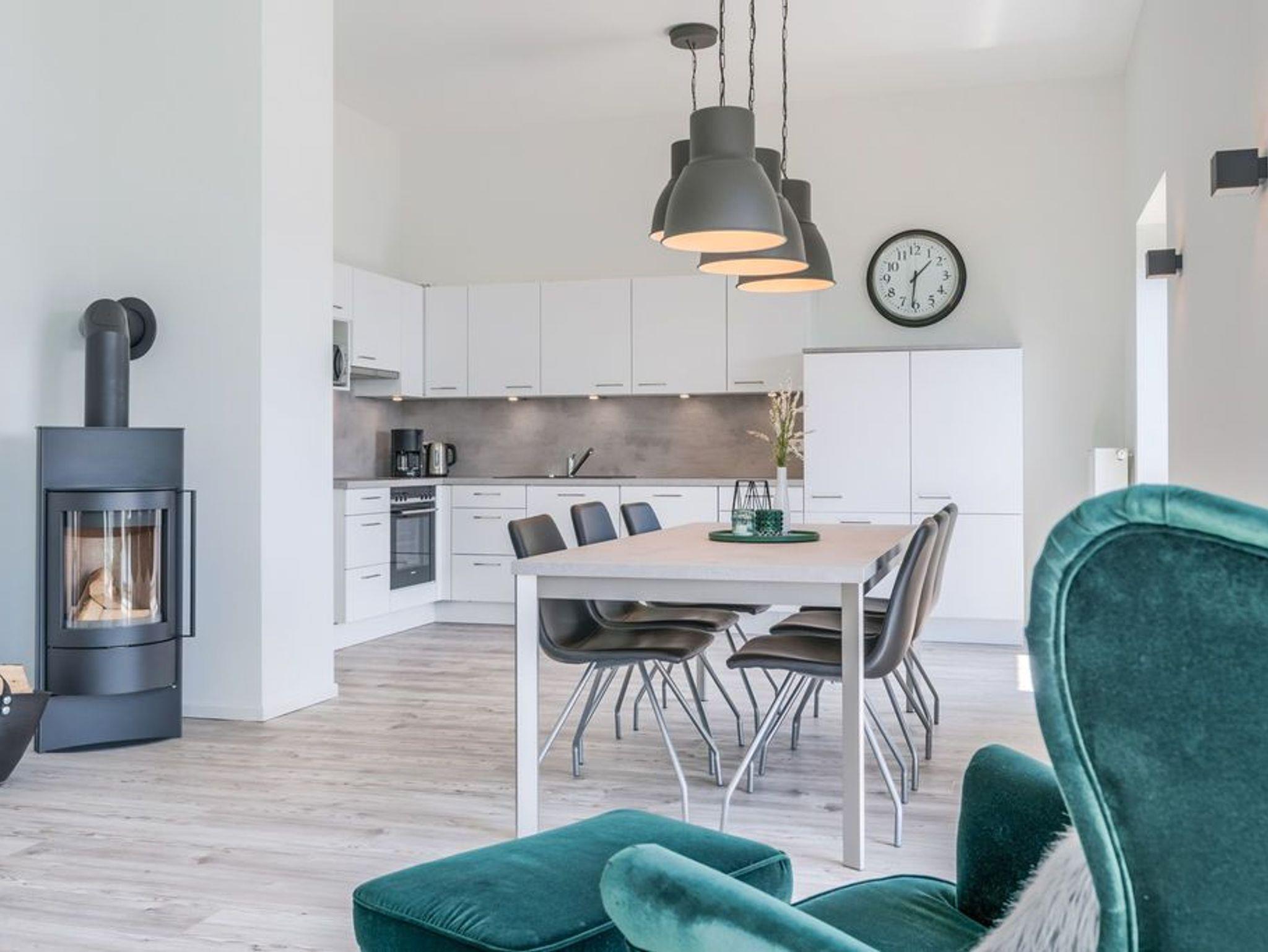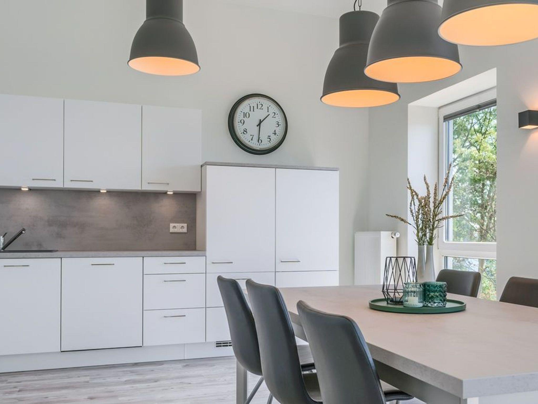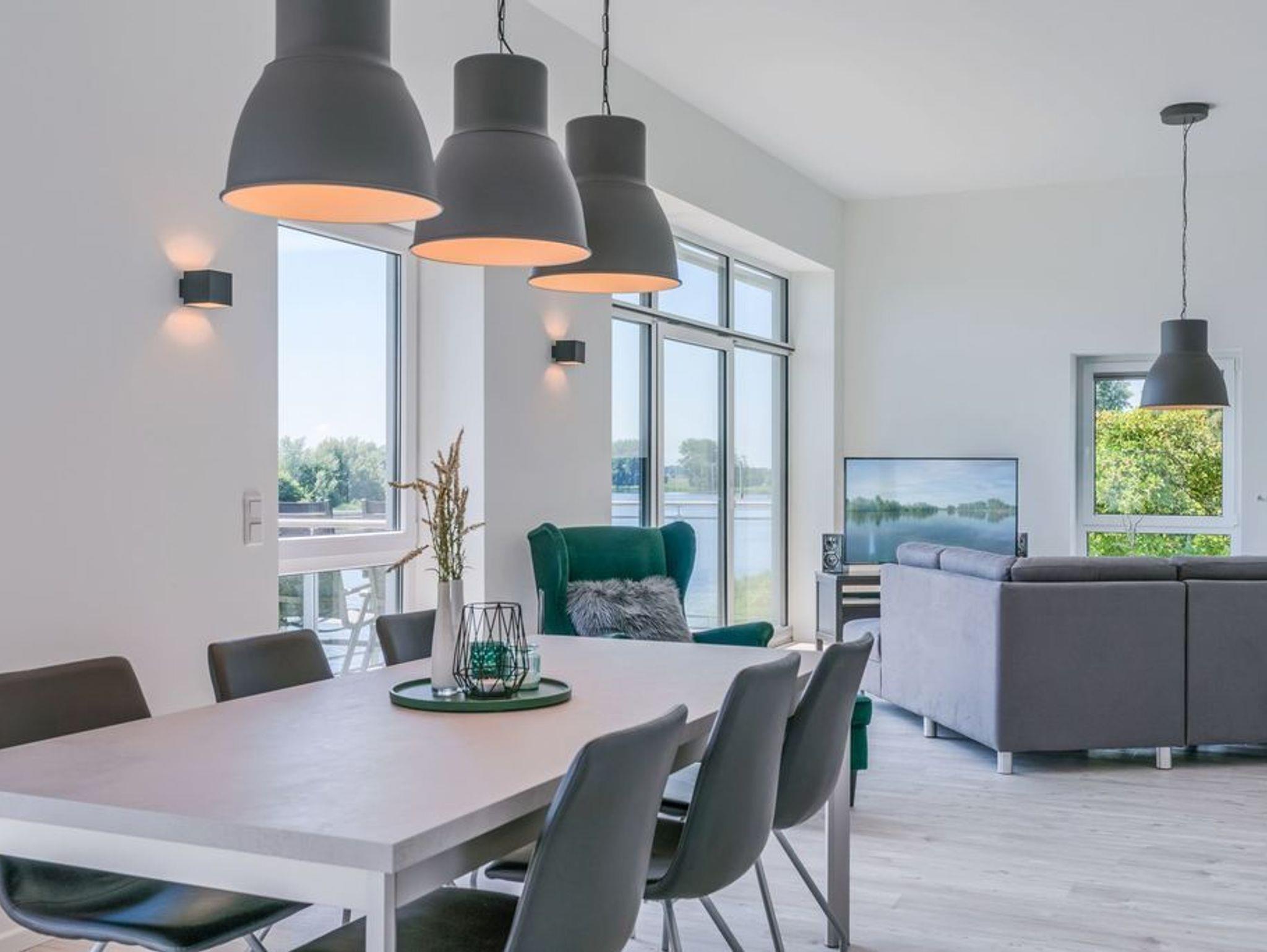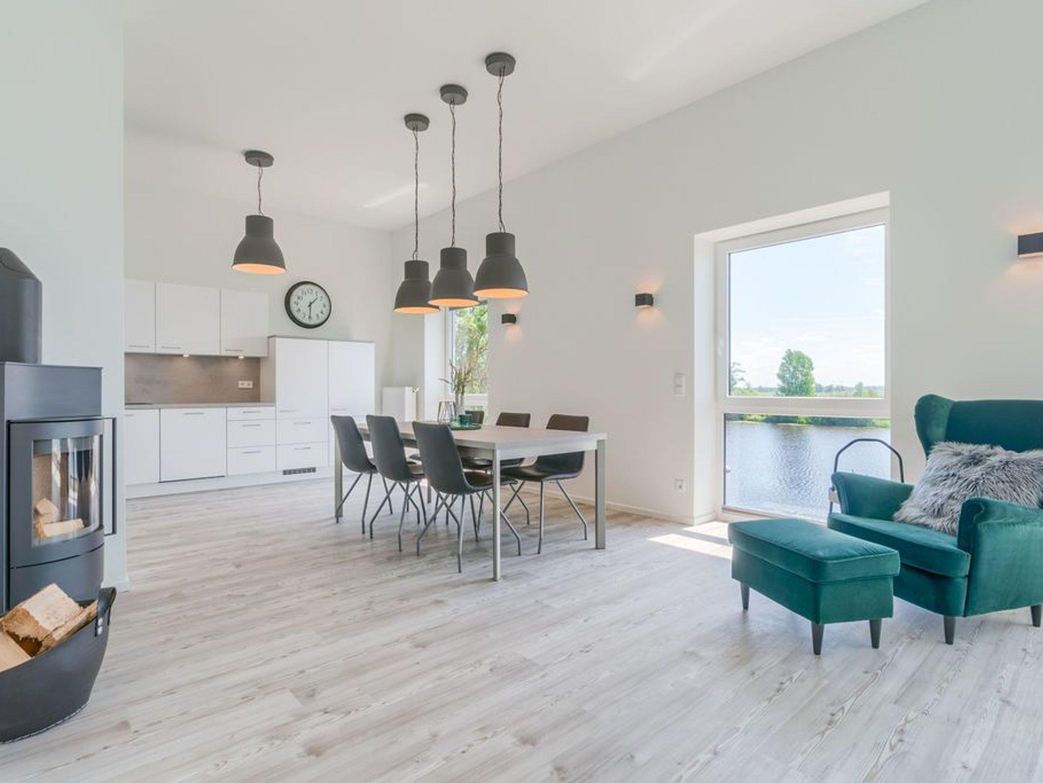 Der gemeinsame Wohn- und Essraum verfügt über eine komfortable Einbauküche mit Geschirrspüler, die alle Wünsche erfüllt. Am großen Esstisch finden Sie für 6 Personen ausreichend Platz. Hier können Sie gemeinsame Spieleabende und ausgedehnte Mahlzeiten verbringen, während Sie draußen auf der Eider die Boote entlang ziehen sehen.
