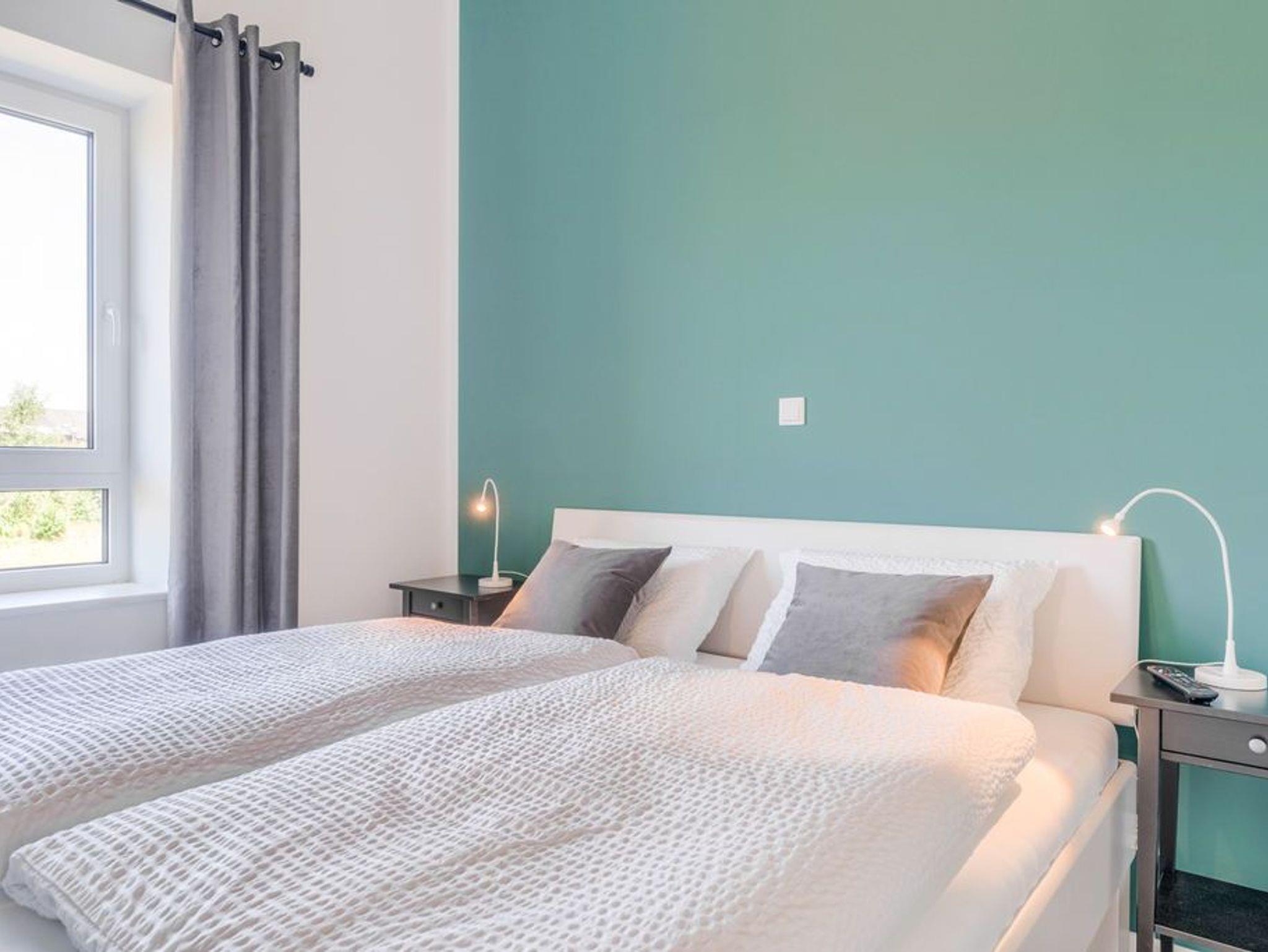 Ein besonderer Hingucker ist der zweite Schlafraum. Hier gibt das tiefe Odenwaldgrün der Wand den Ton an, das durch die hellen, freundlichen Möbel aufgelockert wird. In diesem Zimmer wird der Schlaf zum Traum.