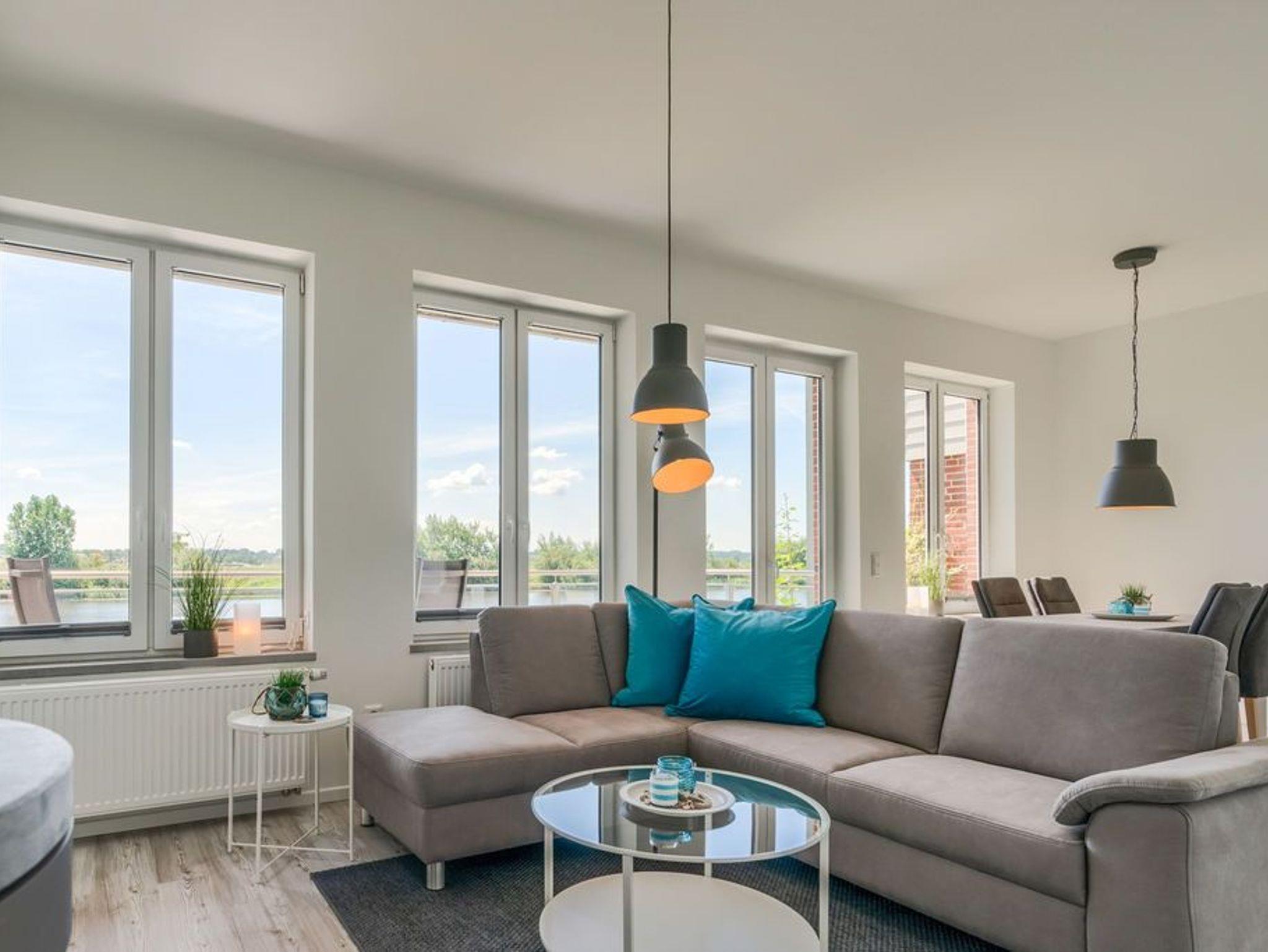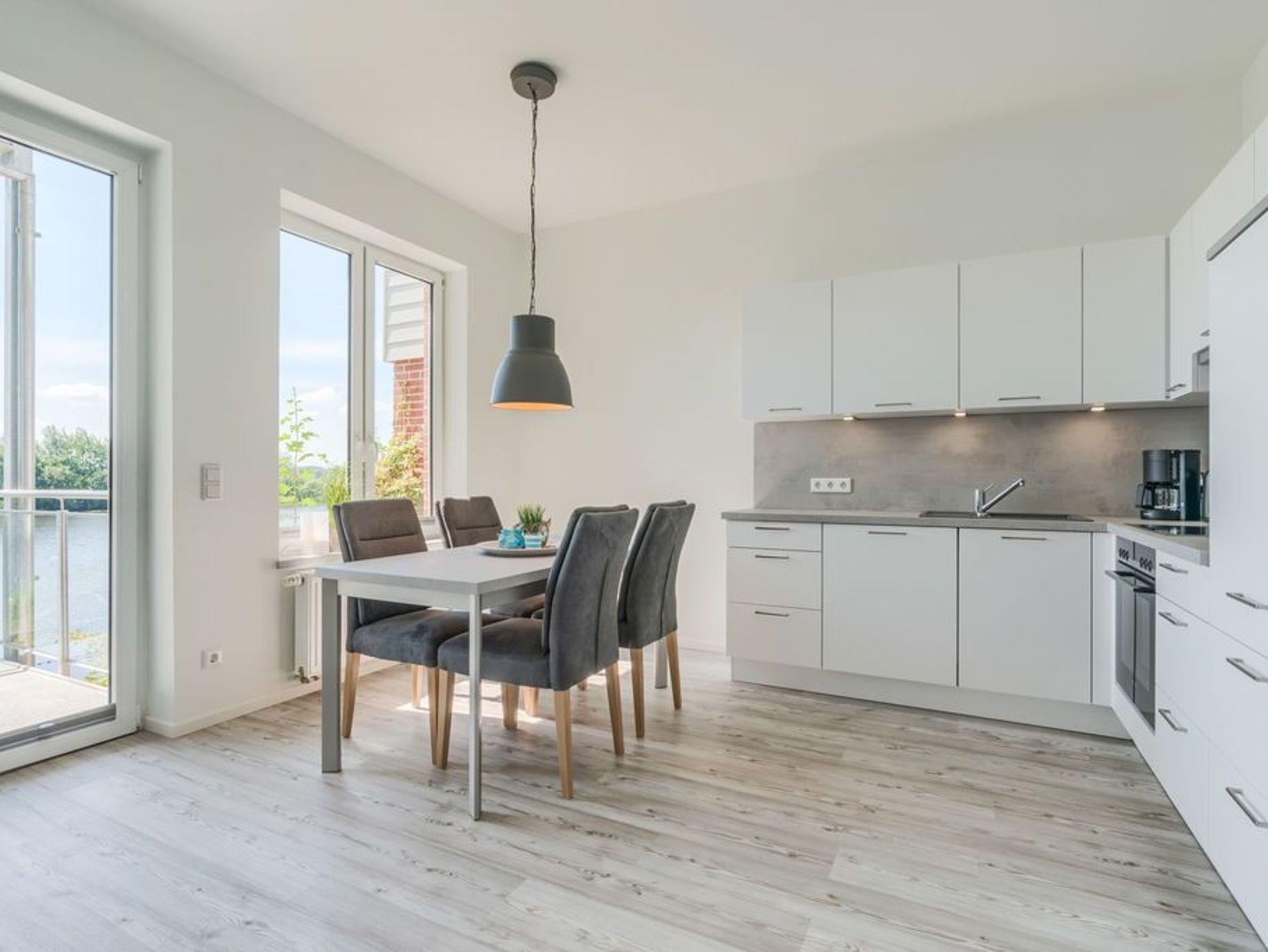 Durch einen hellen Vorflur gelangen Sie in den Wohnraum. Es erwartet Sie ein großzügig gestaltetes Wohnkonzept in hellen freundlichen Tönen und einer modernen Einbauküche. Hier wurde bei der Farb- und Möbelwahl konsequent auf eine dezent-schlichte Linie geachtet, so dass das Augenmerk ungestört auf die wunderschöne Natur der Eider gerichtet werden kann. Die vier großen Südfenster, die viel Licht und angenehme Wärme in die Wohnung lassen, bieten Ihnen hierfür einen wunderschönen Ausblick.