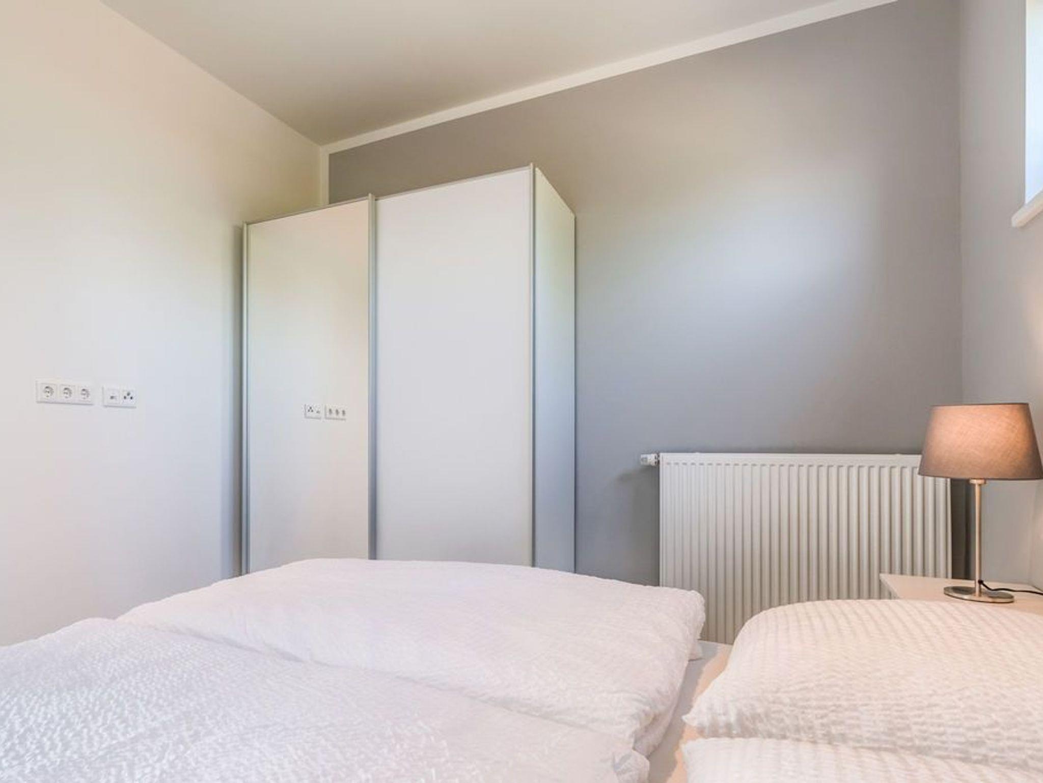 Im Schlafzimmer erwartet Sie ein frisch bezogenes Doppelkomfortbett. Das ruhige Grau der rückwärtigen Wände beruhigt die Sinne und lässt Sie entspannt in den Schlaf kommen.