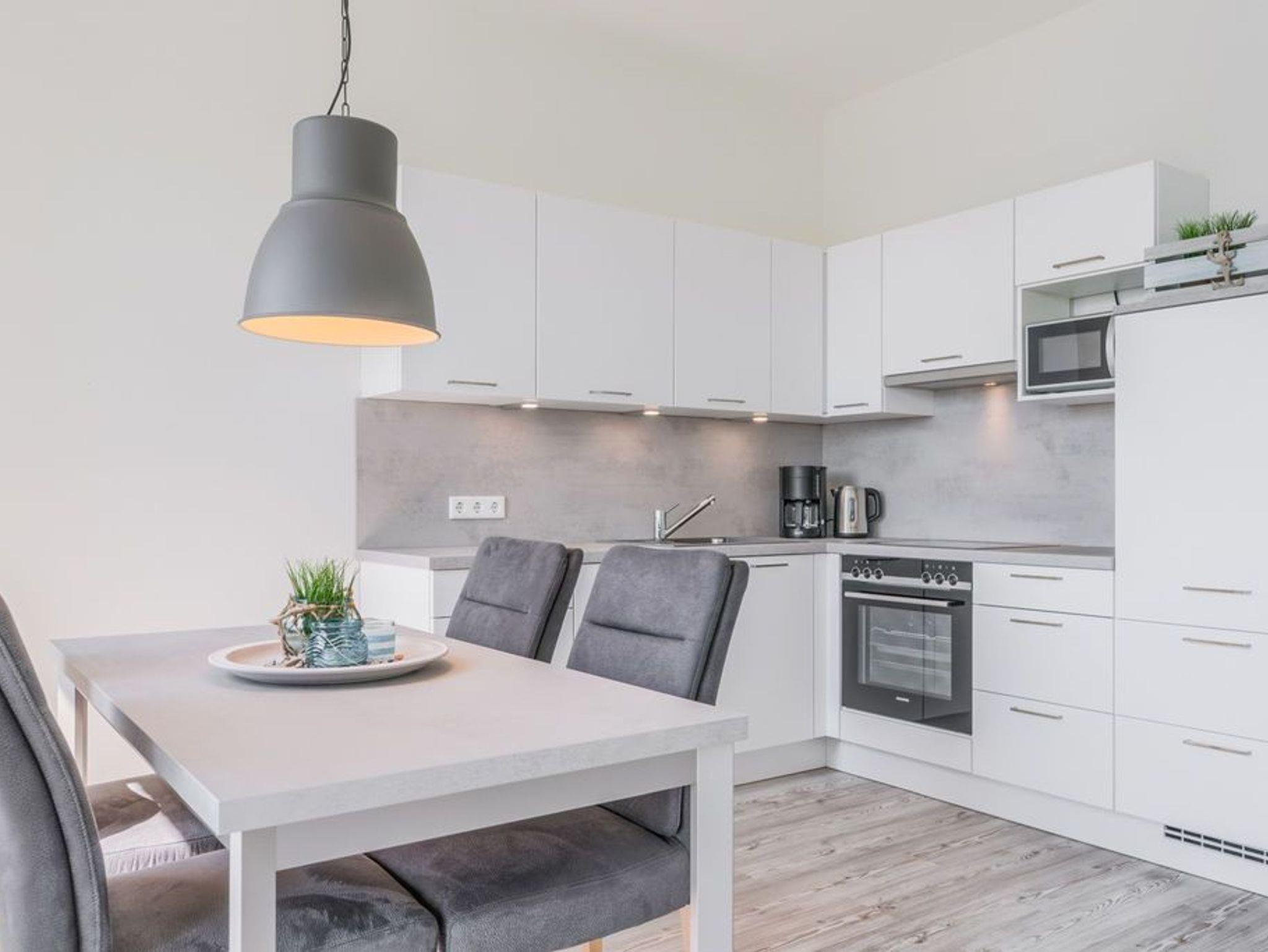 Eine hochwertige Einbauküche, die in den Wohnraum integriert ist, macht das Kochen zum Vergnügen. Die Eckküche ist so konzipiert, dass alle benötigten Utensilien mit wenigen Schritten erreicht werden können und selbstverständlich übernimmt die eingebaute Geschirrspülmaschine Ihren Abwasch.