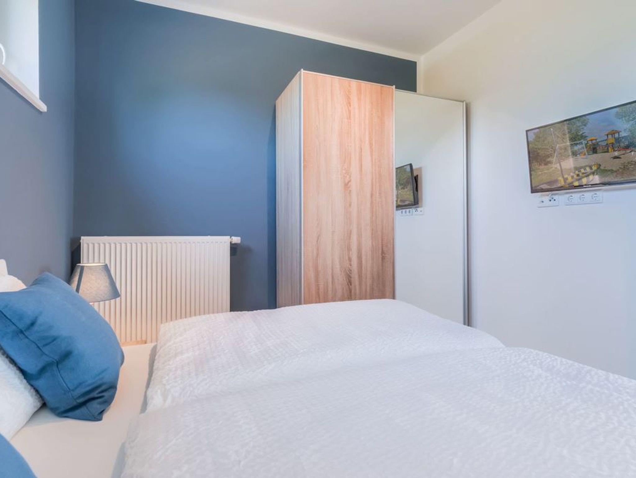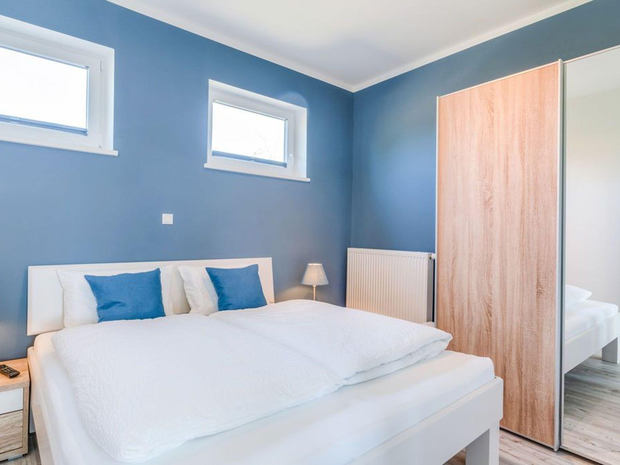 In den Schlafräumen bietet sich Ihnen ein ganz besonderes Raumerlebnis. Das tiefblaue Niagarablau an den rückwärtigen Wänden strahlt in beiden Zimmern angenehme Ruhe und zugleich Kraft aus. So können Sie in den frisch bezogenen Komfortbetten einen tiefen Schlaf finden und gestärkt in den neuen Tag gehen. Der[nbsp] Schlafraum mit Südlage kann aufgrund seiner Größe auch als zweiter Tages- und Spielraum dienen und Ihren Aufenthalt mit Kindern oder innerhalb einer Gruppe zusätzlich entspannen. In diesem Zimmer finden Sie außerdem ein breites Faltbett mit integriertem Lattenrost und Schlafmatratze für eine 5. Person, das Ihnen ebenso als Sofa dienen kann.
