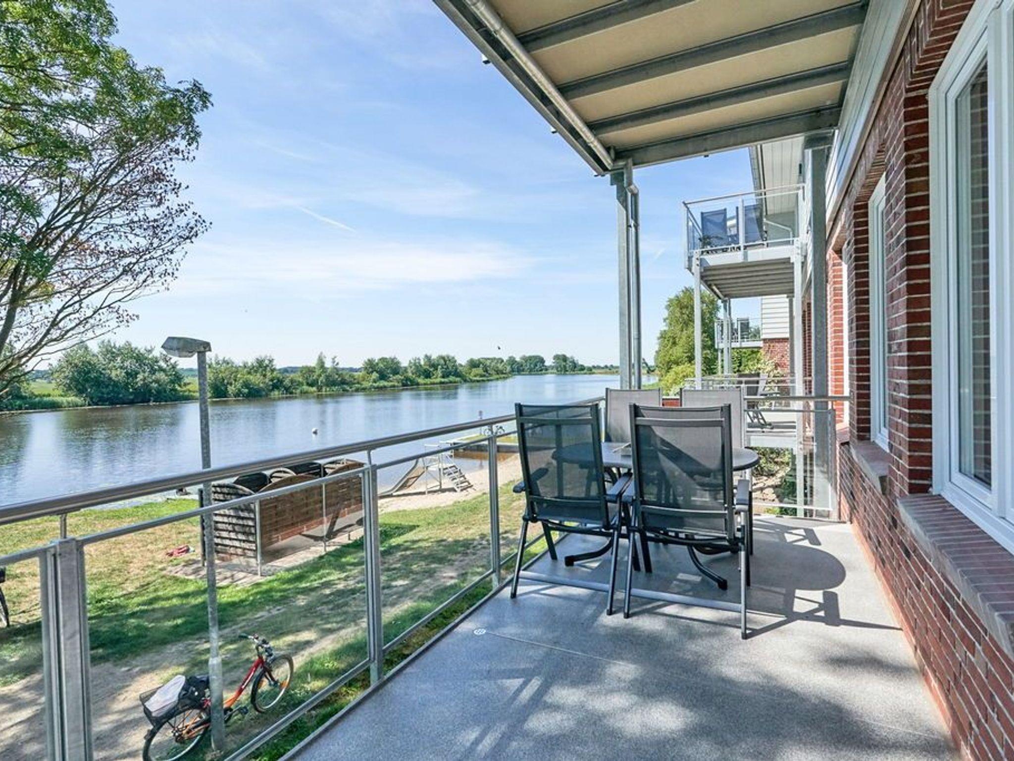 Der könnte sich auch auf dem geräumigen Südbalkon mit leichter Hanglage befinden. Dieser ist ausgestattet mit Tisch und bequemen Gartenstühlen. Eine Glasfront rund um den Balkon schützt vor kühlen Winden und bietet zugleich freien Blick auf die Eider.