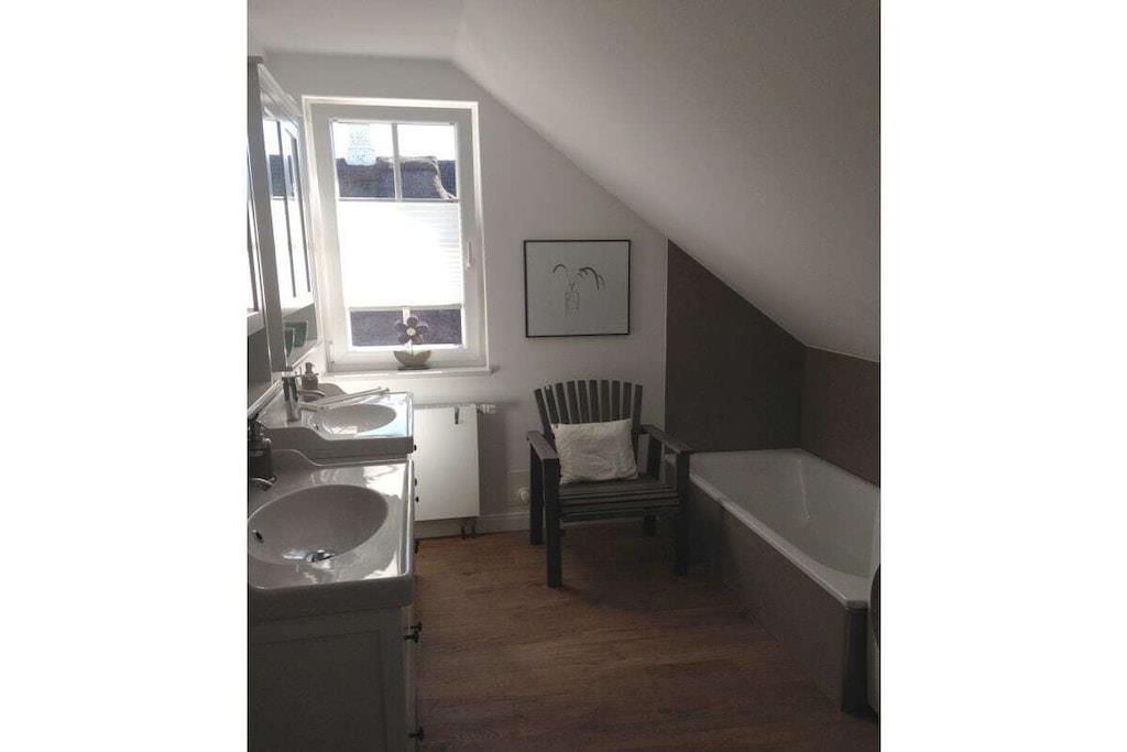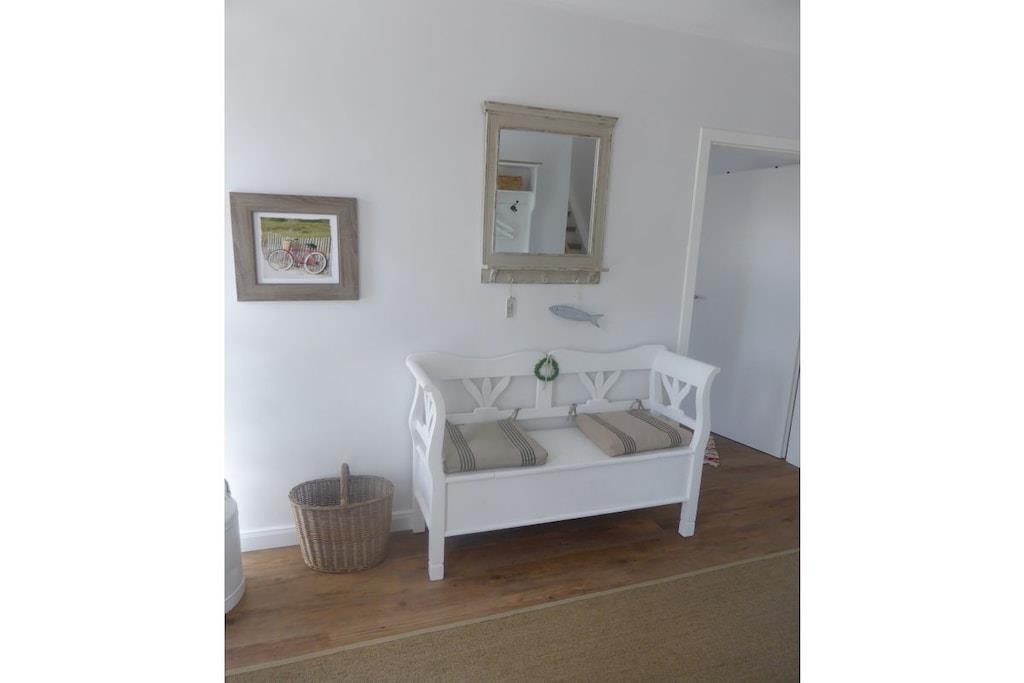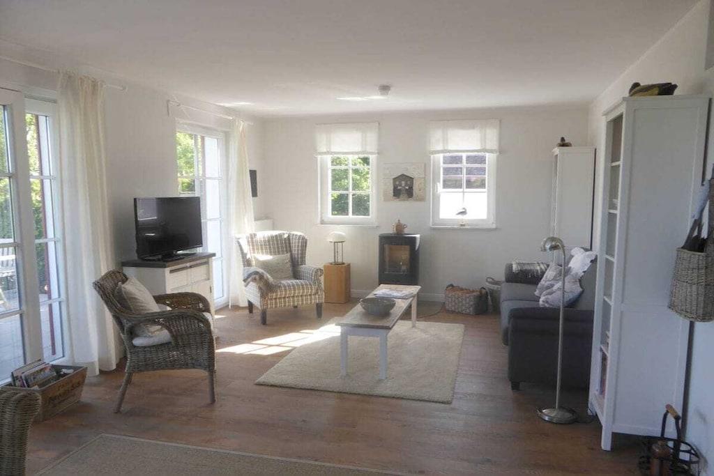 Stueetage: (Køkken(, kogeplade, ovn, opvaskemaskine , køleskab, fryser, insektnet), stue / spisestue(, , bibliotek, Fjernsyn, spisebord, kakkelovn, insektnet), soveværelse(, enkeltseng, enkeltseng, insektnet), badeværelse(, toilet, bruser, håndvask, varme)) På 1. etage: (Stue(, , bibliotek, Fjernsyn, insektnet), soveværelse(, dobbeltseng, insektnet), badeværelse(, toilet, badekar, bruser, håndvask, vaskemaskine, varme, føntørrer)) , , , soveværelse(, enkeltseng, enkeltseng, insektnet), Internetadgang, tørretumbler, vaskemaskine, balkon, varme, terrasse(, Grill center, Strand, grill, grill, havemøbler, solstole), have(Grill center, Græsplæne, havemøbler, solstole, Haveskur), parkering, cykler til rådighed, strygebræt, strygejern, tørreskab, Vaskeripakke mod et gebyr