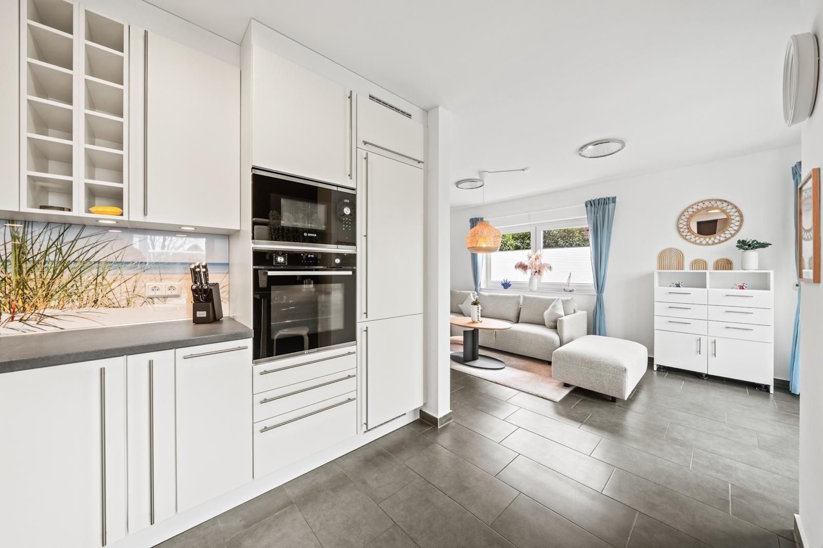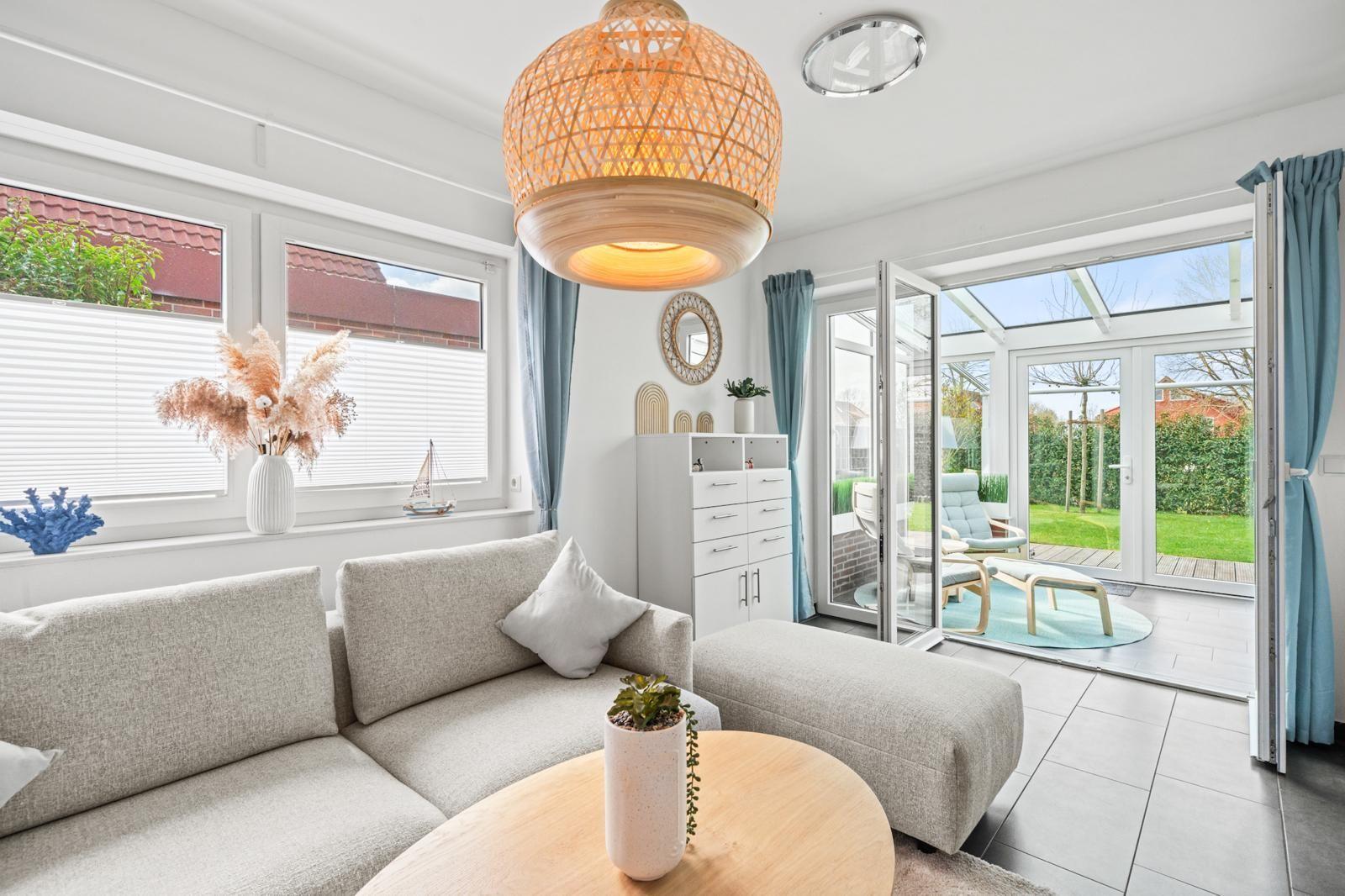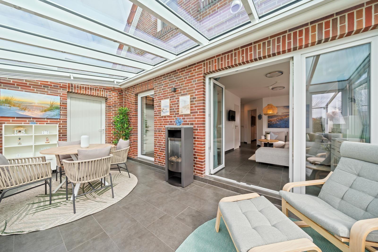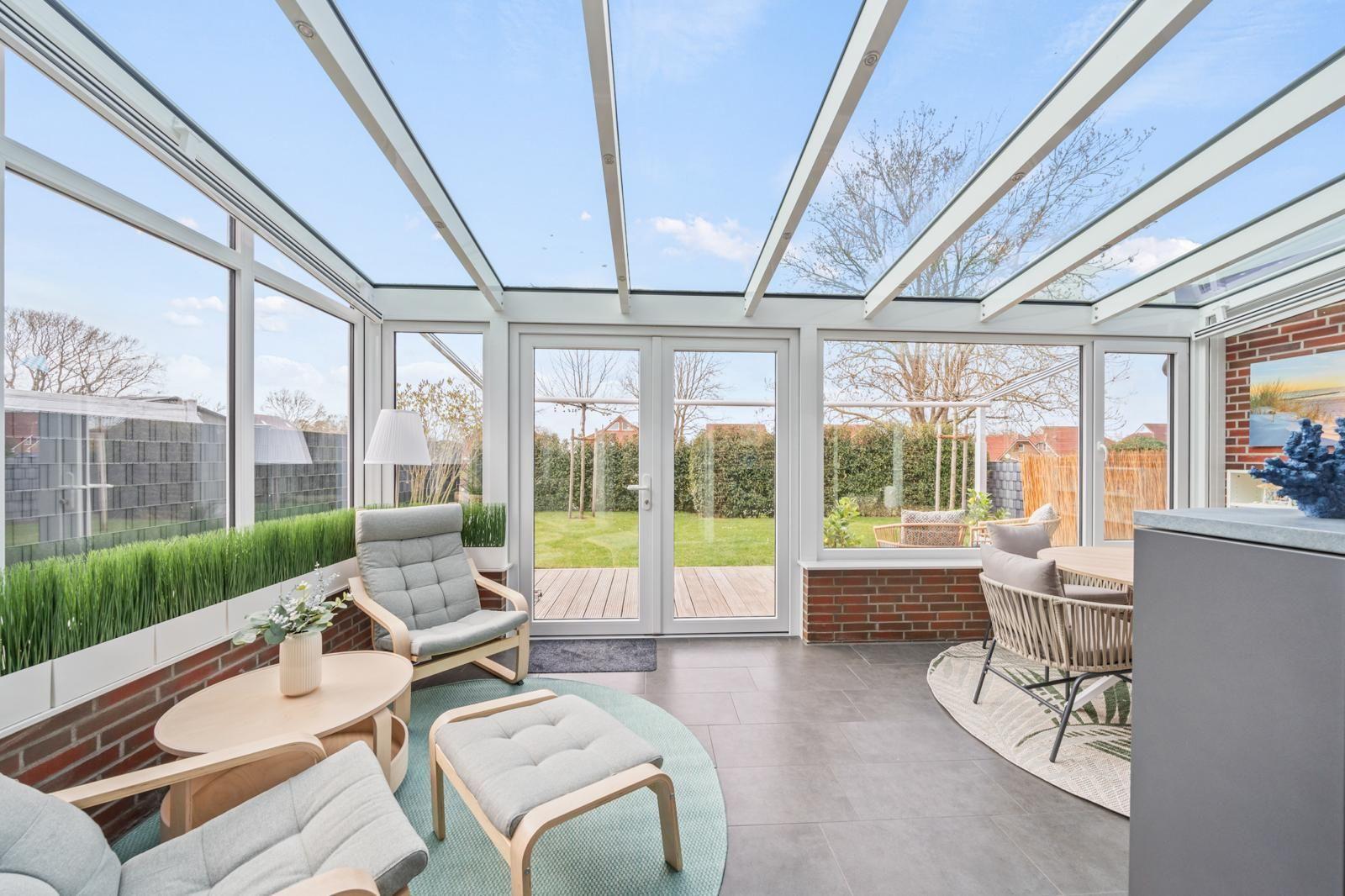 The interior of the 105 m² holiday home offers a modern yet cosy ambience. Two bedrooms and two bathrooms ensure plenty of privacy, while the well-equipped kitchen leaves nothing to be desired. A particular highlight is the cosy living area, which flows seamlessly into a conservatory and the adjoining terrace, creating an inviting space for relaxing and socialising.