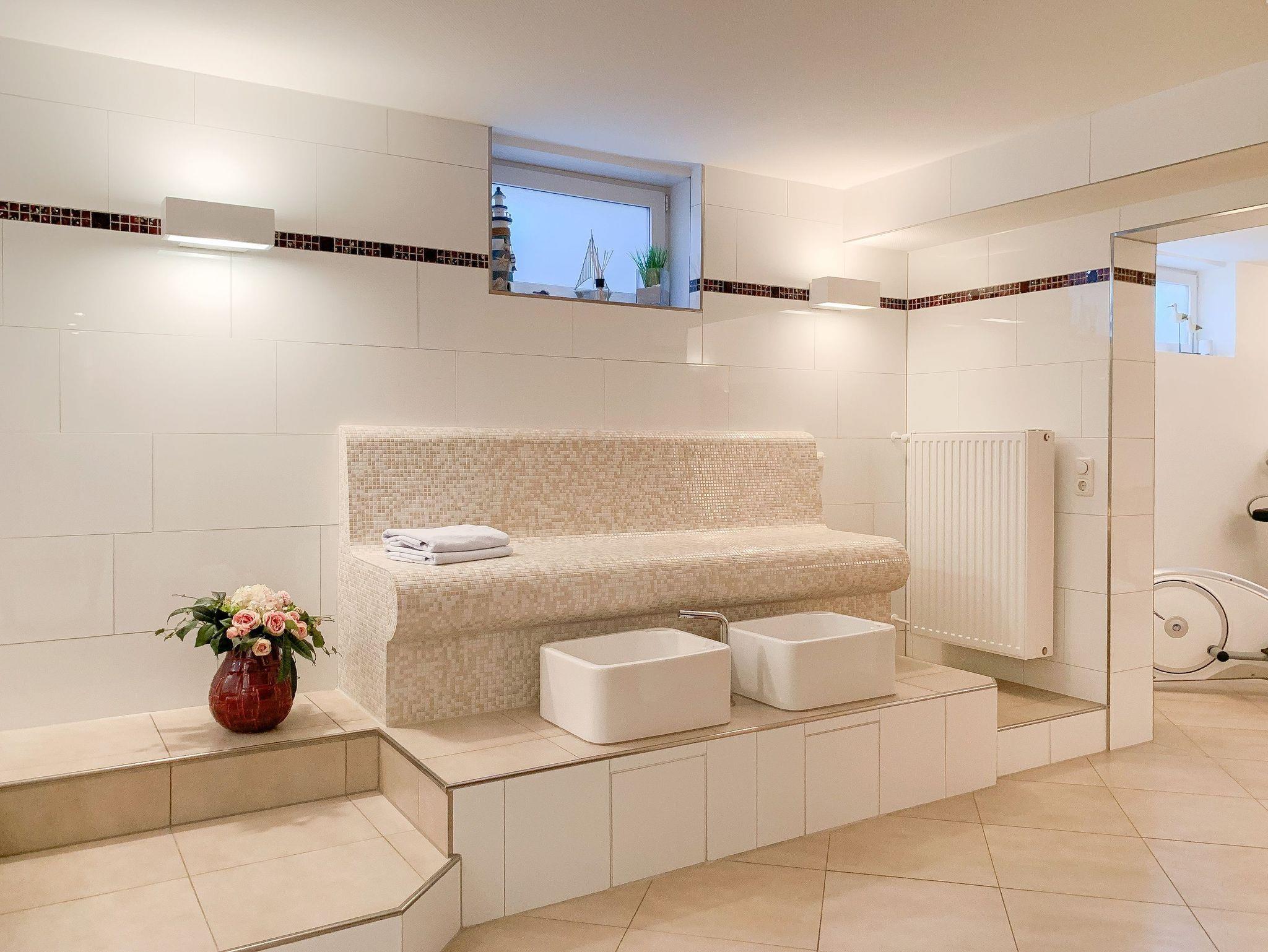 Mit dem hauseigenen Fahrstuhl erreichen Sie bequem den großzügigen Wellnessbereich mit Sauna(Münzbetrieb), Tauchbecken, Dusche, Crosstrainer und Kicker, der im Untergeschoss des Hauses untergebracht ist und den Gästen zur gemeinschaftlichen Nutzung zur Verfügung steht. Waschmaschine und Trockner (Münzgeräte) sind ebenfalls auf dieser Ebene untergebracht.