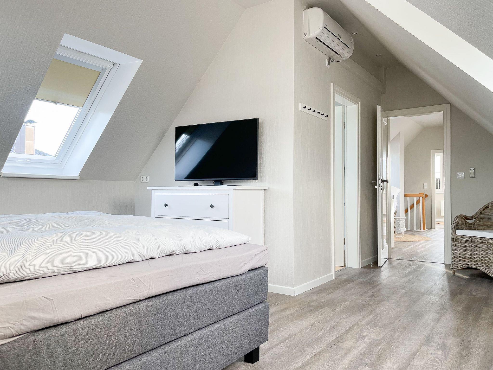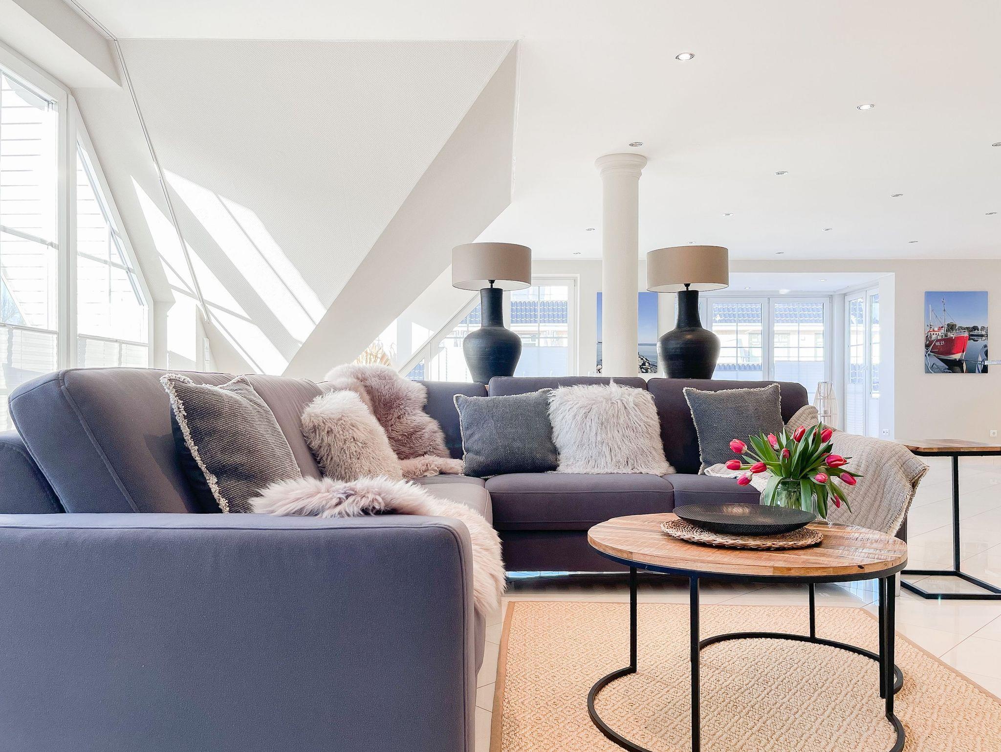 Es erwarten Sie lichtdurchflutete, unglaublich großzügige Räumlichkeiten auf über 180 qm Wohnfläche, die sich über 2 Ebenen erstrecken und bequem mit dem Fahrstuhl bis direkt in die Wohnung zu erreichen sind. Im überaus weitläufigen Wohn- Essbereich mit hochwertiger Sofalandschaft, einem riesigen Essbereich und offener Einbauküche, spielt sich alles Leben ab. Im Erker steht ein gemütlicher Sessel zum relaxen, lesen oder um einfach die Aussicht auf das bunte Treiben zu genießen. Der Kamin sorgt[nbsp] im Winter für heimelige Abende und die Klimaanlage im Sommer für angenehme Temperaturen. 3 Balkone rund um das Penthouse bieten sowohl sonnige als auch schattige Plätze von früh bis spät. Das Master Schlafzimmer ist ebenfalls äußerst großzügig bemessen und mit einem Boxspringbett (180x200), Klimaanlage und Einbauschränken ausgestattet, die reichlich Stauraum für Ihre Urlaubsgarderobe bieten. Das Masterbad ist vom Schlafzimmer zu begehen und verfügt über eine Dusche, Badewanne, Waschtisch, WC und weitere Einbauchränke. Ein separates Gäste WC ist vom Wohnbereich zu erreichen. Auf der zweiten Wohnebene befindet sich das zweite Schlafzimmer, ebenfalls mit einem Boxspringbett (180x200), Klimaanlage und Duschbad ensuite und TV, ein Wohnbereich mit Sofa, Kleiderschrank und Pantry mit Kühlschrank sowie das dritte Schlafzimmer mit 2 Einzelbetten. Alle Schlafzimmer sind mit Verdunkelungsplissees ausgestattet.