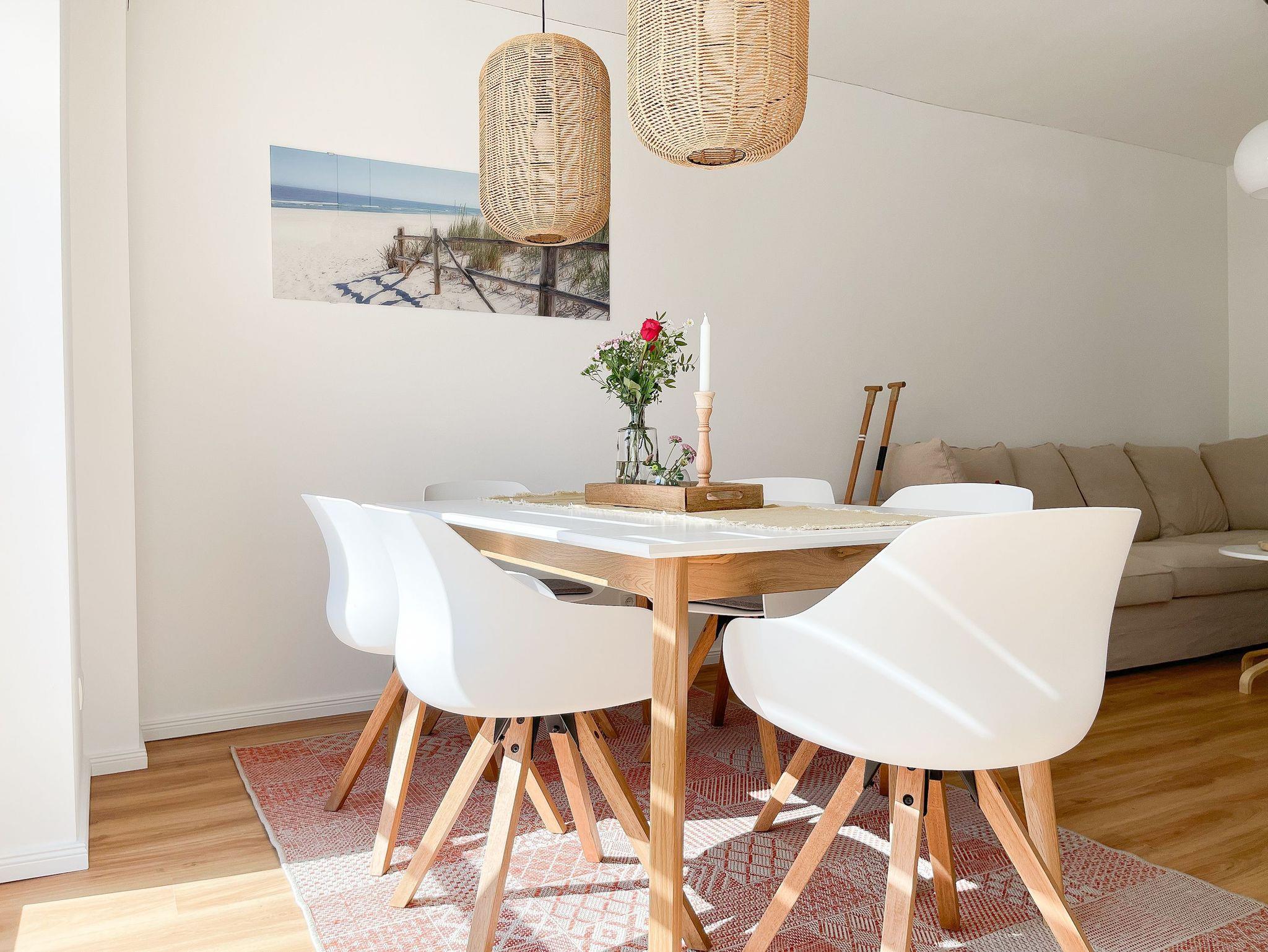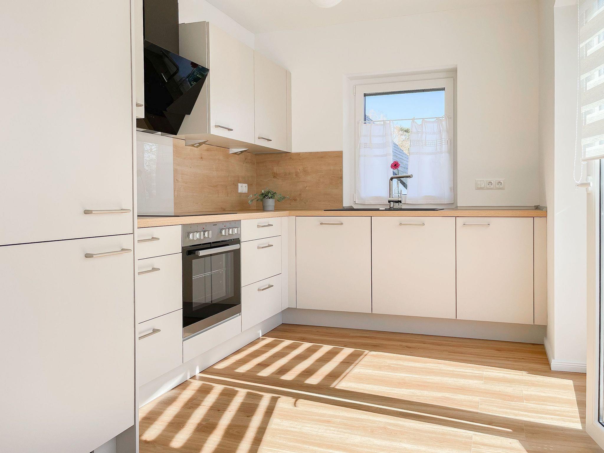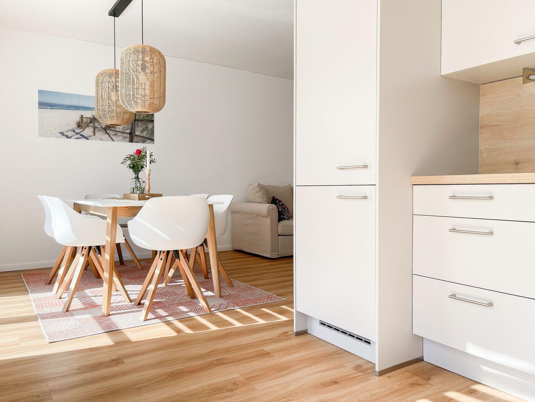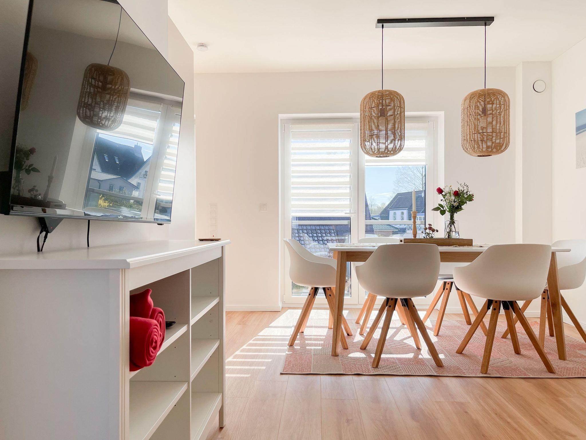 Es erwartet Sie eine wunderschöne Ferienwohnung, die Gemütlichkeit und Wohlbefinden vermittelt. Warme Farben, viel Licht und ein durchdachtes Raumkonzept schaffen eine ganz besondere Atmosphäre und eine Lüftungsanlage sorgt durch permanenten Frischluft Austausch für eine gute Luftqualität in allen Räumen. Sämtliche Fenster sind mit elektrischen Außenjalousien versehen und die Fußbodenheizung sorgt für angenehme Wärme.[nbsp] Der Wohnbereich ist mit einem gemütlichen Ecksofa mit Schlaffunktion und TV ausgestattet. Der anschließende Essbereich bietet ausreichend Platz für 6 Personen und fügt sich harmonisch in die bestens ausgestattete Wohnküche ein. Der vorgelagerte kleine Südbalkon verfügt über 2 Gartensessel, einen kleinen Tisch und 2 weitere Gartenstühle. Es gibt 2 Schlafzimmer, die mit Doppelbetten und Kleiderschränken ausgestattet sind, eines der beiden mit einem zusätzlichen TV. Neben dem modernen Bad mit Waschtisch, WC, Walk In Dusche und Fenster, gibt es ein zusätzliches Gäste WC. WLAN steht selbstverständlich kostenlos zur Verfügung. Die Waschmaschine ist in einem separaten Abstellraum innerhalb der Wohnung untergebracht.
