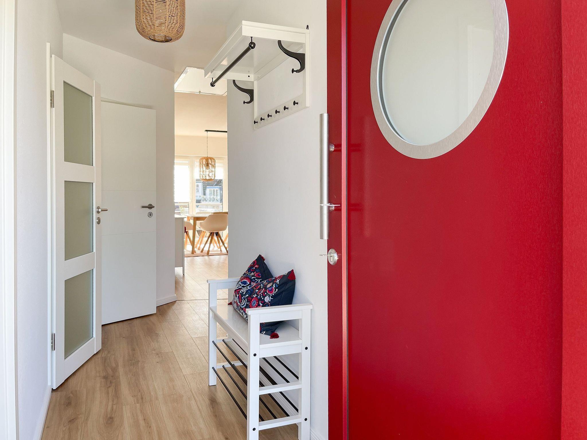 Über eine Außentreppe gelangt man zum privaten Eingang der Ferienwohnung. Ein Parkplatz befindet sich auf dem Grundstück direkt am Haus.