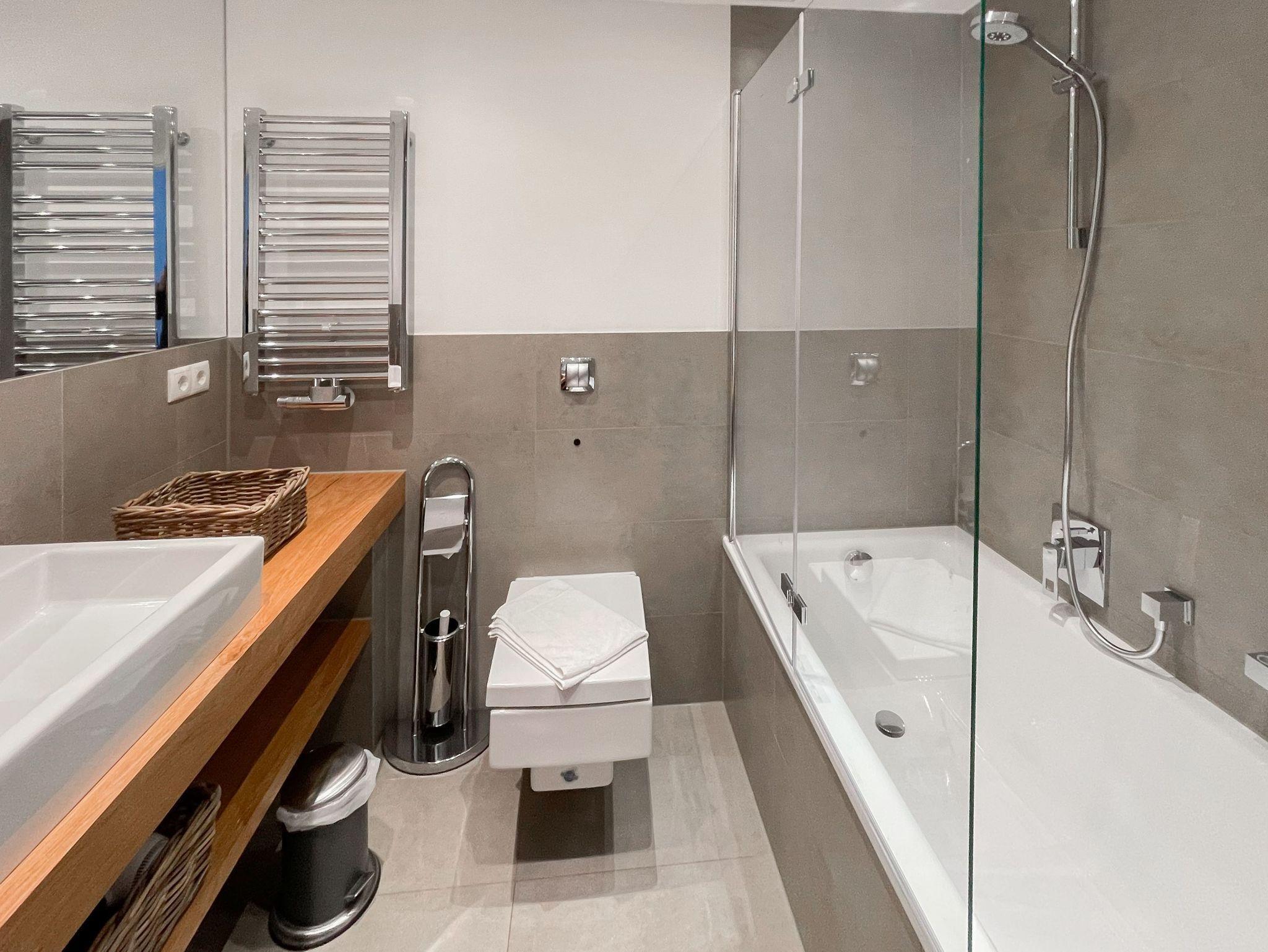 Die großzügige Eckwohnung bietet[nbsp] mit 2 Schlafzimmern und 2 Bädern auf 120 qm höchsten Wohnkomfort für 4 Personen, um einen entspannten Urlaub zu verleben. Der umlaufende Sonnenbalkon ist sowohl vom Wohnbereich als auch von den [nbsp]beiden Schlafzimmern zugänglich. Genießen Sie tagsüber das sensationelle Meerblickpanorama aus nahezu jedem Raum und bei Dunkelheit die besondere Atmosphäre der beleuchteten Lübecker Bucht. Es steht ein großzügiges[nbsp] Wohnzimmer mit anschließendem Essbereich für 4 Personen zur Verfügung. In der offenen, bestens ausgestatteten Designküche mit Induktionskochfeld, Mikrowelle und Spülmaschine, ist ebenfalls eine Waschmaschine untergebracht. Die beiden Schlafzimmer sind jeweils mit einem Doppelbett (180x200 und 160x200) und TV ausgestattet. Die Fenster sind mit Verdunkelungsvorhängen versehen. Zwei neue, hochwertige Bäder, eines mit Dusche und eines mit Badewanne, runden das Angebot ab. Ein fester PKW Stellplatz in der Hotelgarage (Einfahrtshöhe 1,90/kein Aufzug) ist[nbsp] inklusive. Bei Verlust der Parkkarte ist Ersatz zu leisten.