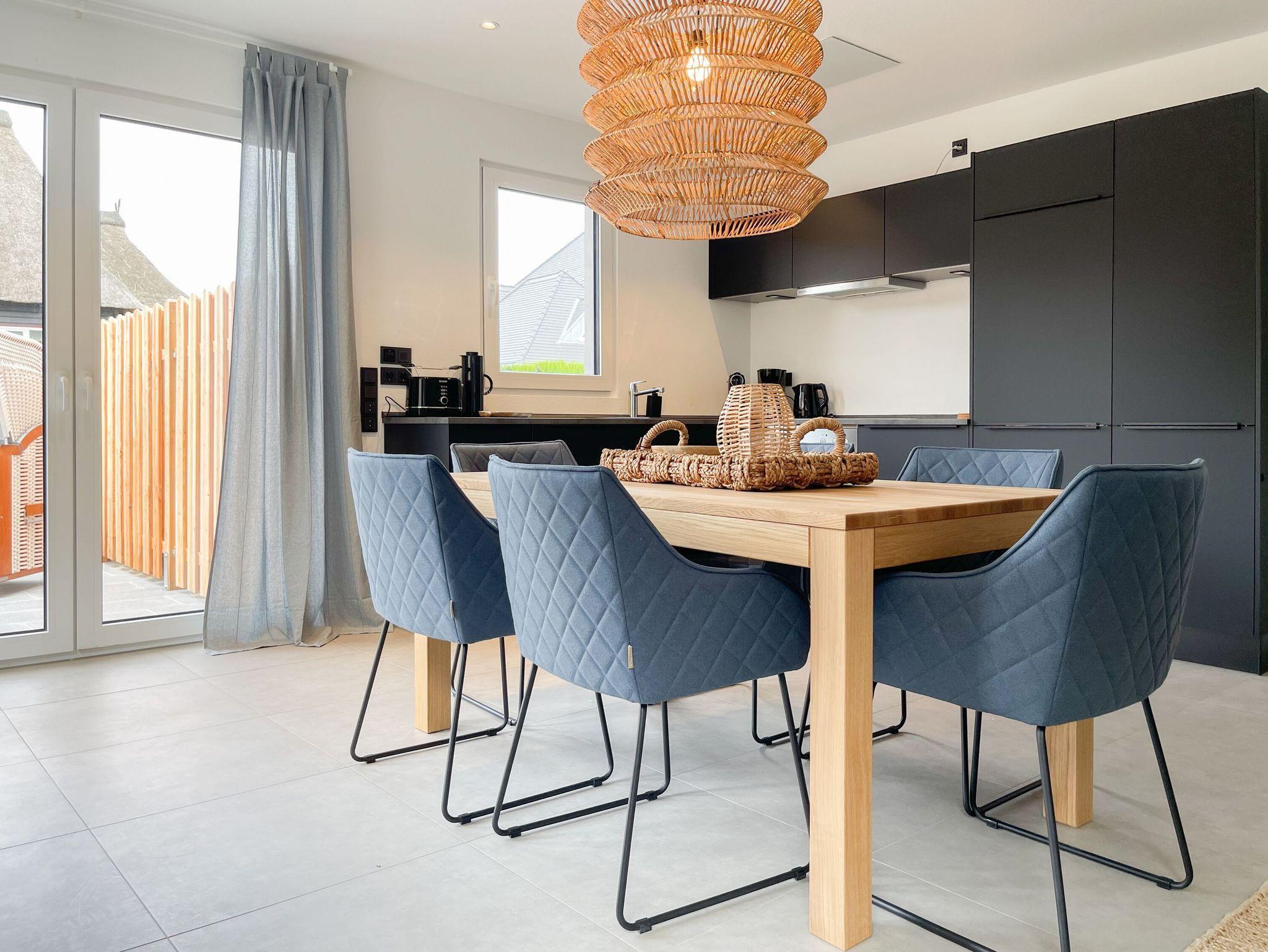 Es erwartet Sie eine wunderschönes Ferienhaus im skandinavischen Stil. Sonnige Räumlichkeiten und die äußerst hochwertige Einrichtung garantieren einen hohen Wohnstandard in einem schönen Ambiente. Mit 4 Schlafzimmern, einem exklusiven Bad mit Walk In Dusche, Radio und Sauna sowie einem zusätzlichen Gäste WC, bietet das Hygge Hus auf über 100 qm Wohnfläche ausreichend Raum für 5 Personen, um einen erholsamen Ostseeurlaub in Strandnähe zu verleben. Im Erdgeschoss erwartet Sie ein lichtdurchfluteter Wohn- Essbereich, großzügig geschnitten und hochwertig möbliert. Die integrierte Einbauküche in perfekter Ausstattung eignet sich hervorragend für gemeinsames Kochen. Die vorgelagerte Terrasse in Südwestausrichtung ist mit Gartenmöbeln und einem Strandkorb ausgestattet. Im Eingangsbereich befindet sich die Garderobe und ein modernes Gäste WC mit Fenster. Im Obergeschoss gibt es zwei separate Schlafzimmer mit Boxspringbetten (180x200 und 120x200), TV und Kleiderschrank. Das hochwertige Wellnessbad mit großzügiger Walk-In Dusche und integrierter Sauna befindet sich ebenfalls im Obergeschoss. Die Schlafzimmer 3 und 4 befinden sich im Dachgeschoss und sind jeweils mit Boxspringbetten (120x200) und Kommode eingerichtet. Alle Fenster sind mit elektrischen Außenjalousien versehren, außer[nbsp] 1 Schlafzimmer im Dachgeschoss, das mit Verdunkelungsplissees ausgestattet ist. Waschmaschine und Trockner sind im separaten Technikraum neben der Terrasse untergebracht.