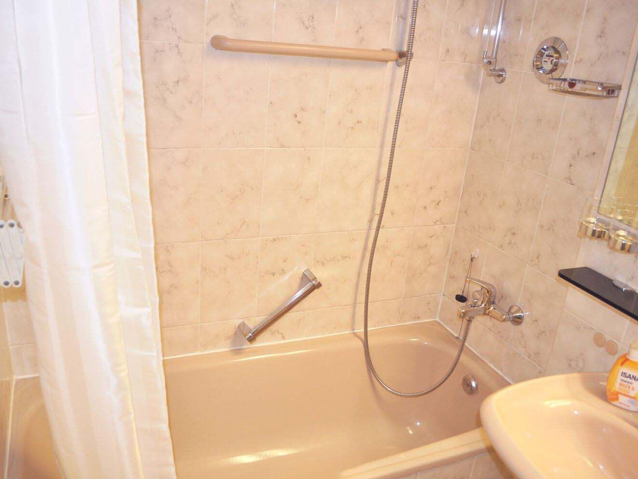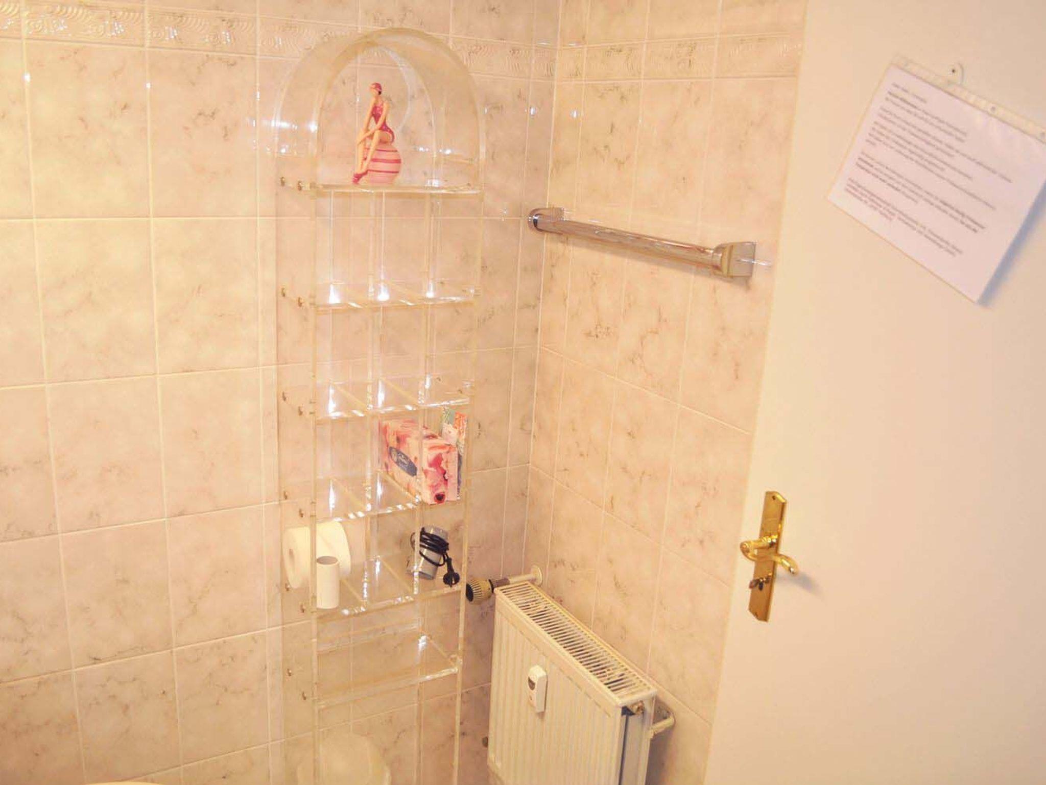 Bad 1: Badewanne, Fön, Regal, Spiegel, Waschbecken, WC